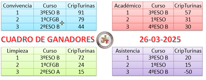 Los/as delegados/as de alumnos/as de los grupos ganadores deberán recoger sus CripTurinas en el Departamento de Convivencia.
