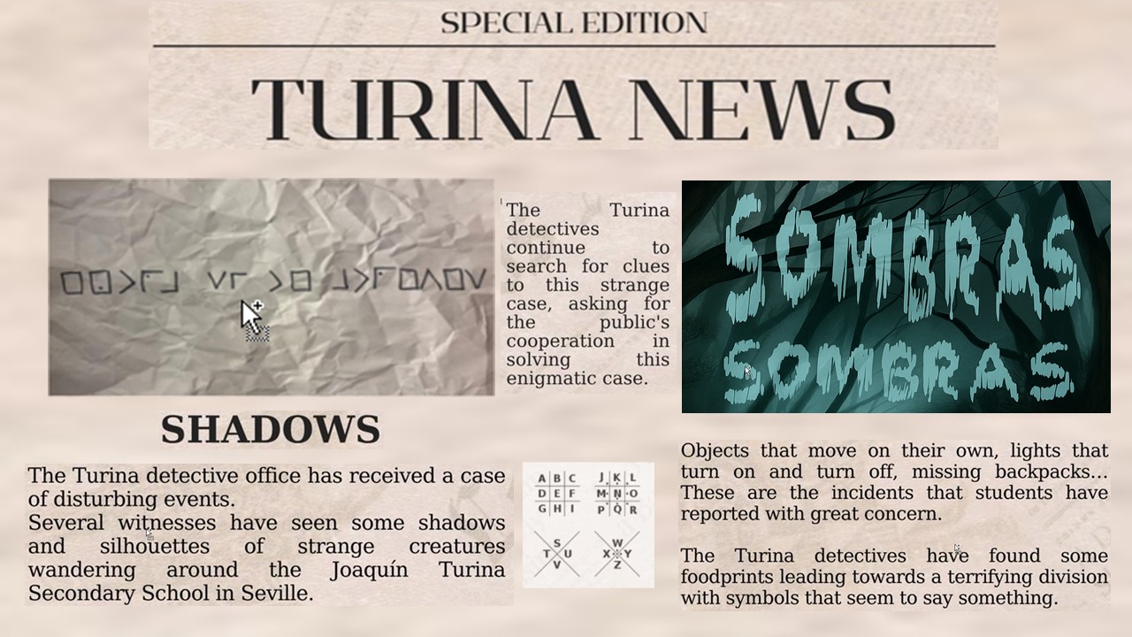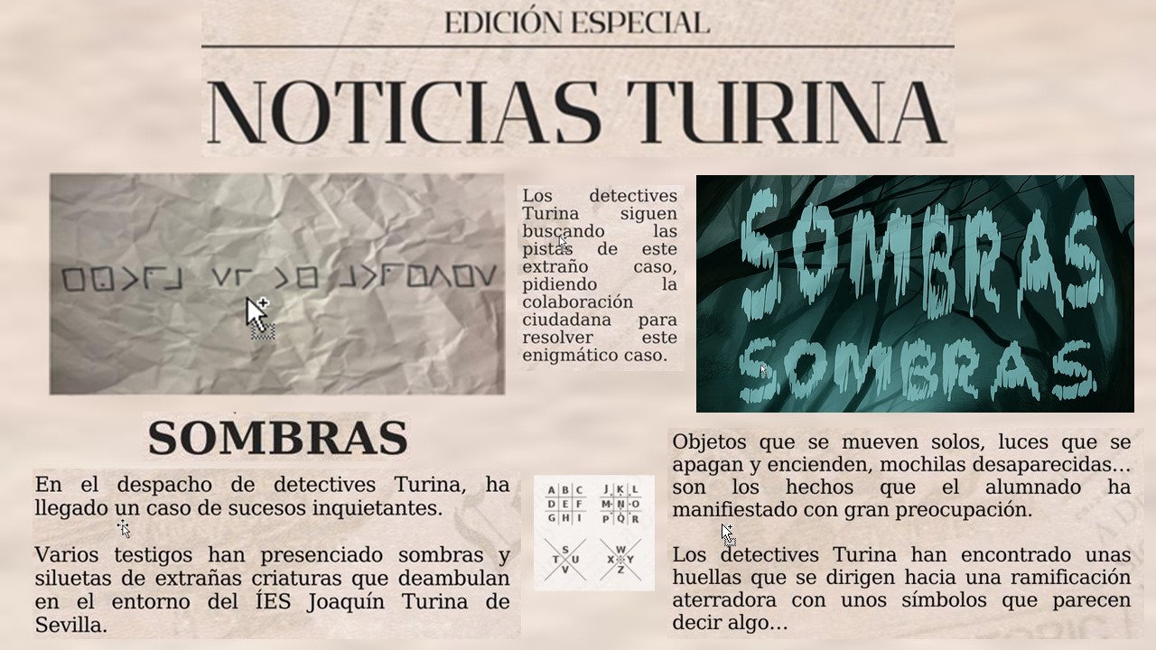 En segundo lugar mostramos la "noticia", tanto en español como en inglés que se distribuye por el centro y que muestra la narrativa de la activdad. Esta publicación contiene un mensaje secreto que debe ser descrifrado.