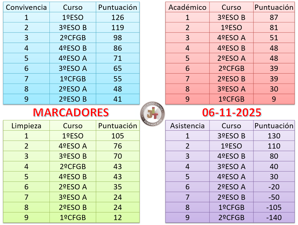 - Convivencia. 1ºESO conserva la primera posición, aunque 3ºESO B recorta distancia. 2ºCFGB mantiene la tercera posición.