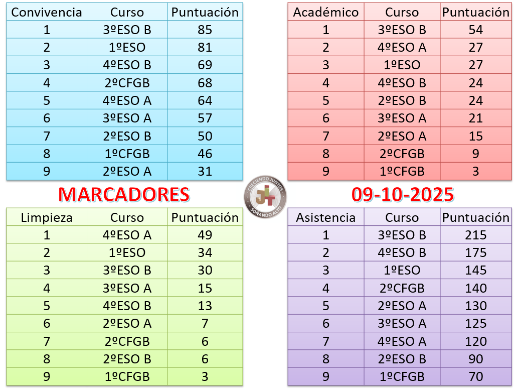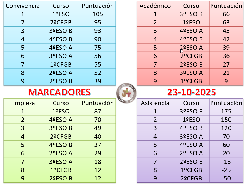 - Académico. 3ºESO B mantiene su primera posición con claridad, le sigue 4ºESO A como segundo, mejorando claramente su puntuación y empatando en dicha posición con 1ºESO.