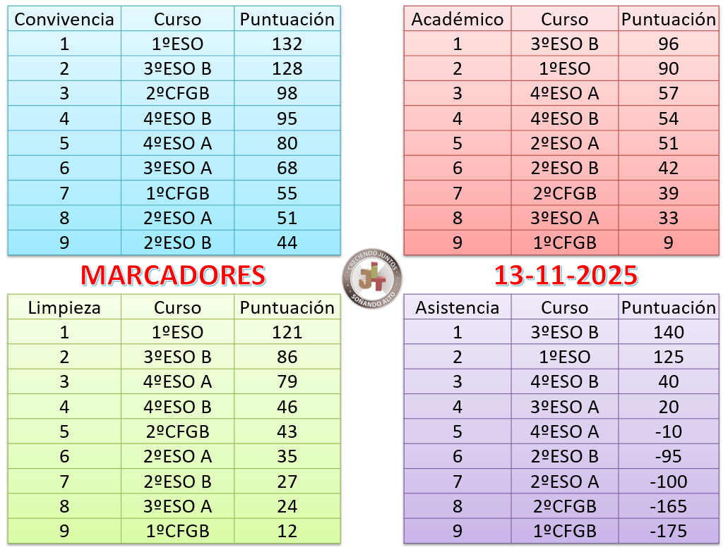 - Convivencia. 1ºESO conserva la primera posición, 3ºESO B baja a la tercera plaza al ser adelantado por 2ºCFGB.