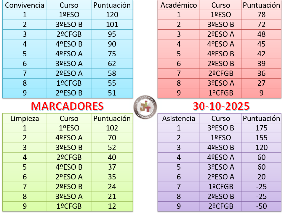 - Convivencia. 1ºESO conserva la primera posición, aunque 3ºESO B recorta distancia. 2ºCFGB mantiene la tercera posición.