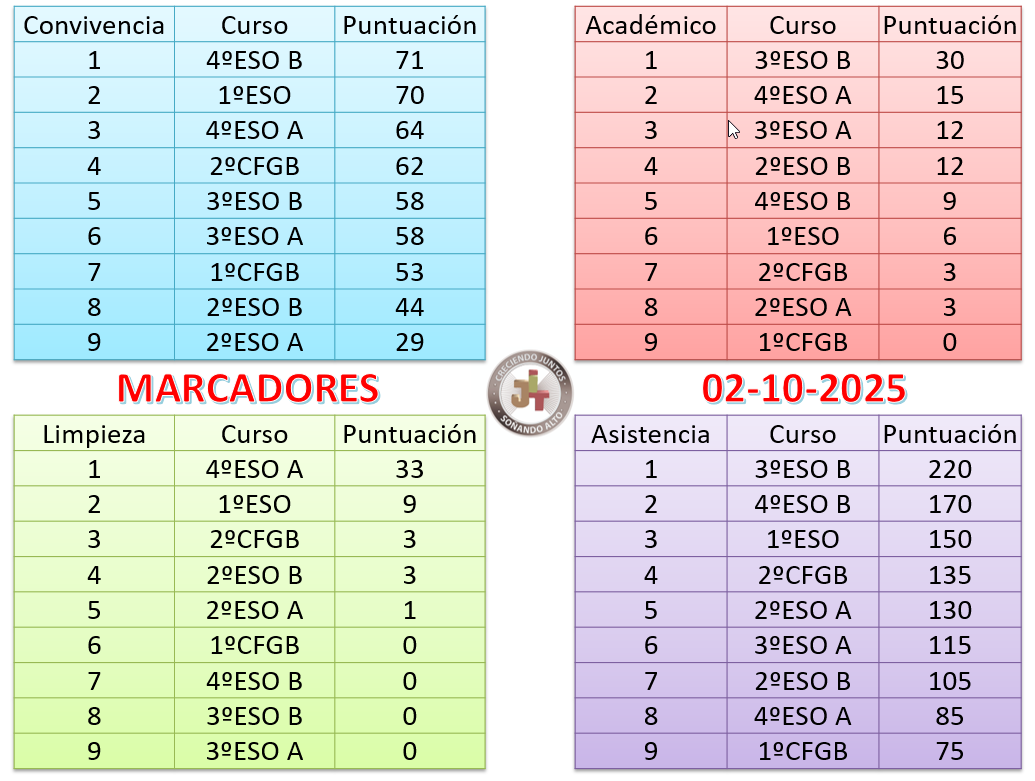 Cada semana se actualizará la puntuación en cada una de las cuatro categorías. Se podrán ver en la página web del centro y en la tele de la entrada del IES.