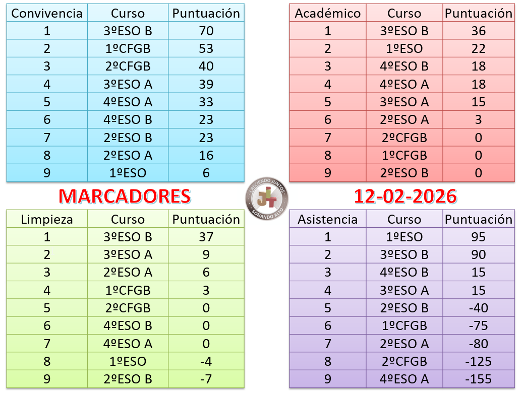 - Convivencia. 3ºESO B mantiene el liderato, 1ºESO continúa en la segunda posición. La tercera posición es para 2ºCFGM.