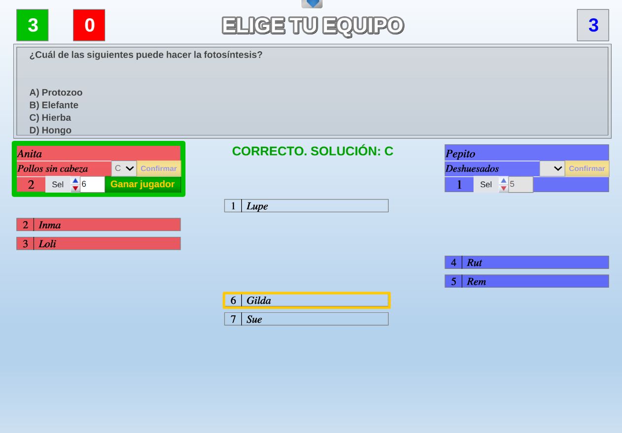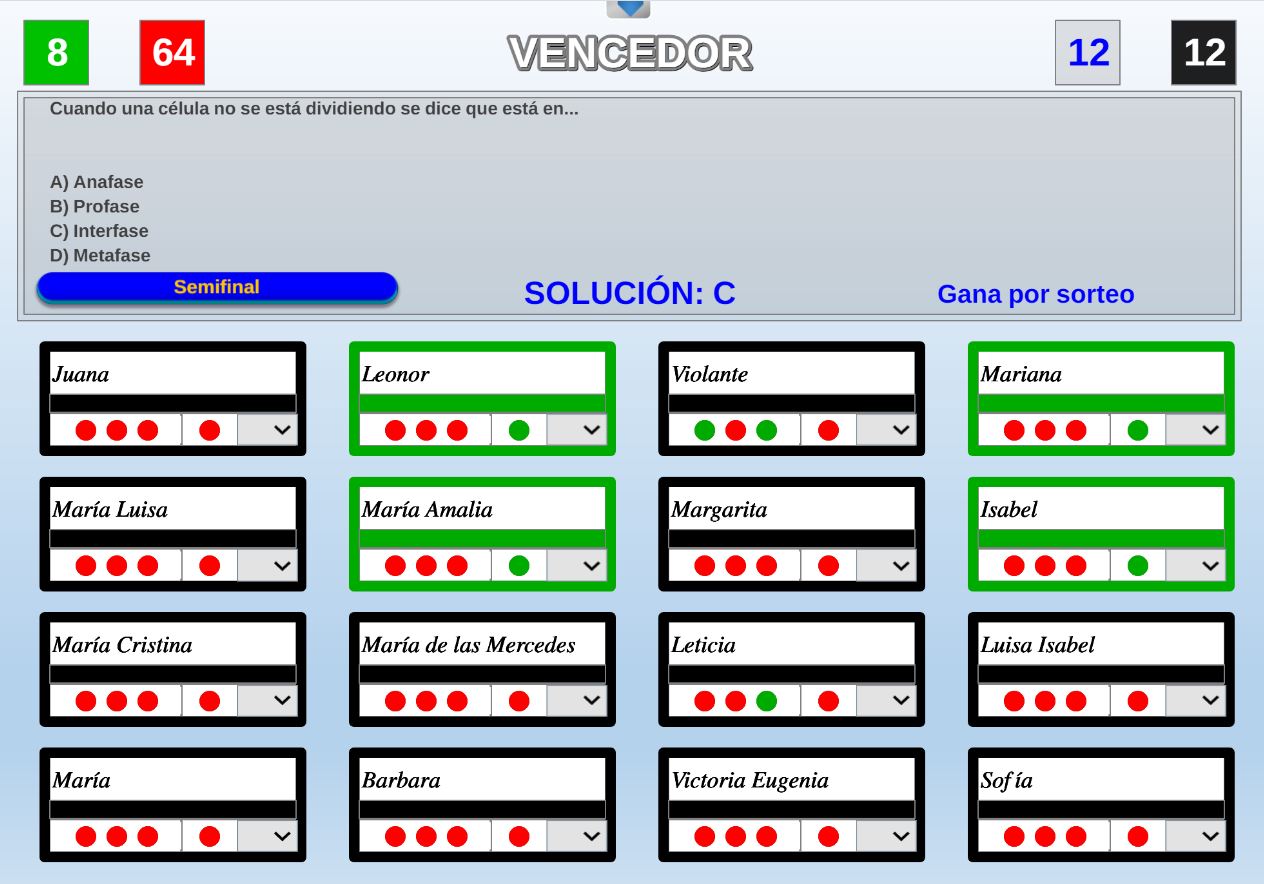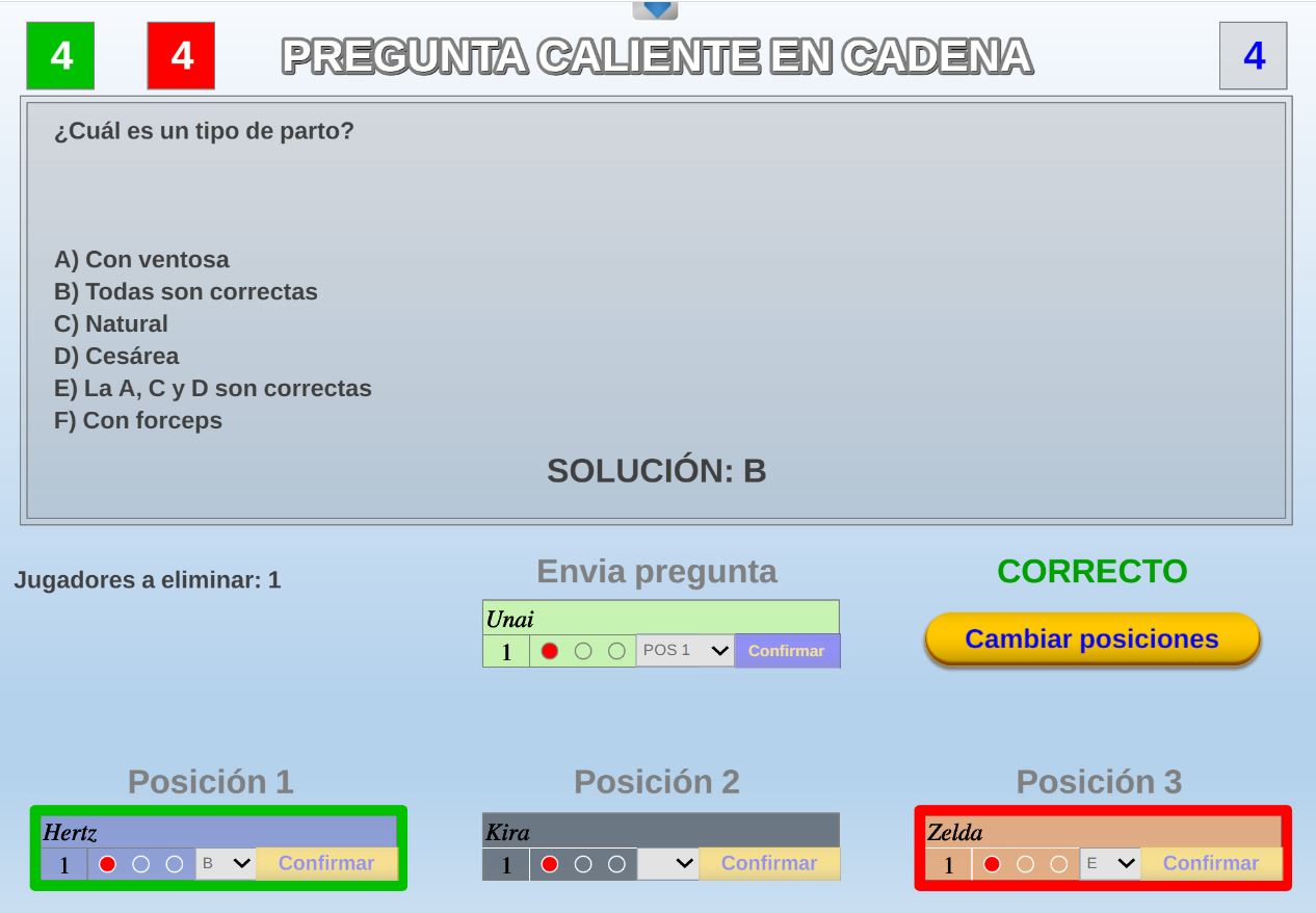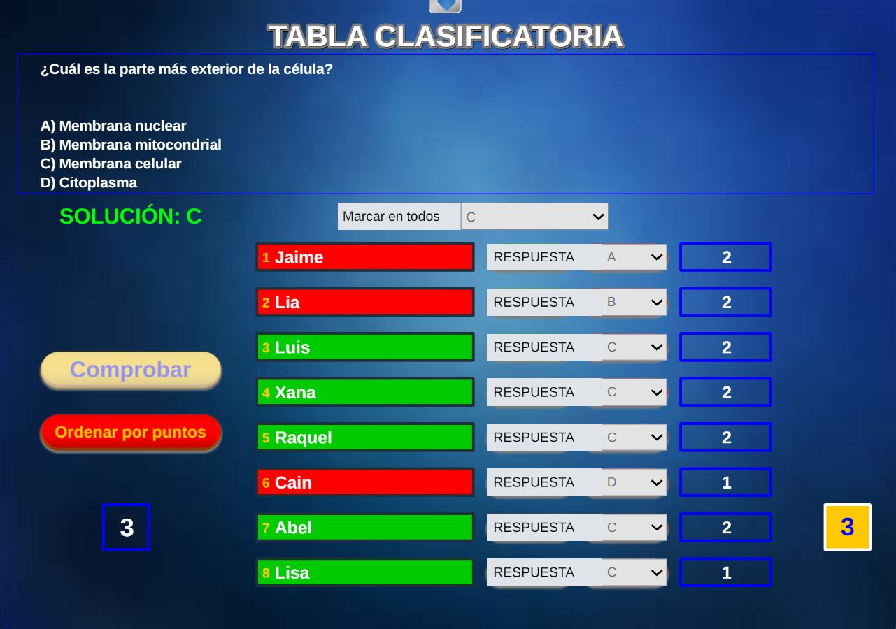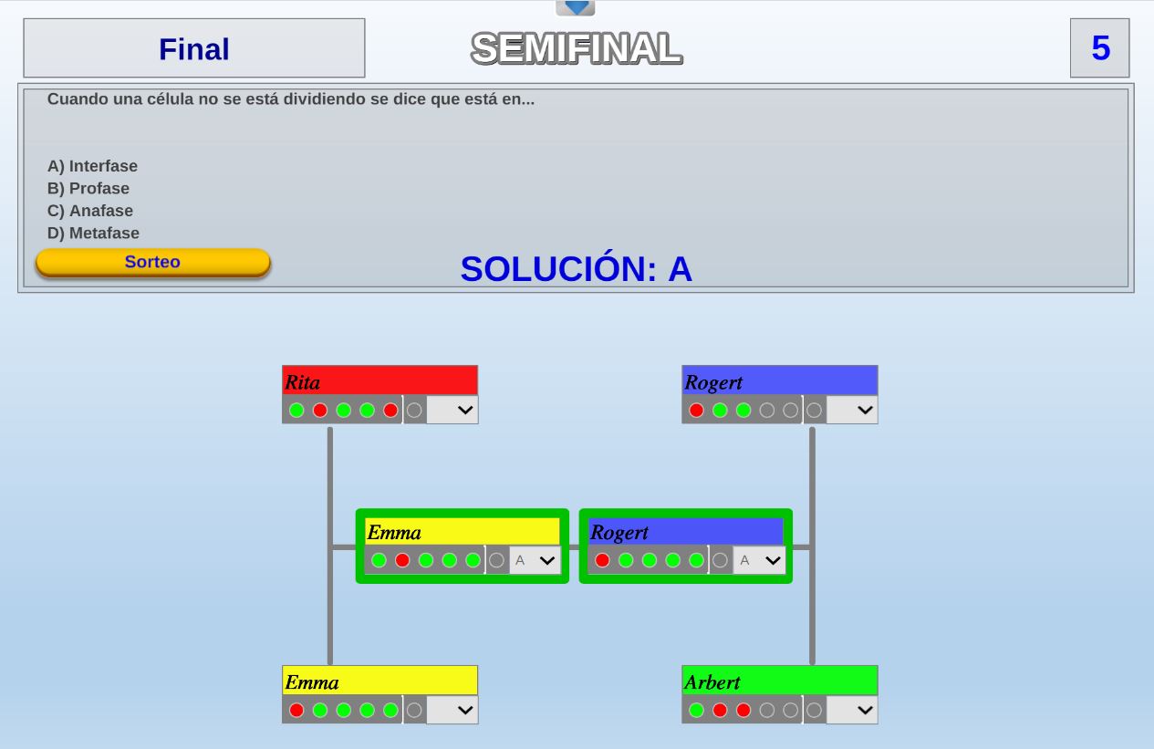 Juego en el que quedará como primer clasificado, aquel que más respuestas correctas consiga. Participan un total de 8 jugadores y el número de preguntas es modulable.