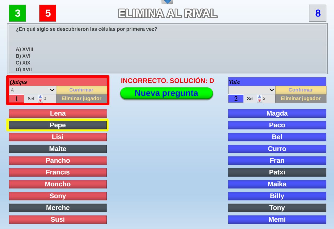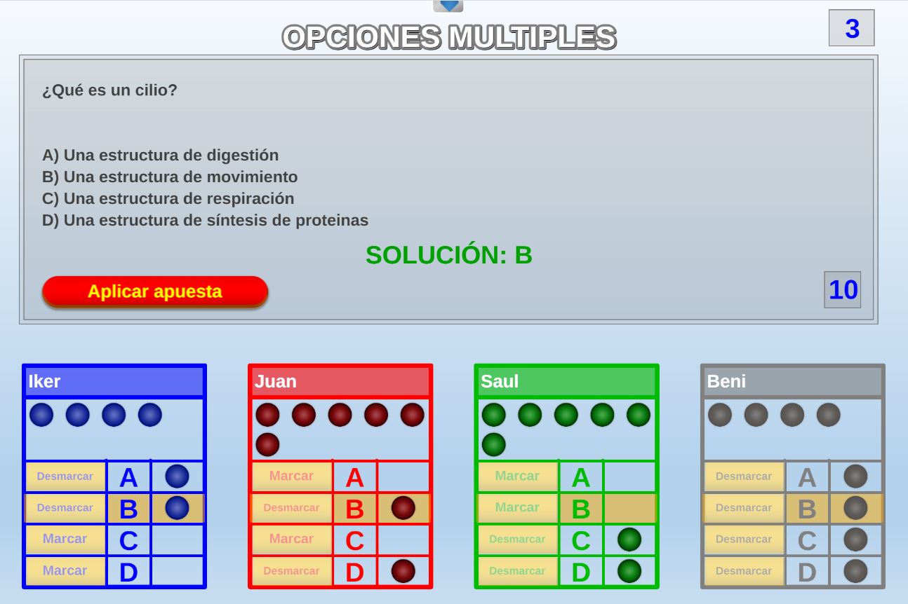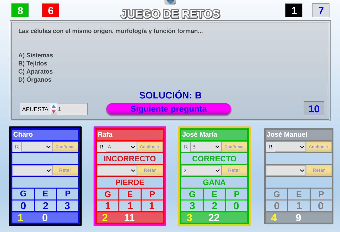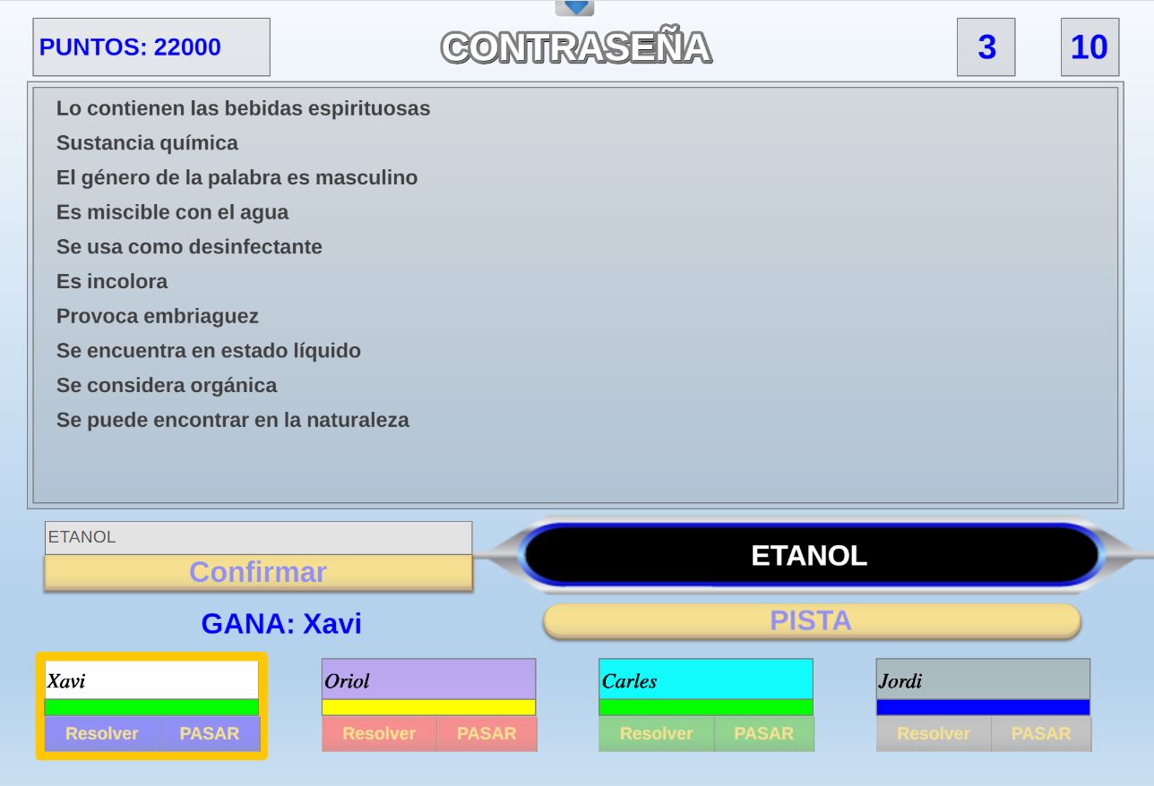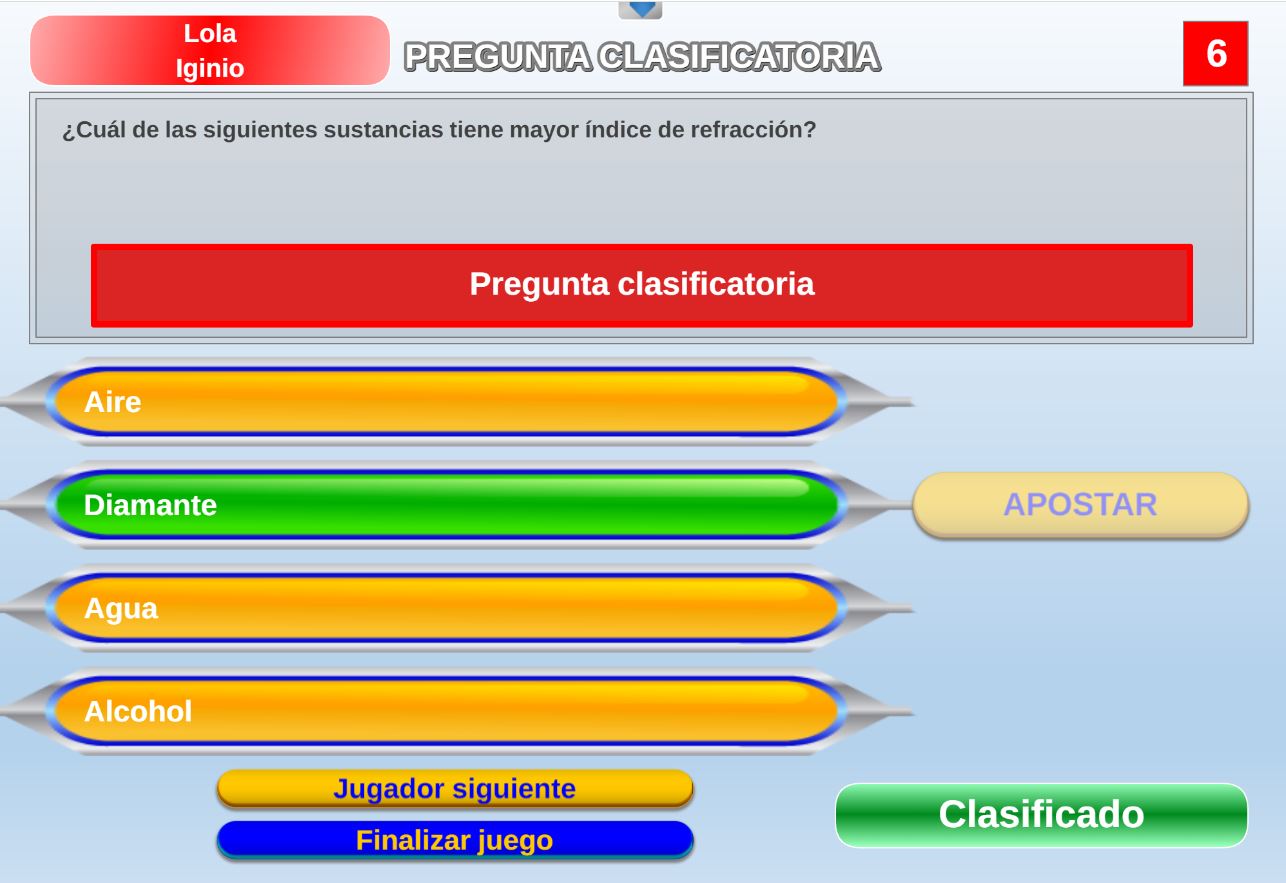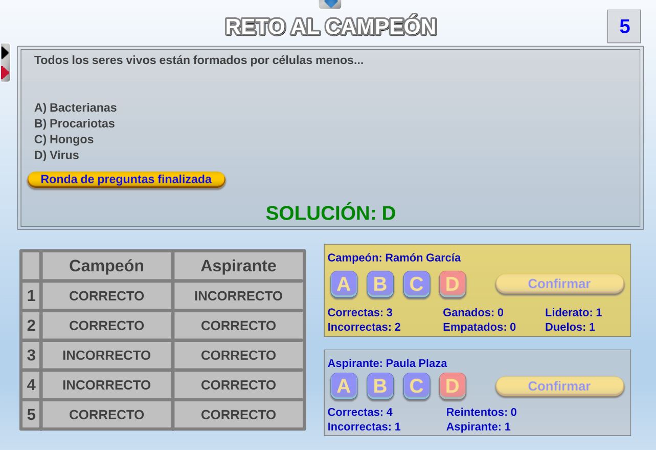 Juego en el que quedará como primer clasificado, aquel que más respuestas correctas consiga. Participan un total de 8 jugadores y el número de preguntas es modulable.
