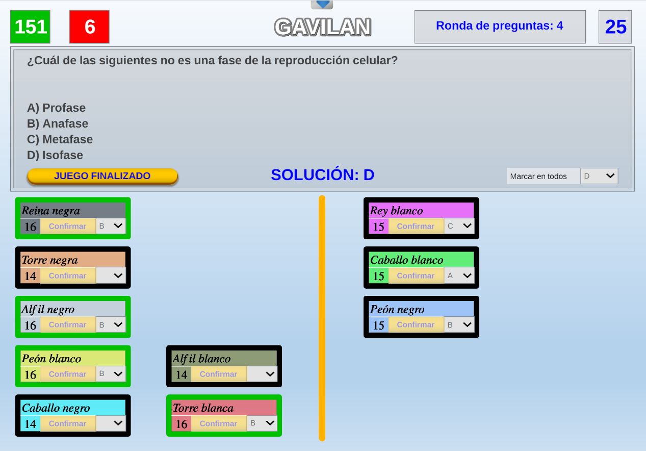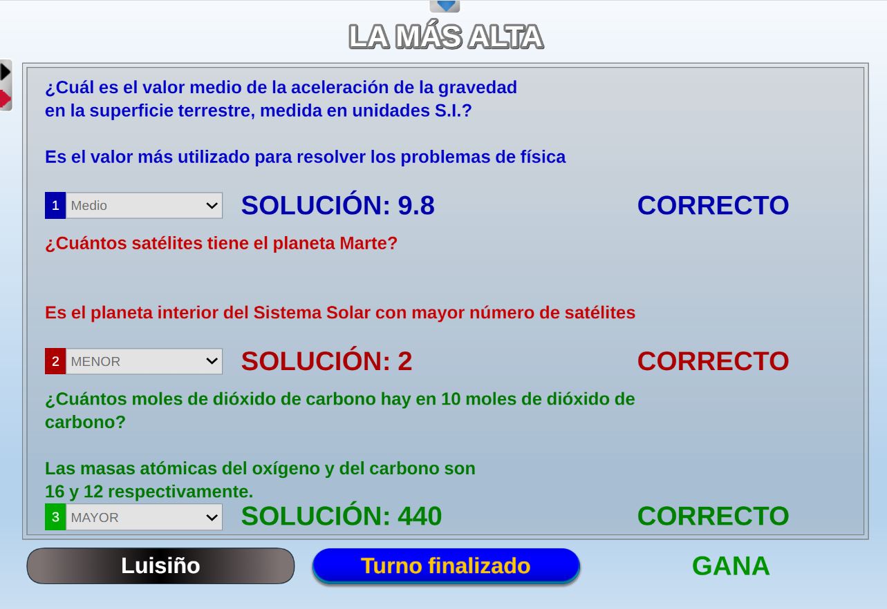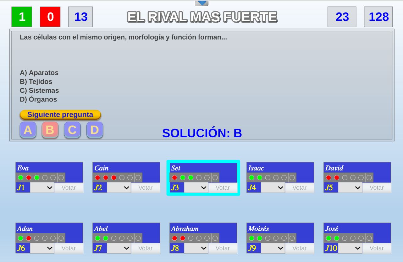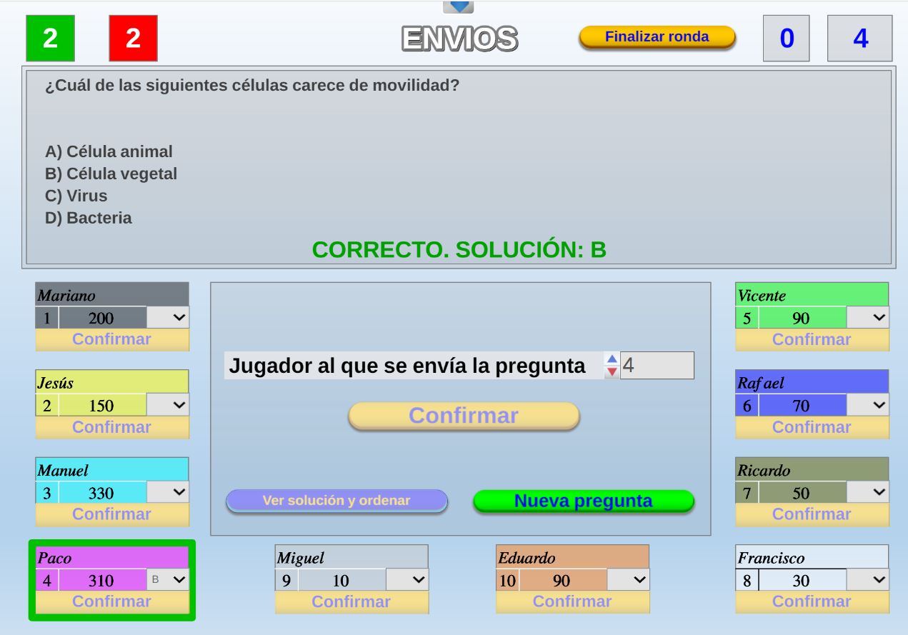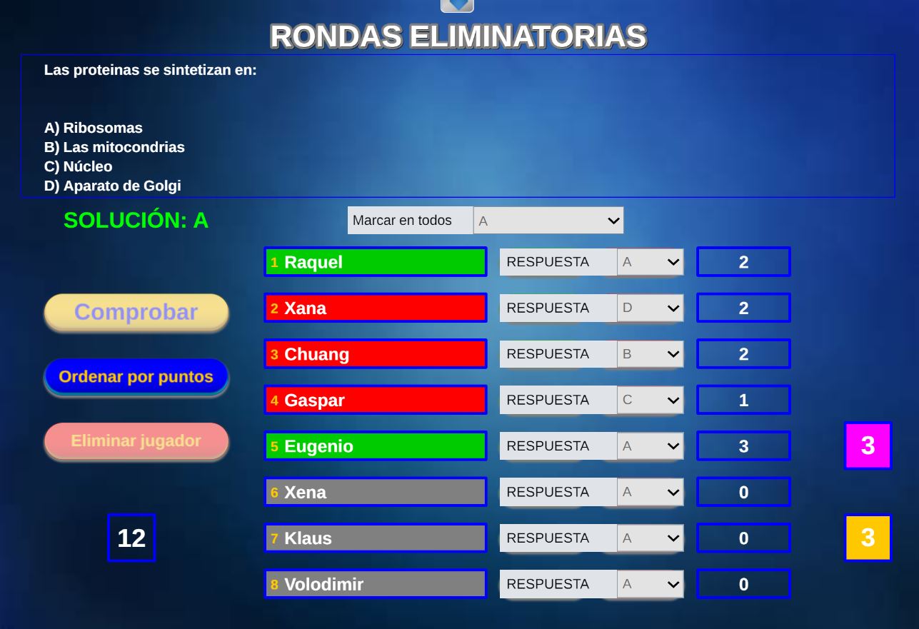 Juego en el que quedará como primer clasificado, aquel que más respuestas correctas consiga. Participan un total de 8 jugadores y el número de preguntas es modulable.