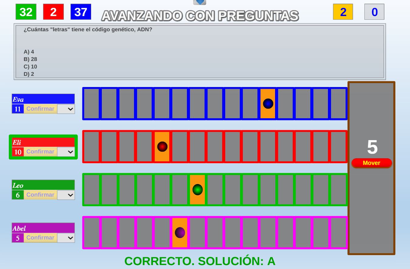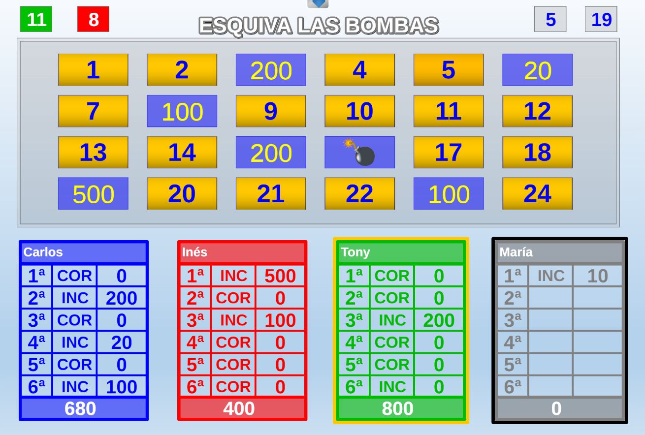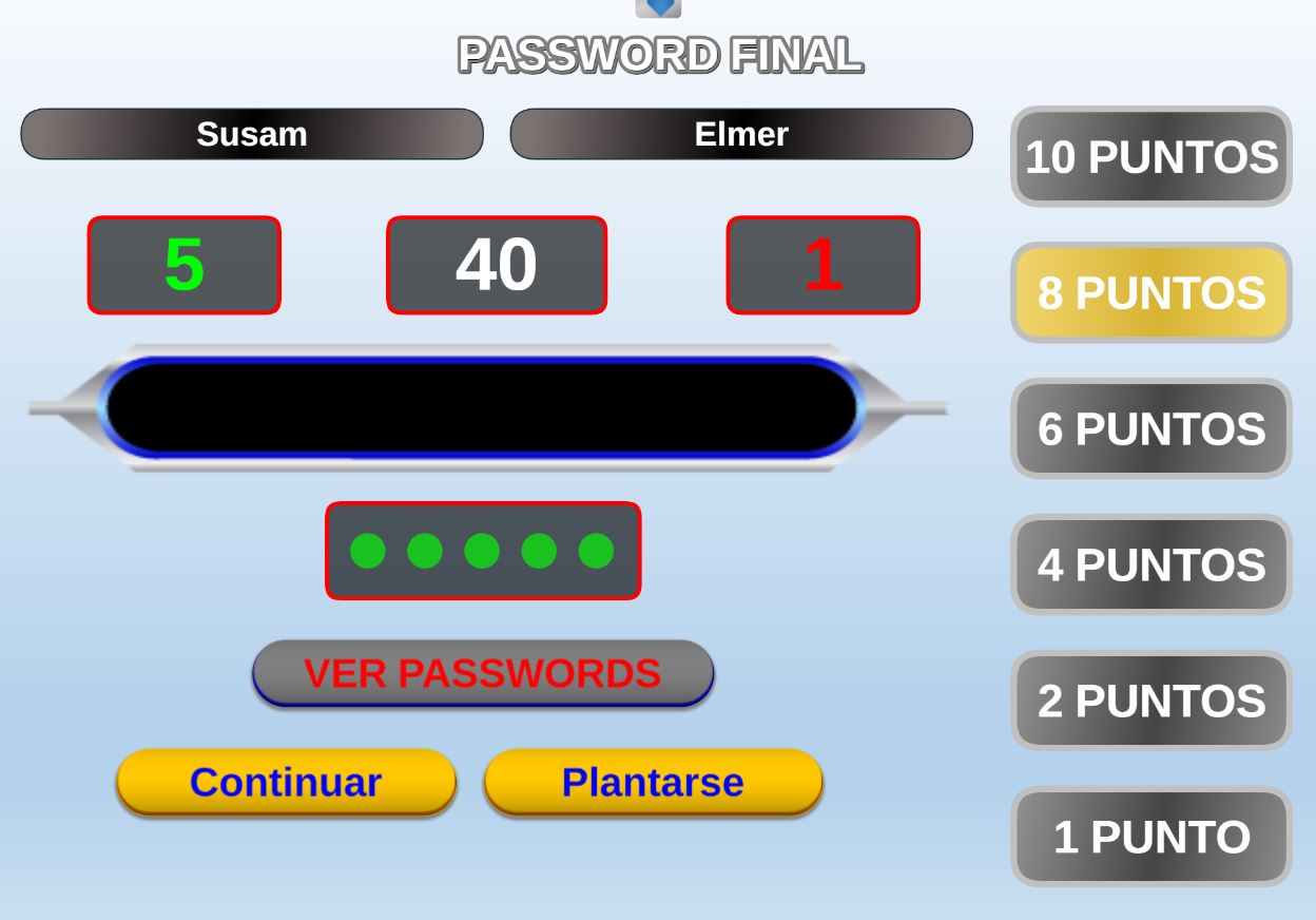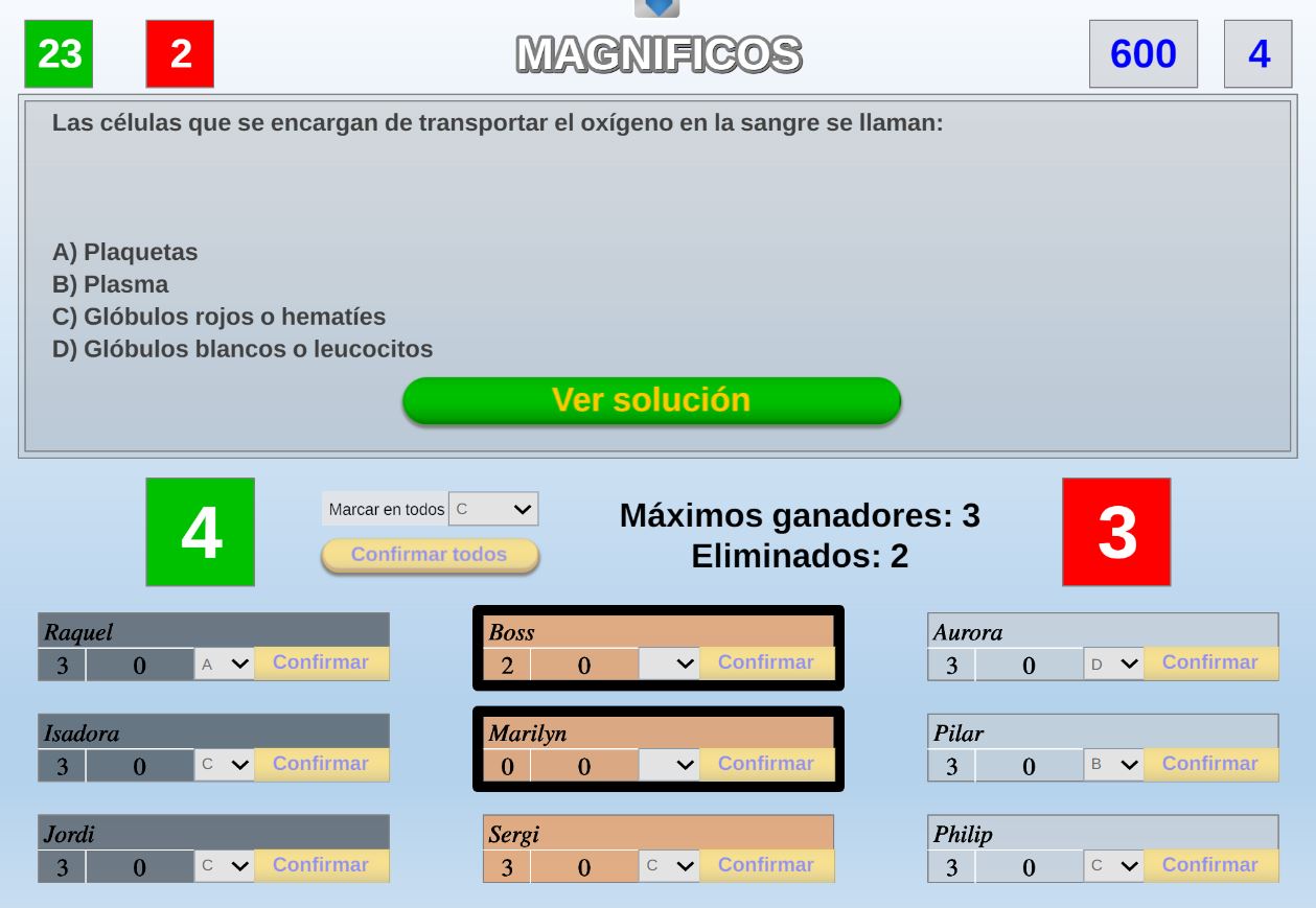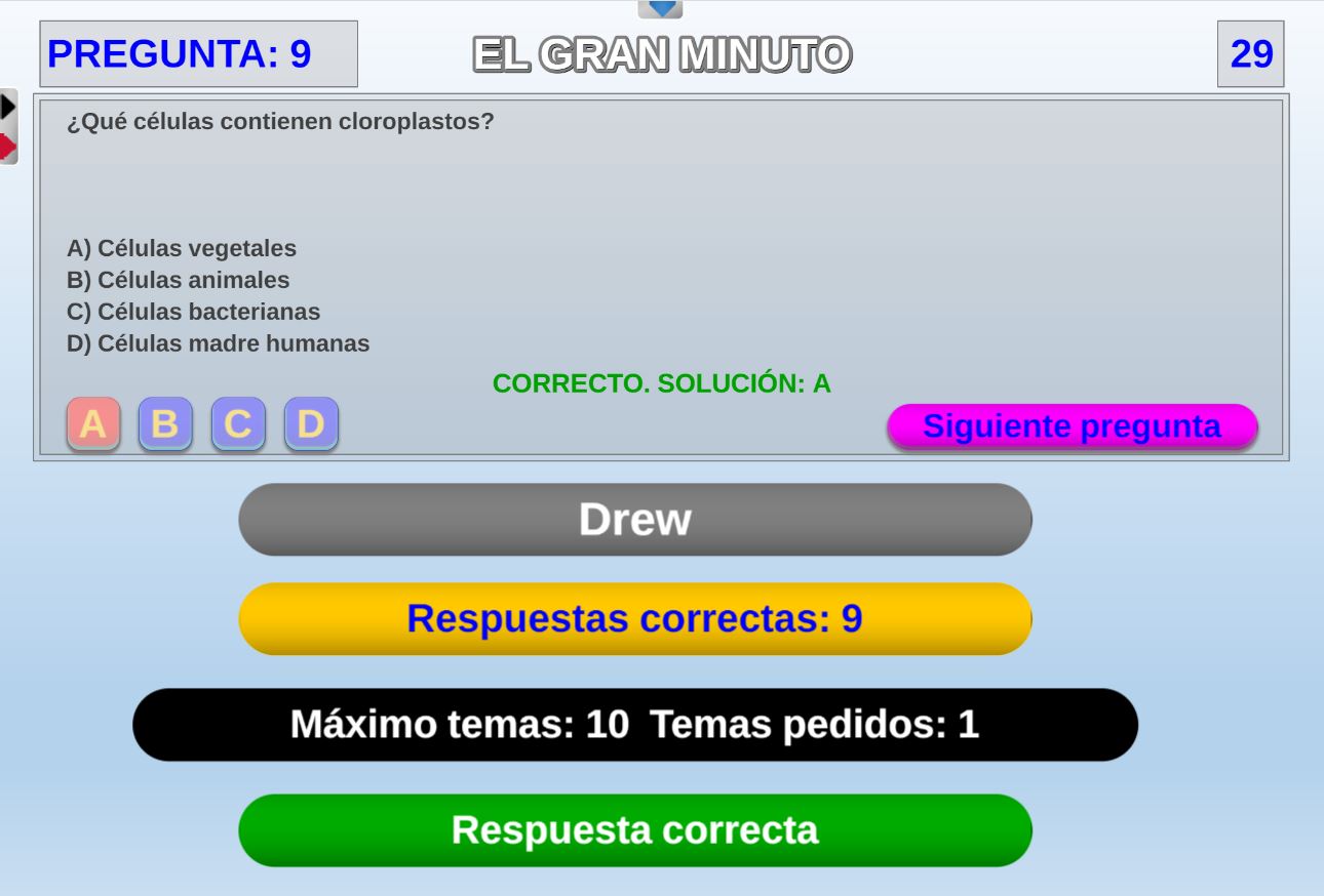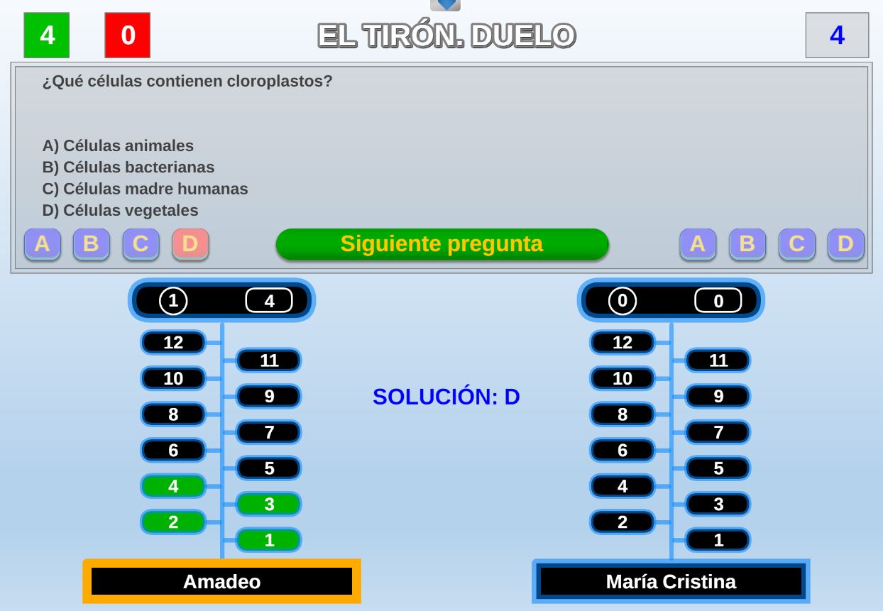 Juego en el que quedará como primer clasificado, aquel que más respuestas correctas consiga. Participan un total de 8 jugadores y el número de preguntas es modulable.