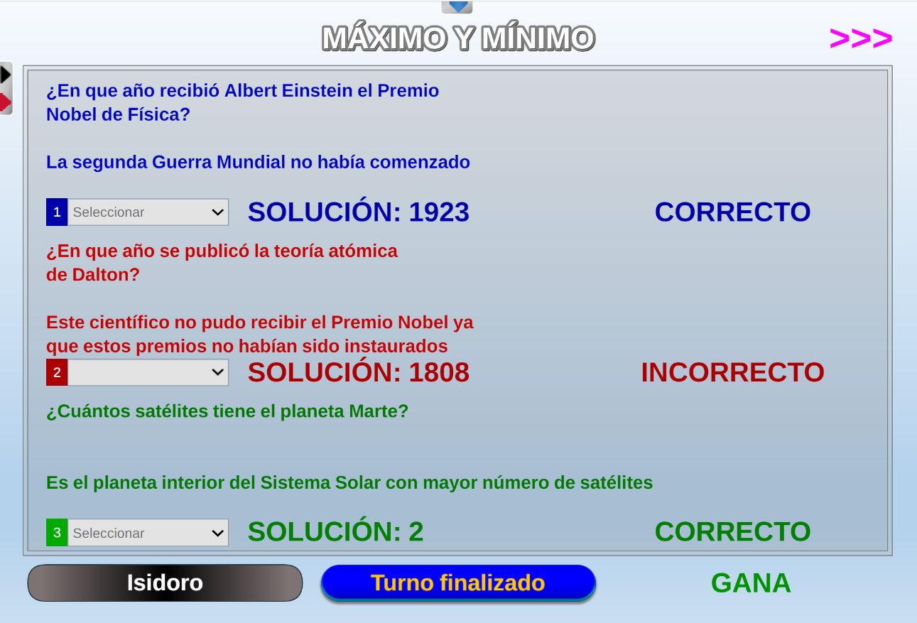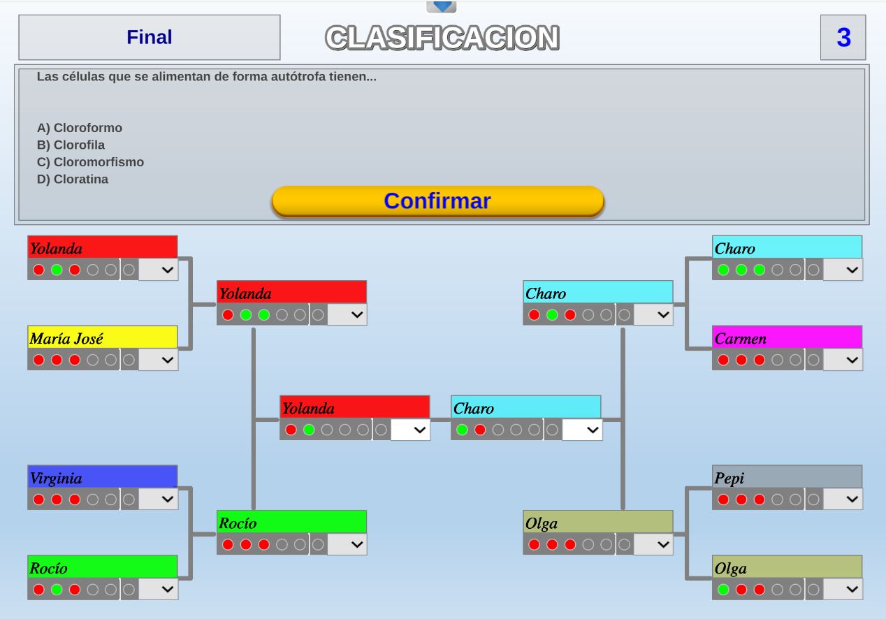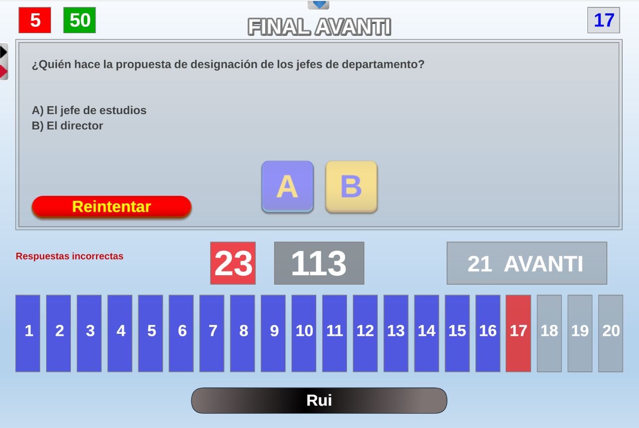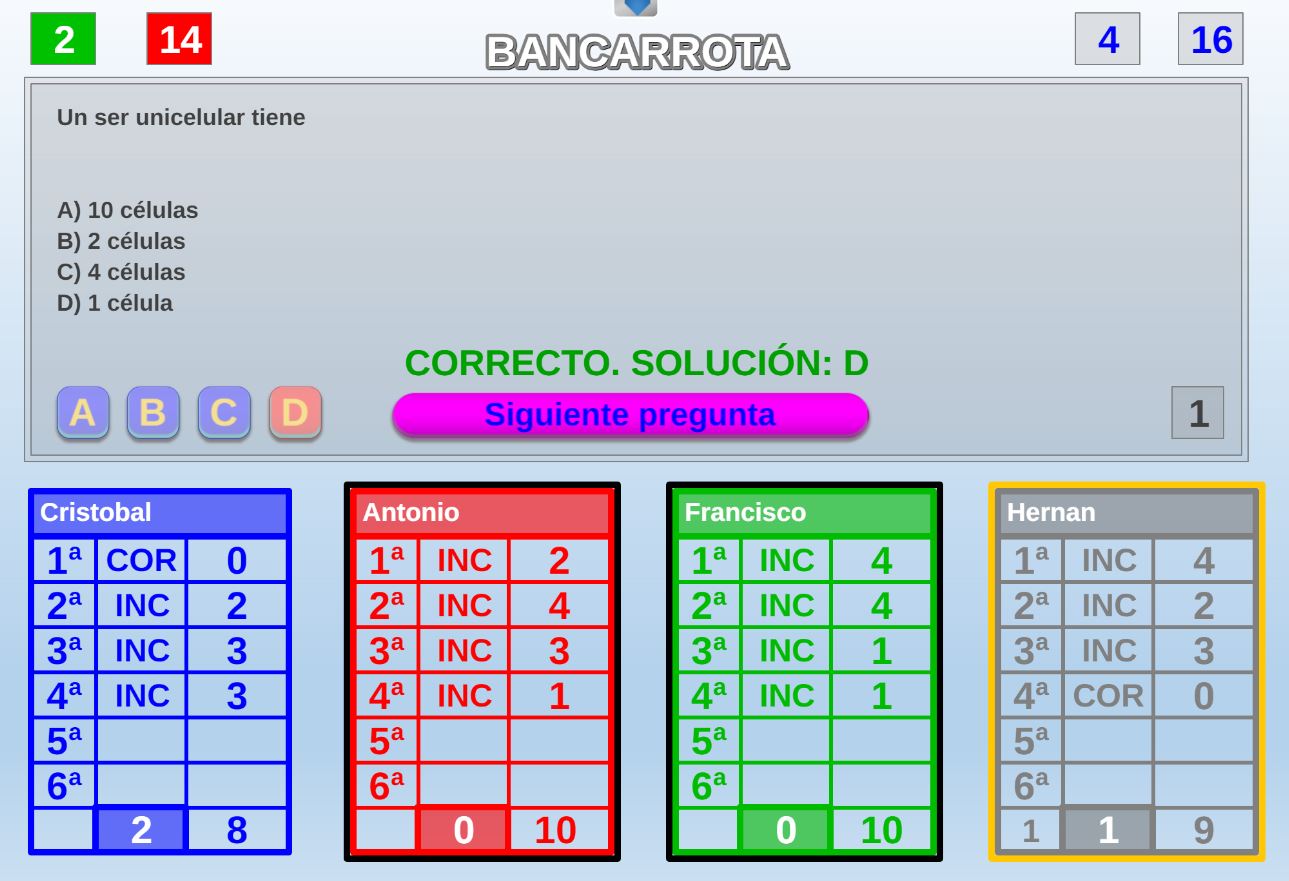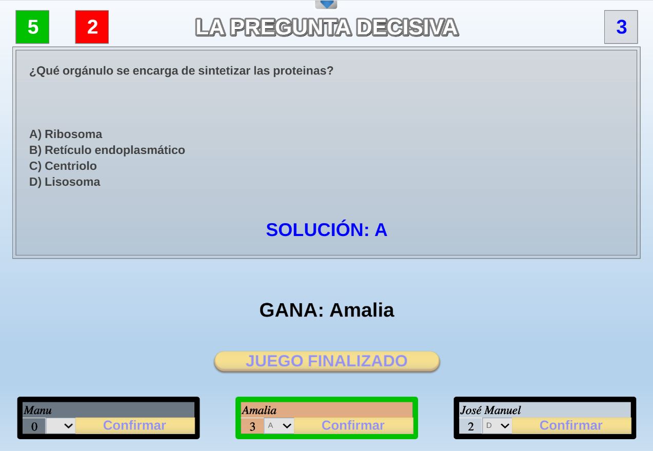 Juego en el que quedará como primer clasificado, aquel que más respuestas correctas consiga. Participan un total de 8 jugadores y el número de preguntas es modulable.