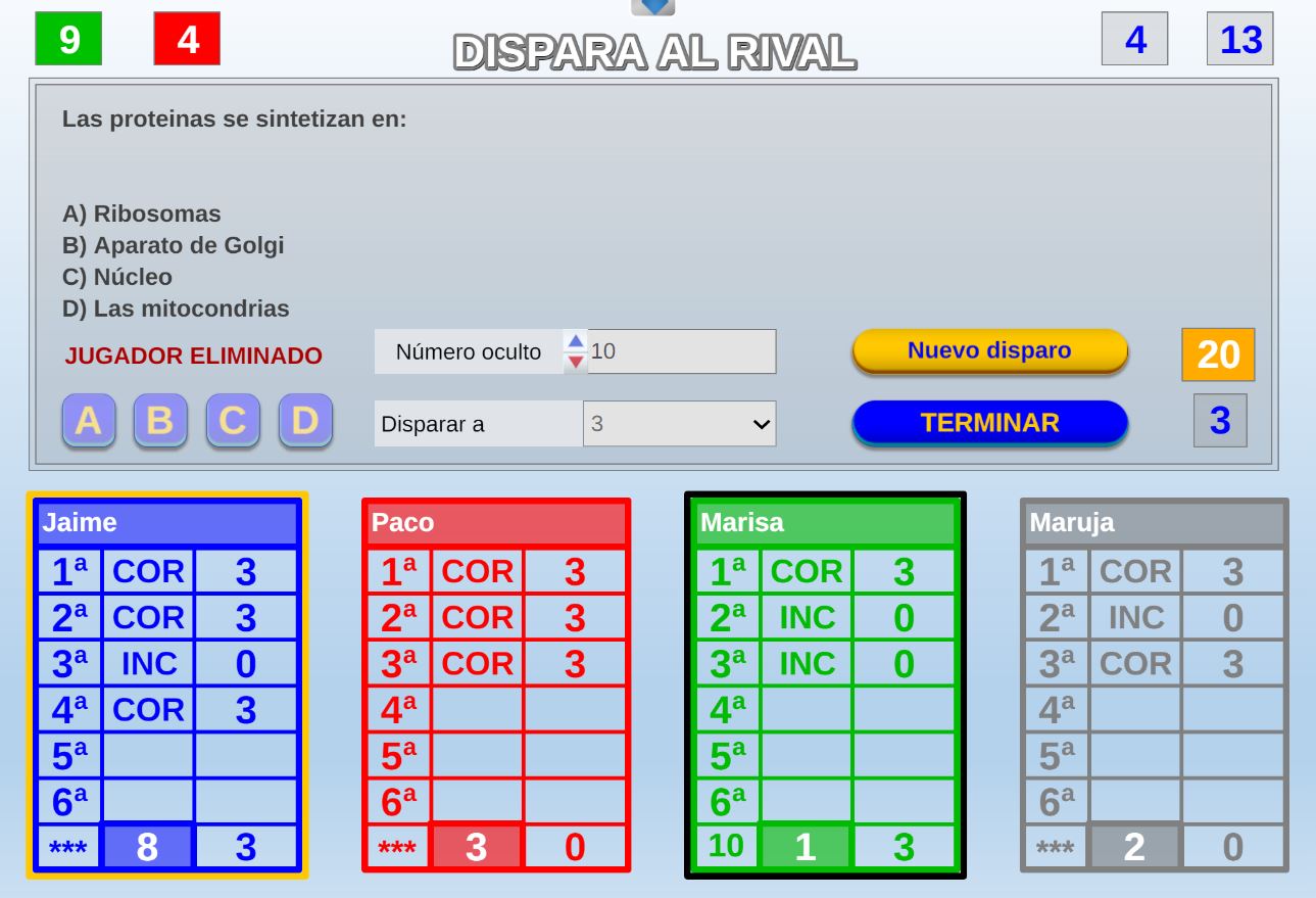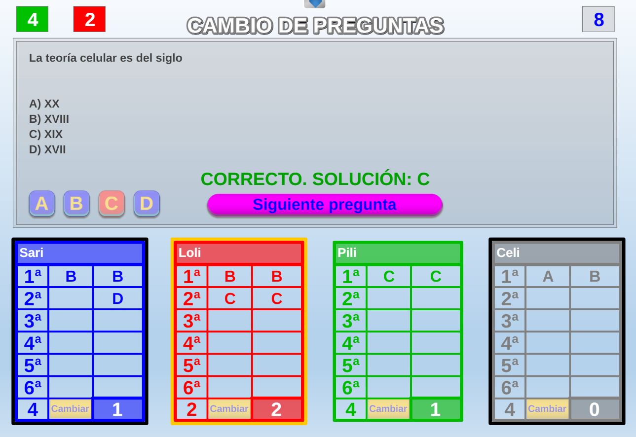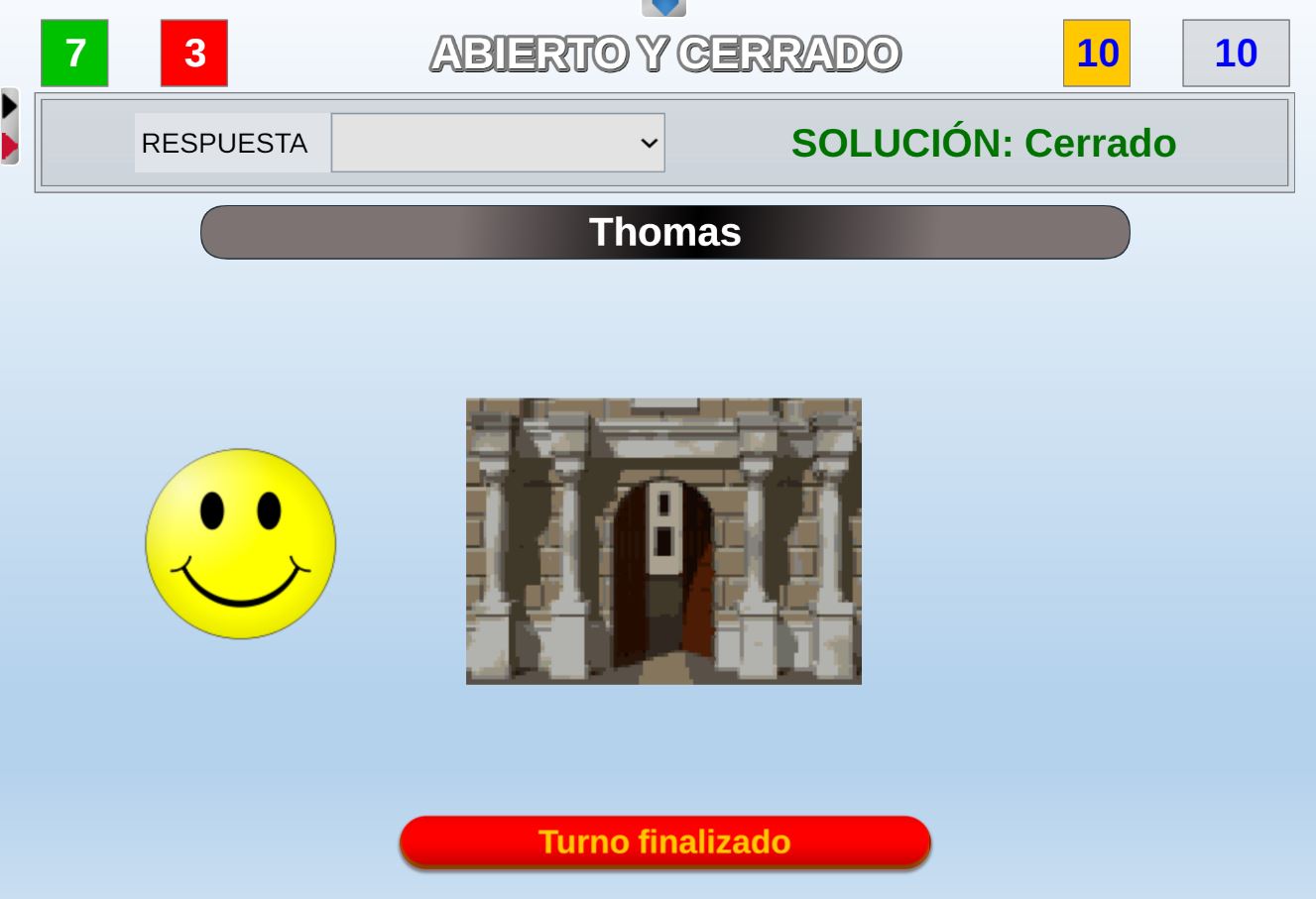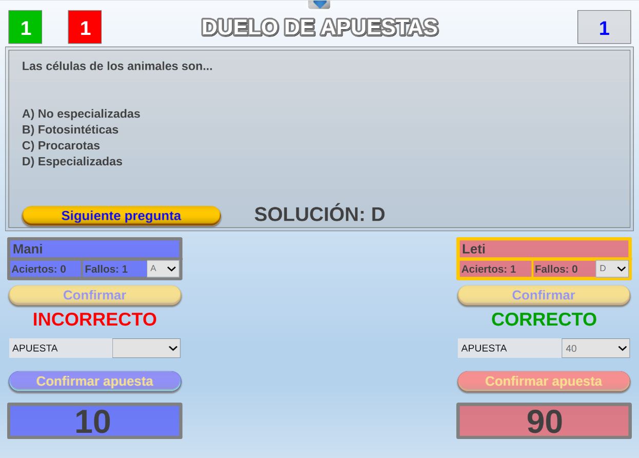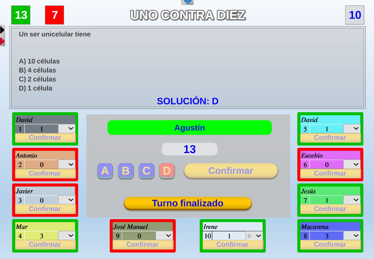 Juego en el que quedará como primer clasificado, aquel que más respuestas correctas consiga. Participan un total de 8 jugadores y el número de preguntas es modulable.