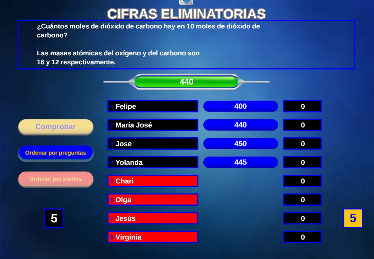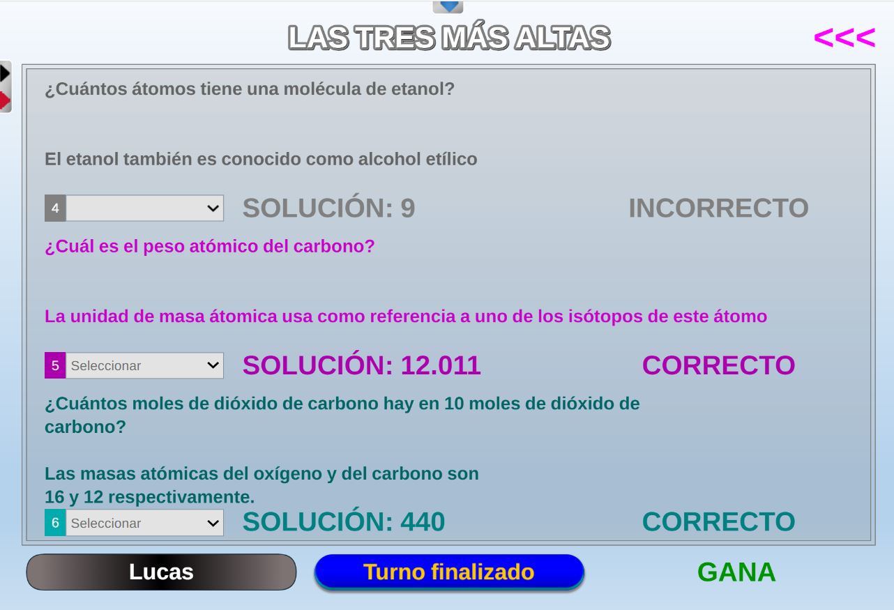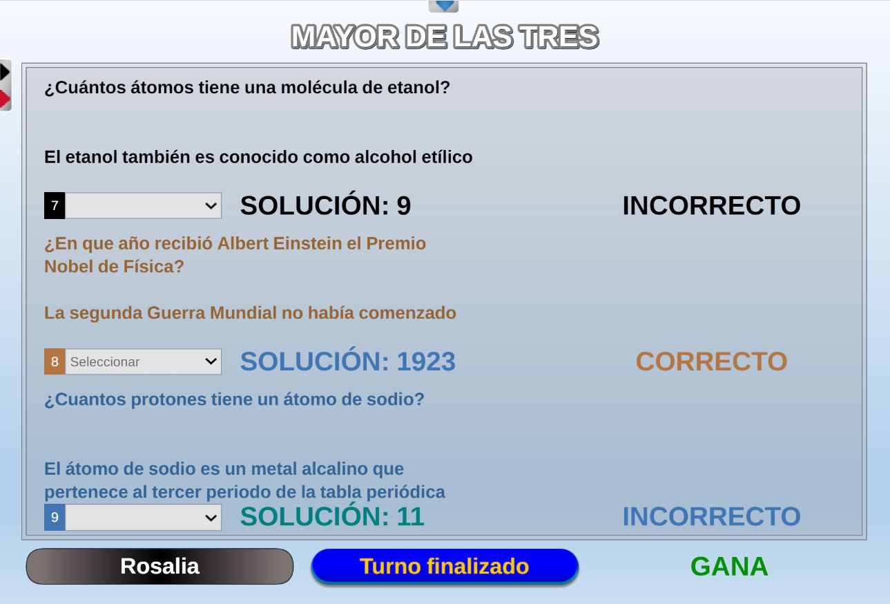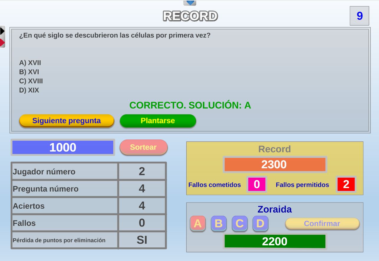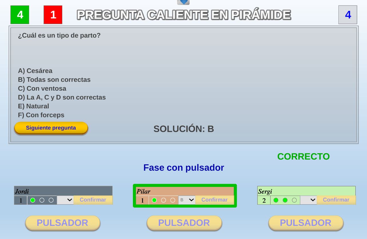 Juego en el que quedará como primer clasificado, aquel que más respuestas correctas consiga. Participan un total de 8 jugadores y el número de preguntas es modulable.