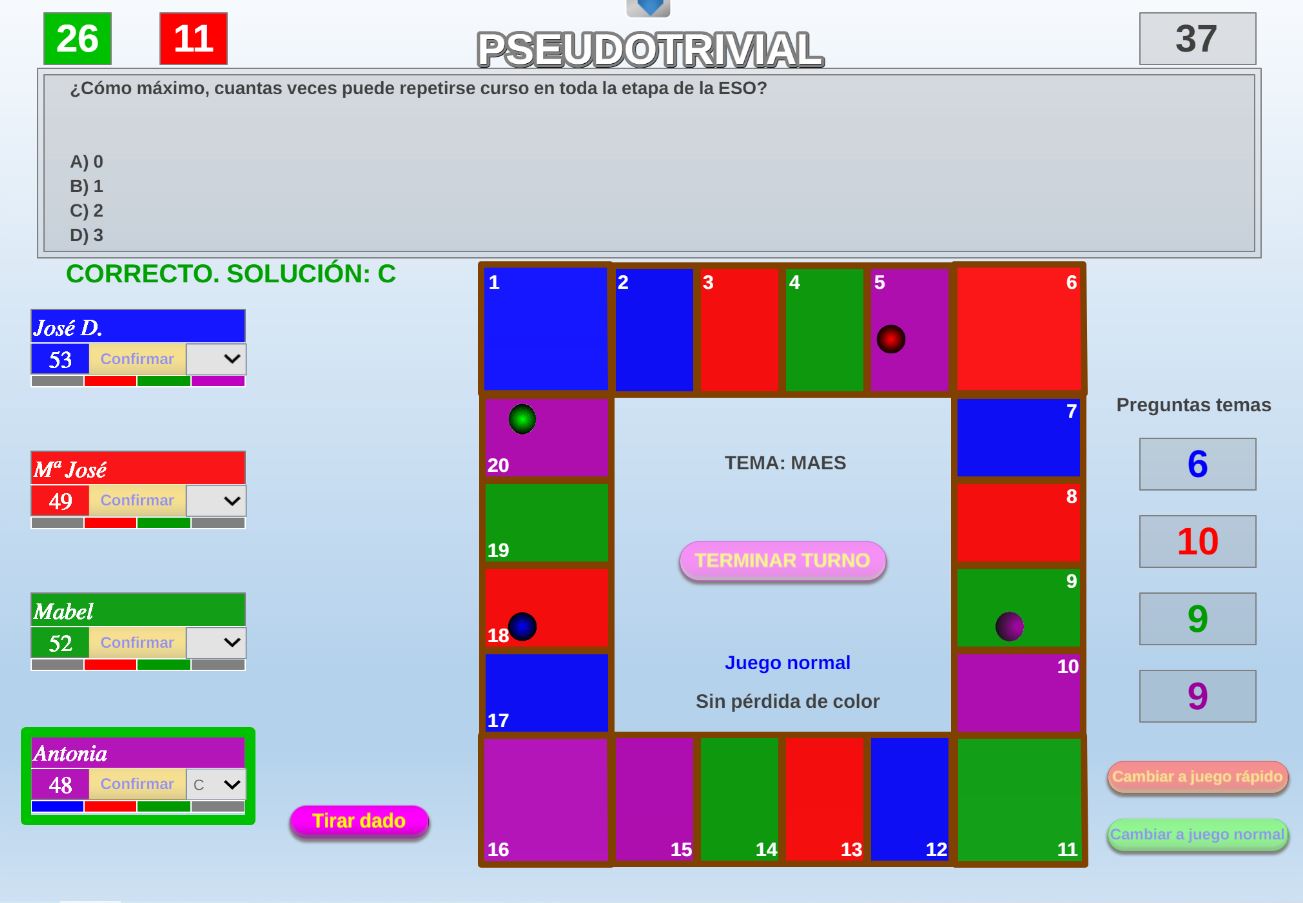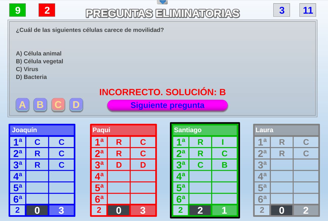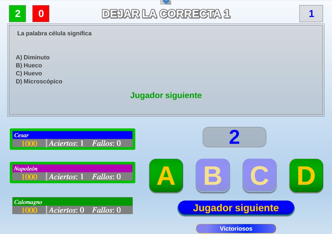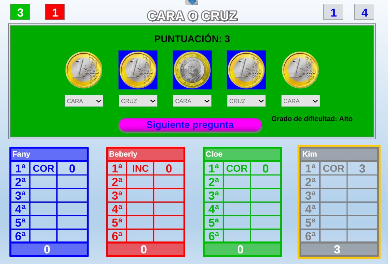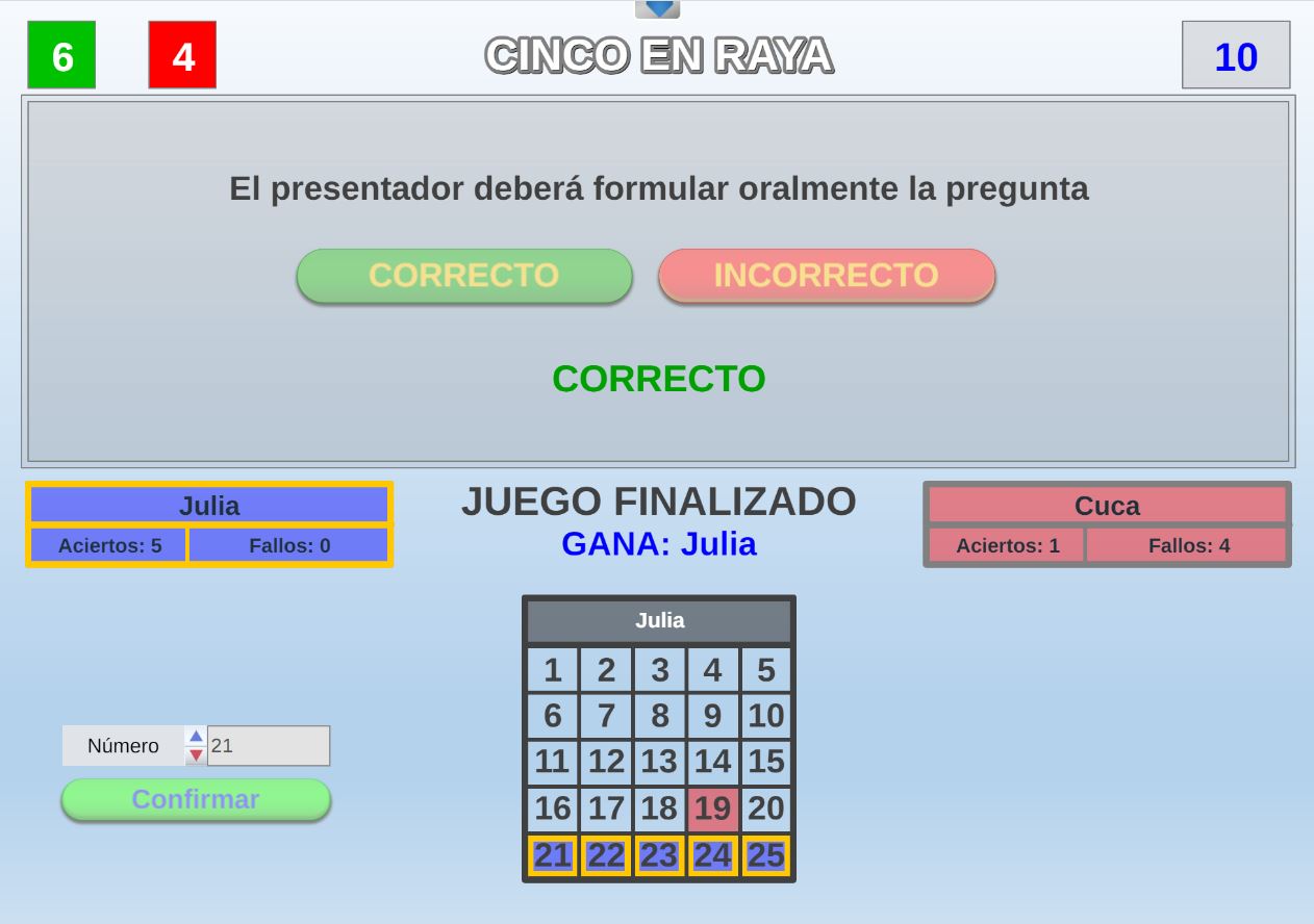 Juego en el que quedará como primer clasificado, aquel que más respuestas correctas consiga. Participan un total de 8 jugadores y el número de preguntas es modulable.