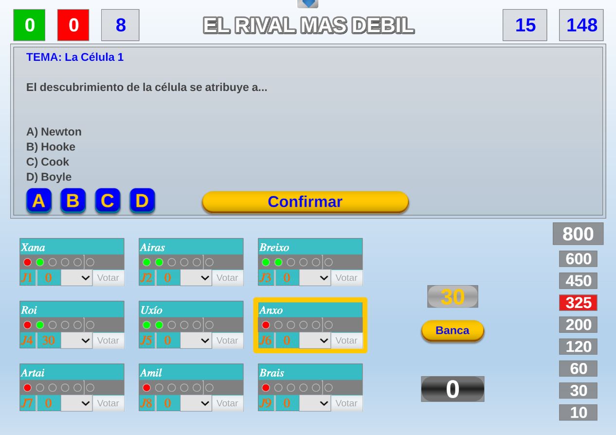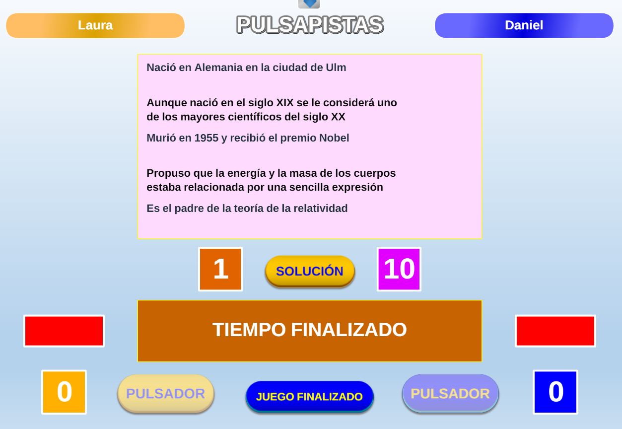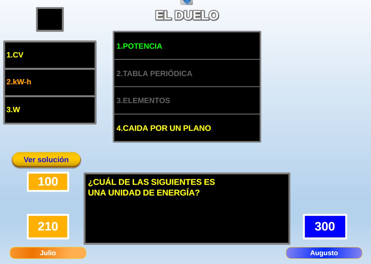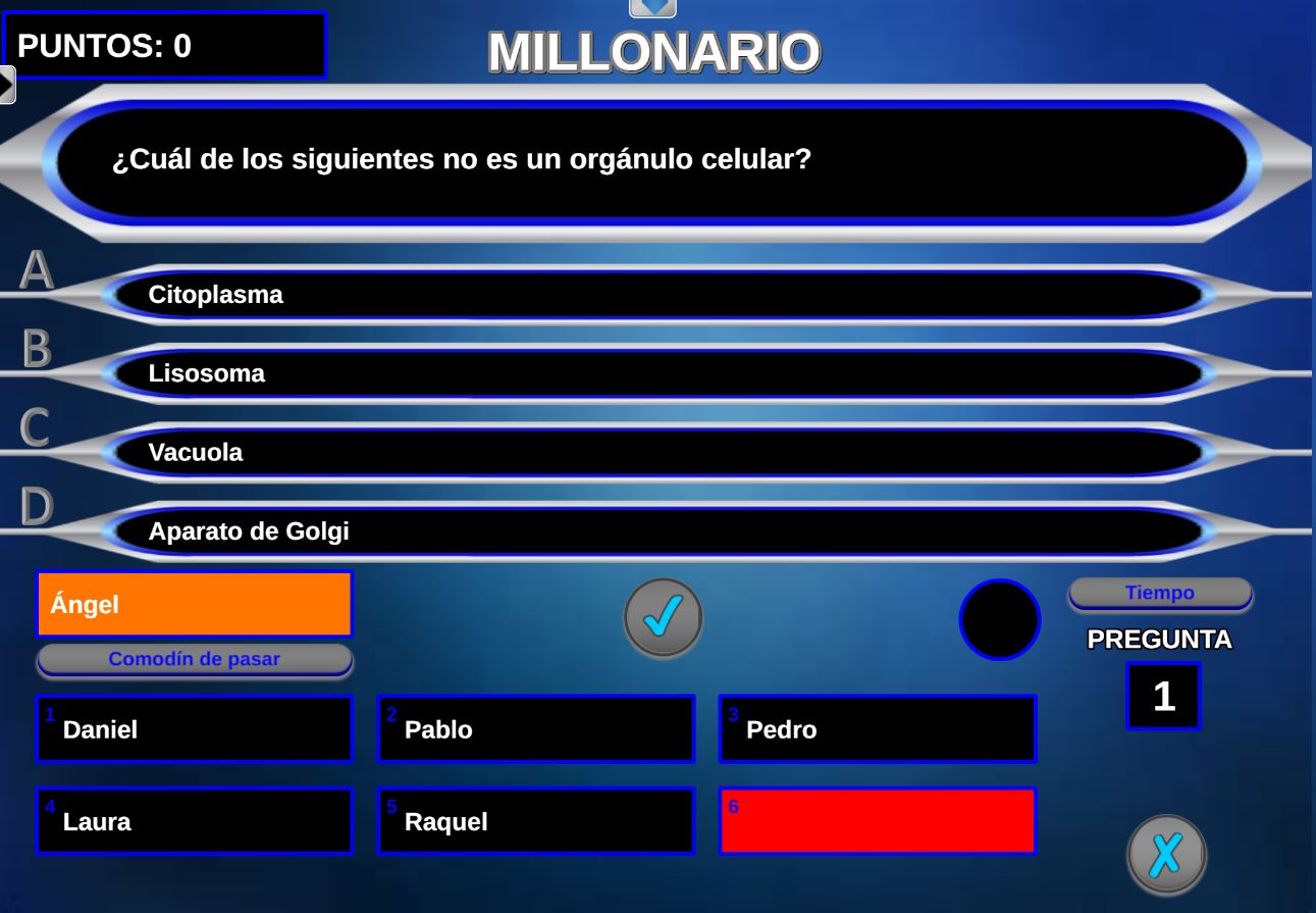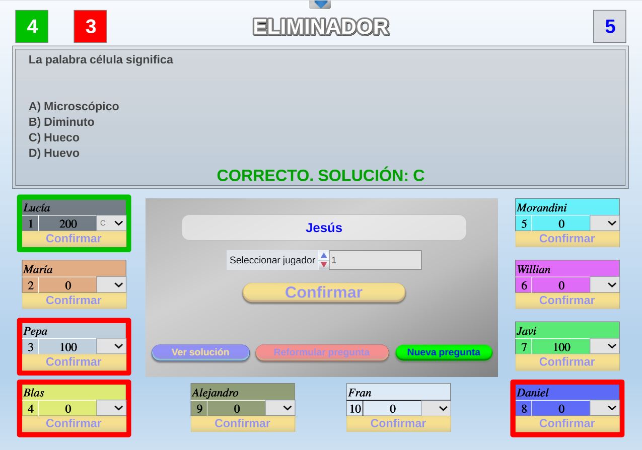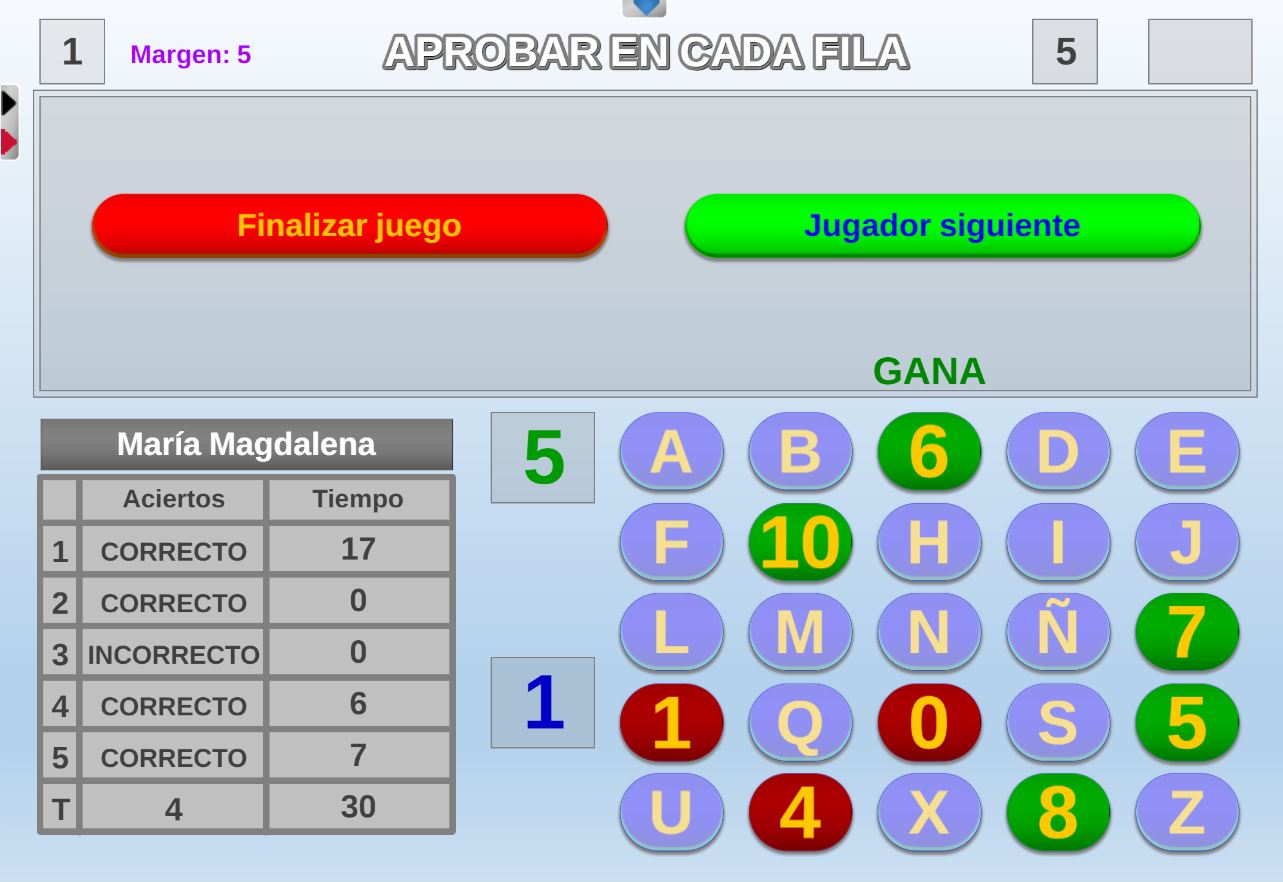 Juego en el que quedará como primer clasificado, aquel que más respuestas correctas consiga. Participan un total de 8 jugadores y el número de preguntas es modulable.
