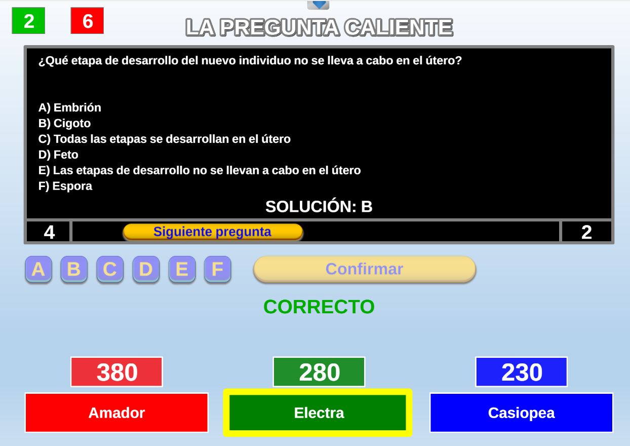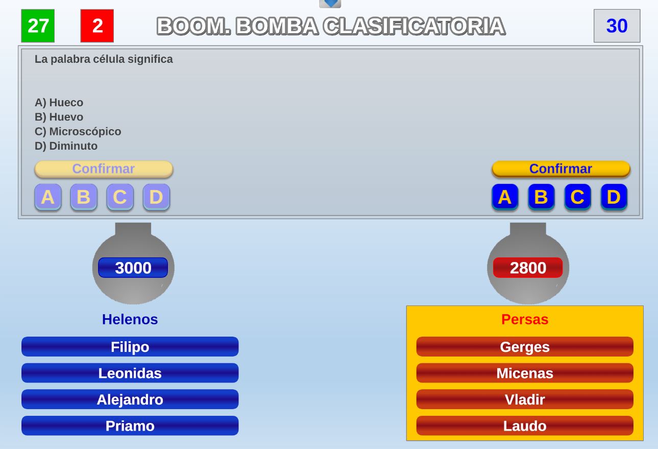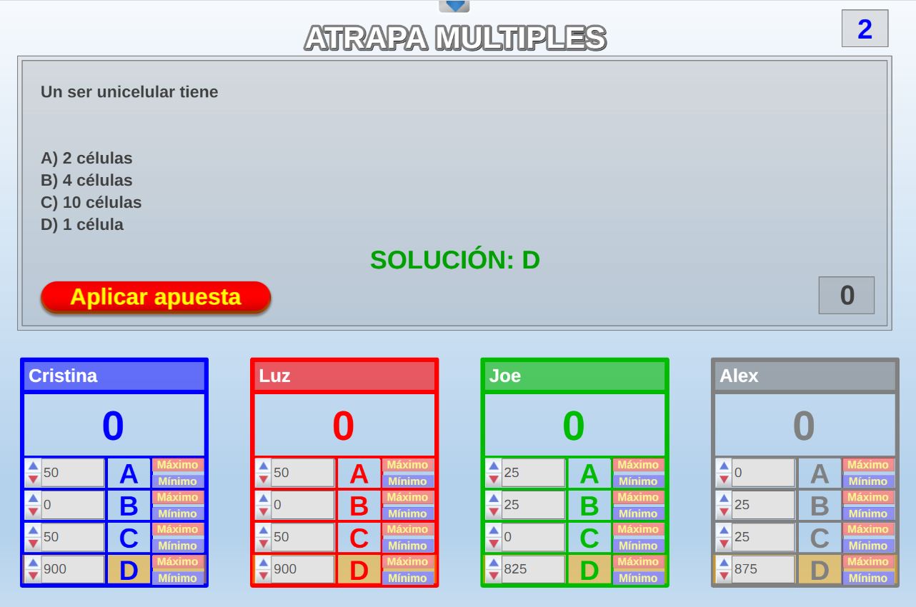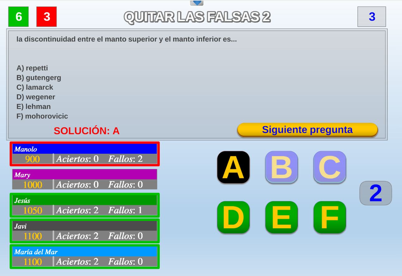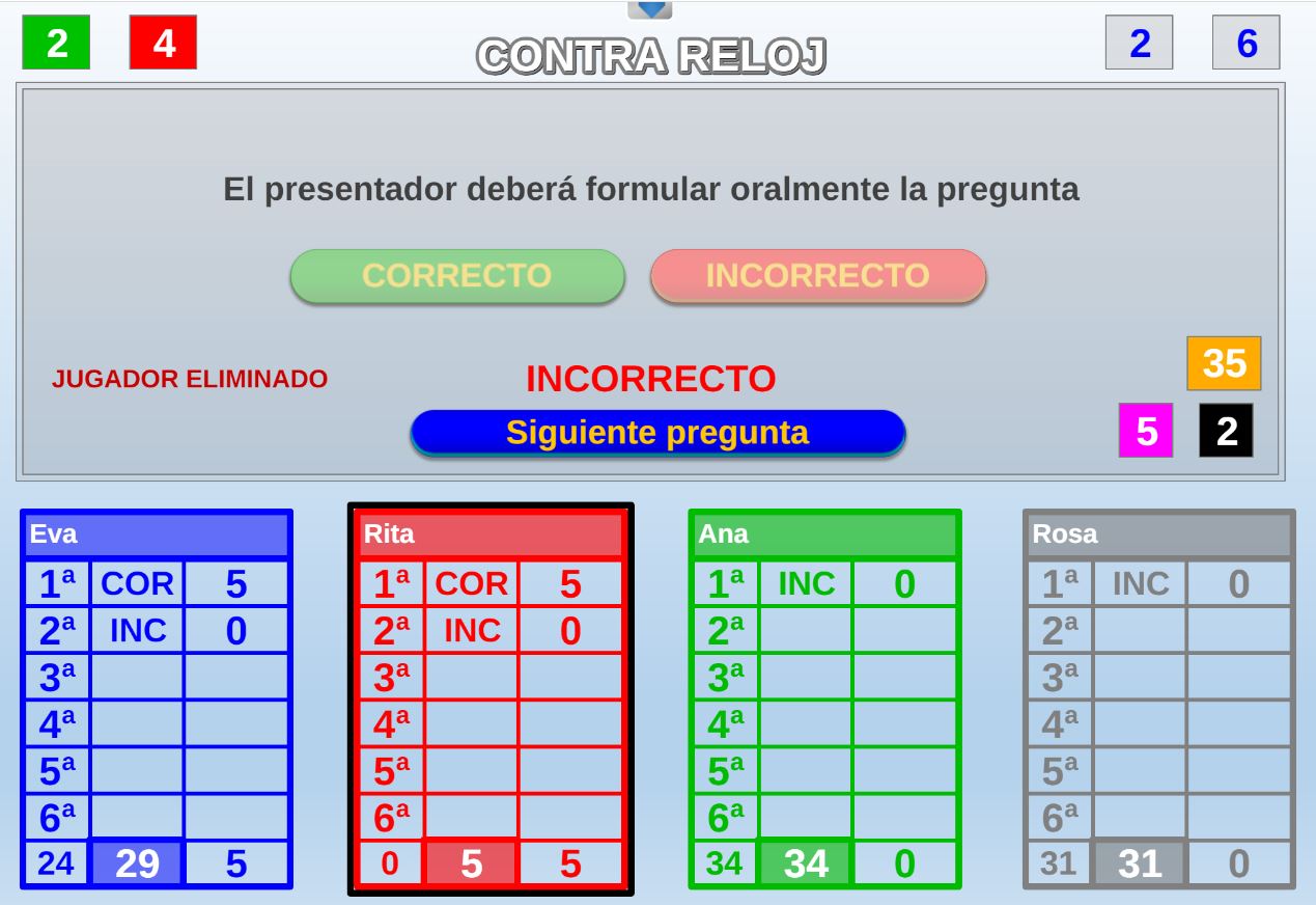 Juego en el que quedará como primer clasificado, aquel que más respuestas correctas consiga. Participan un total de 8 jugadores y el número de preguntas es modulable.