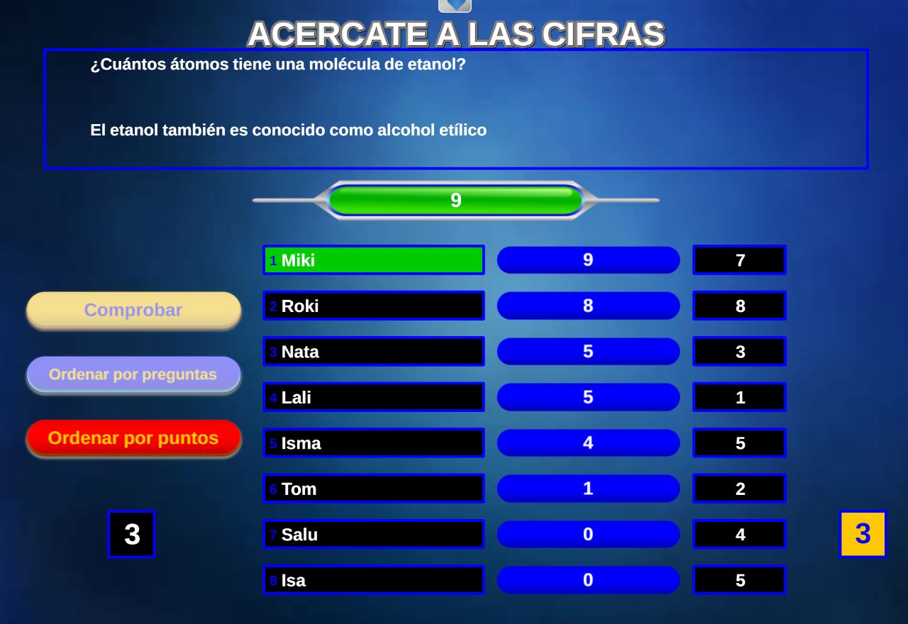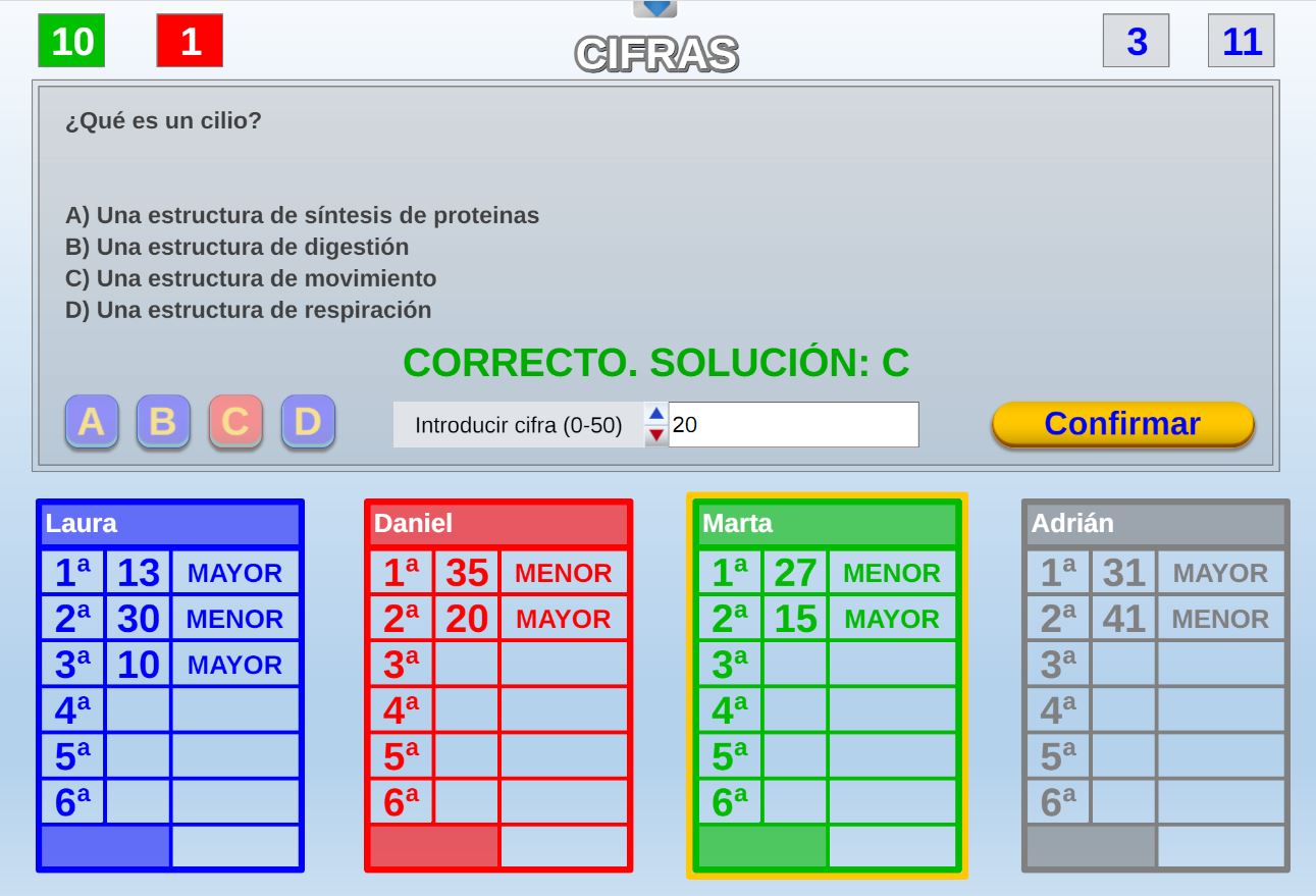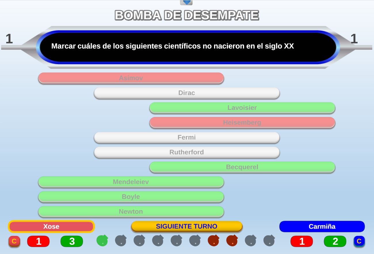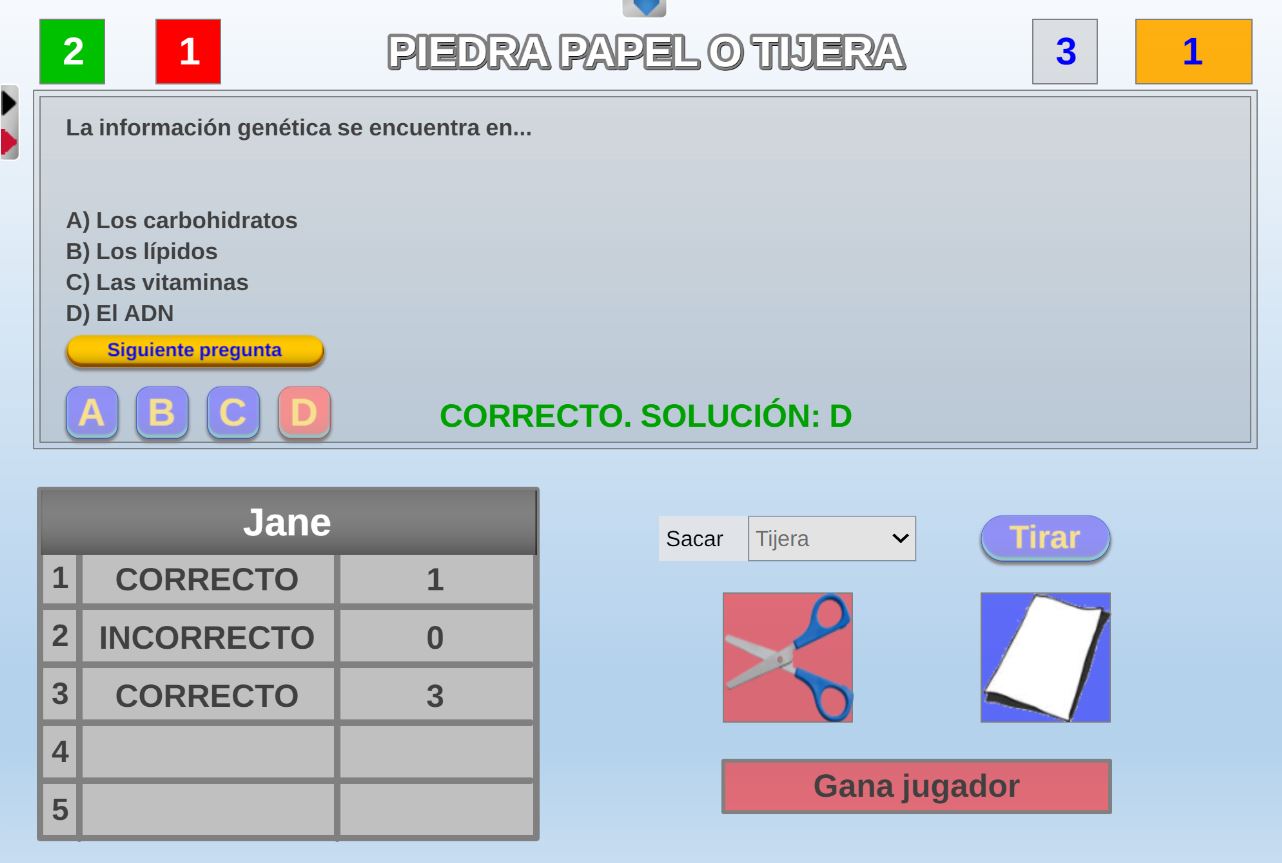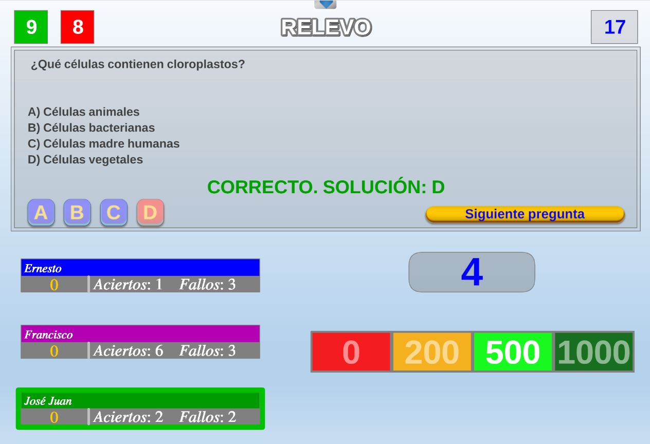 Juego en el que quedará como primer clasificado, aquel que más respuestas correctas consiga. Participan un total de 8 jugadores y el número de preguntas es modulable.