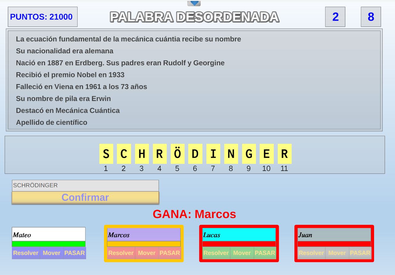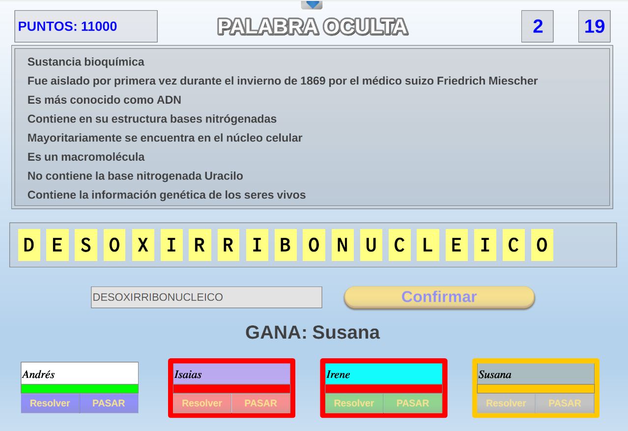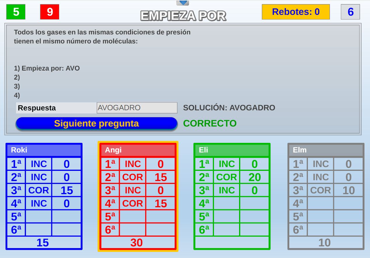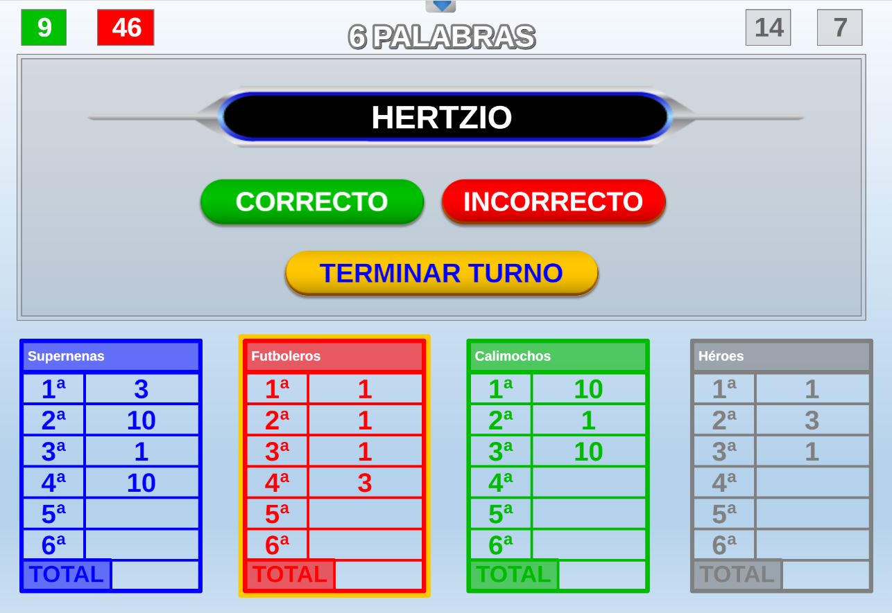 Juego en el que cada equipo participante jugará 6 rondas o palabras. Gana el equipo que al final de todas las rondas más palabras haya acertado.