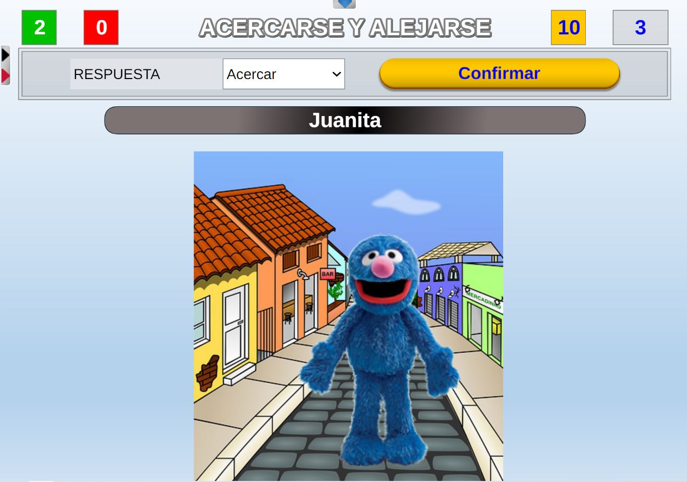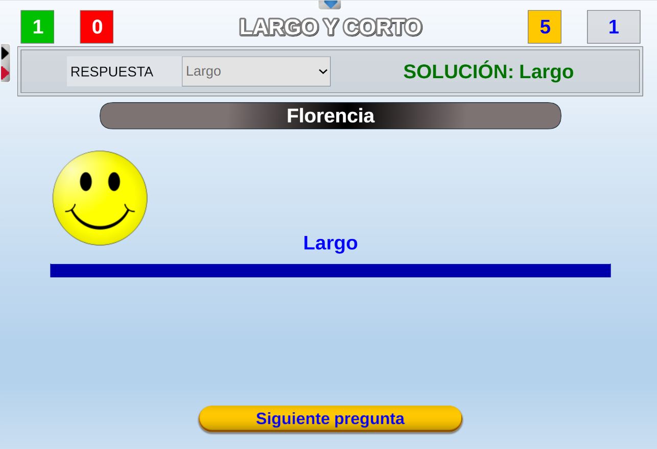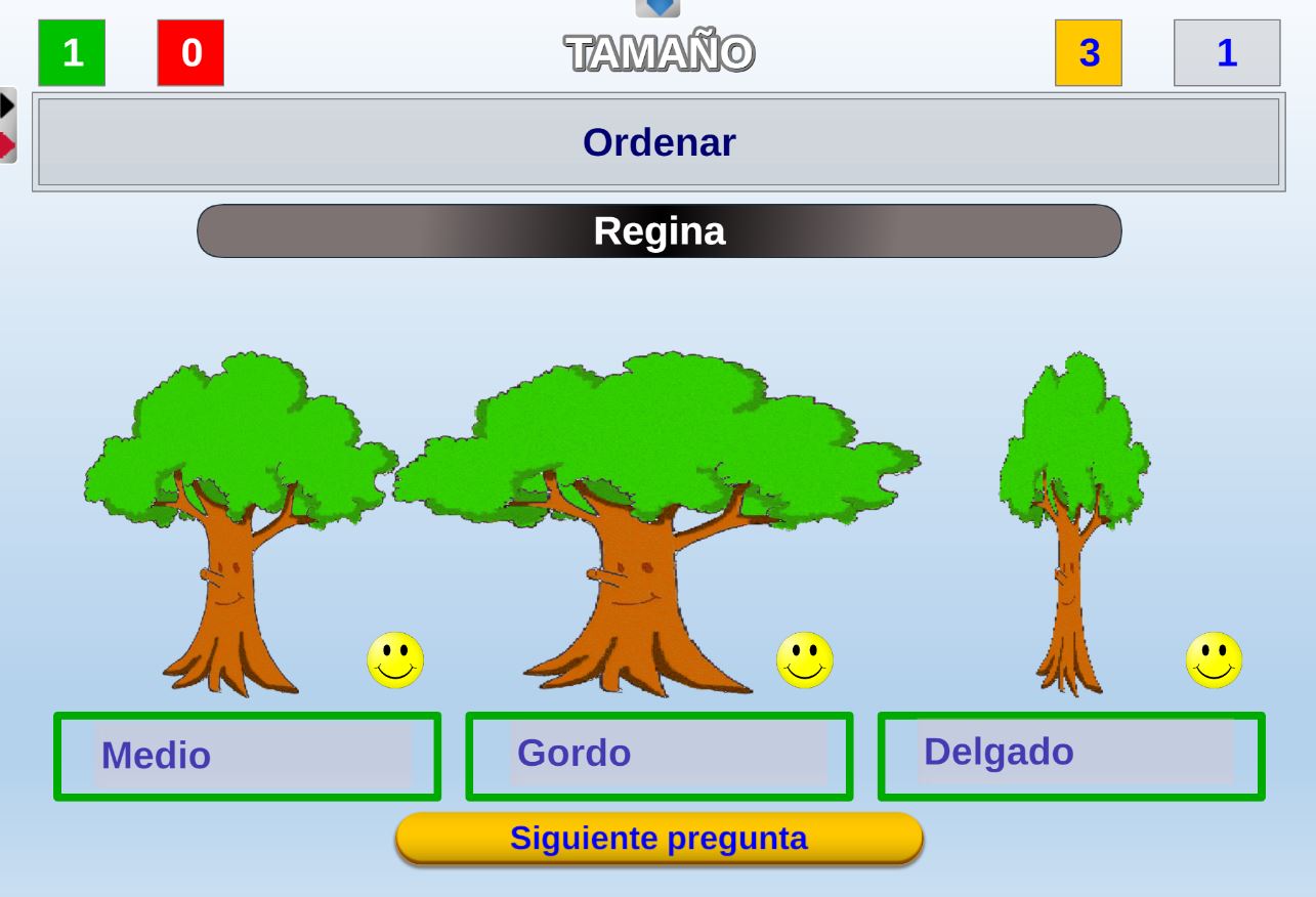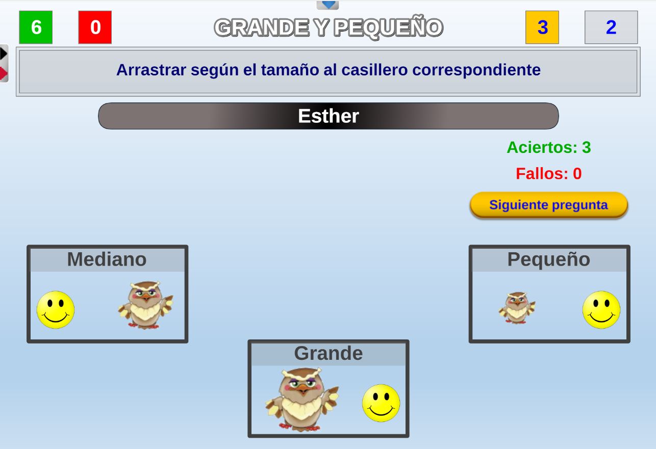 Juego diseñado para educación infantil para aprender jugando los conceptos de grande, mediano y pequeño. Las preguntas sobre estos conceptos las realiza el juego de forma aleatoria.