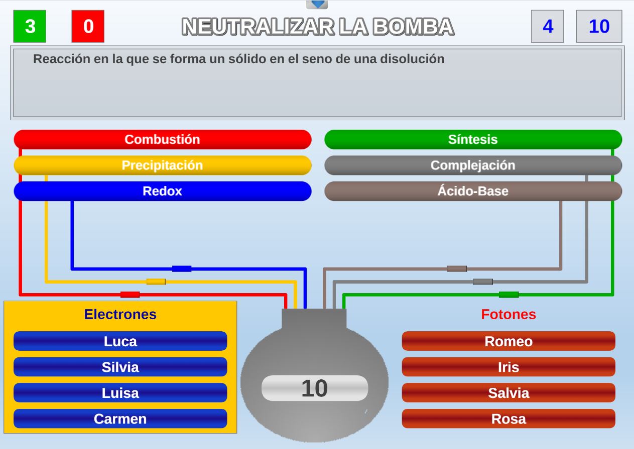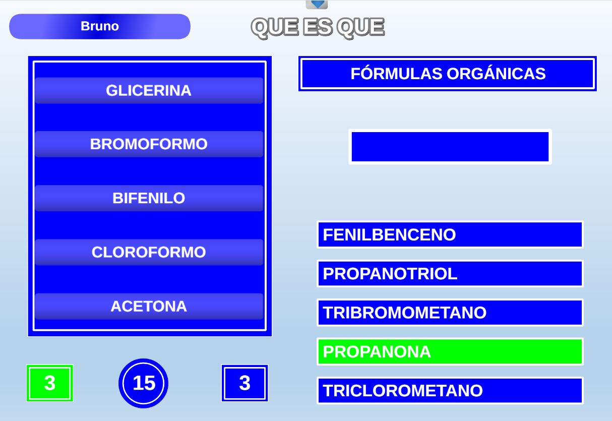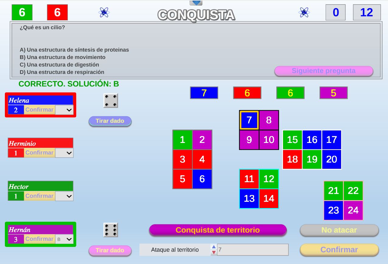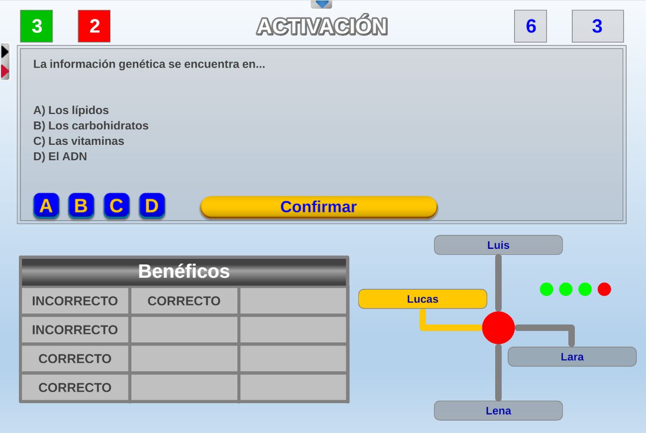 Versión del clásico juego del mismo nombre, consistente en tener tres fichas del mismo color en línea, pero en el que además también influyen los conocimientos.