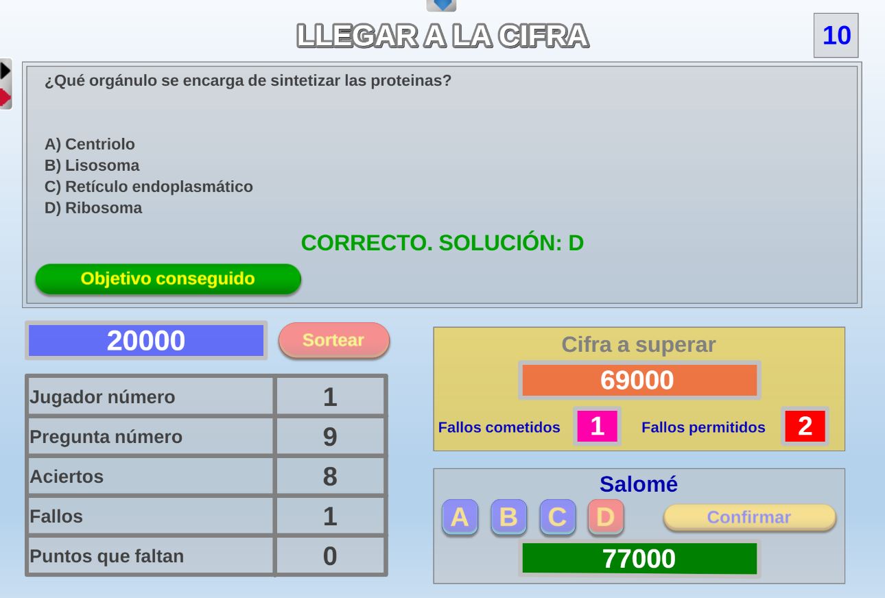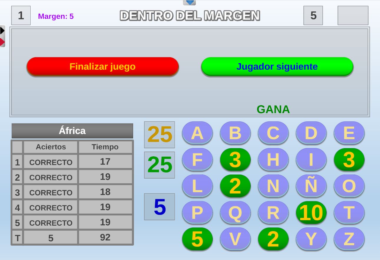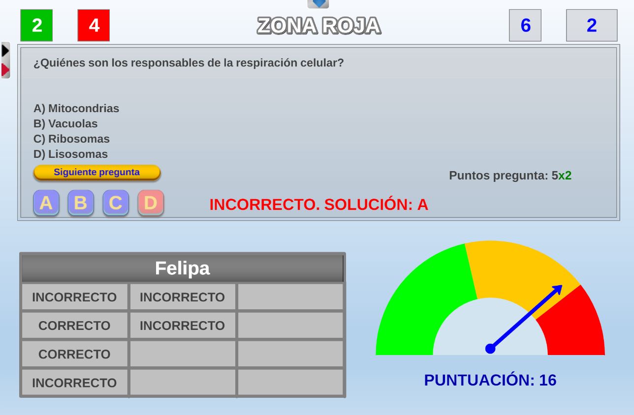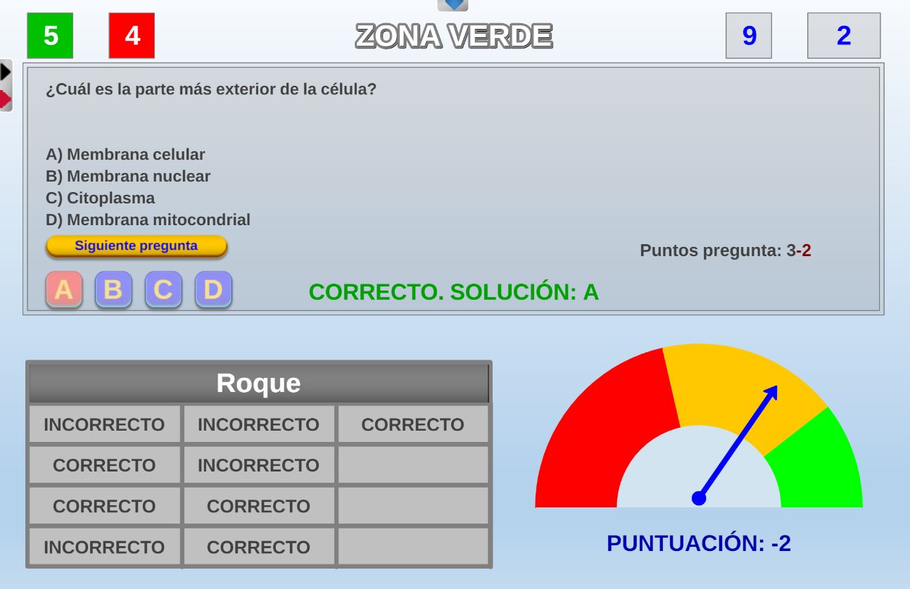 Juego cuyos participantes deberán intentar alcanzar la zona verde del marcador del juego con la máxima puntuación posible y evitar fallar preguntas.