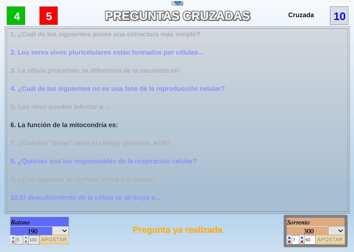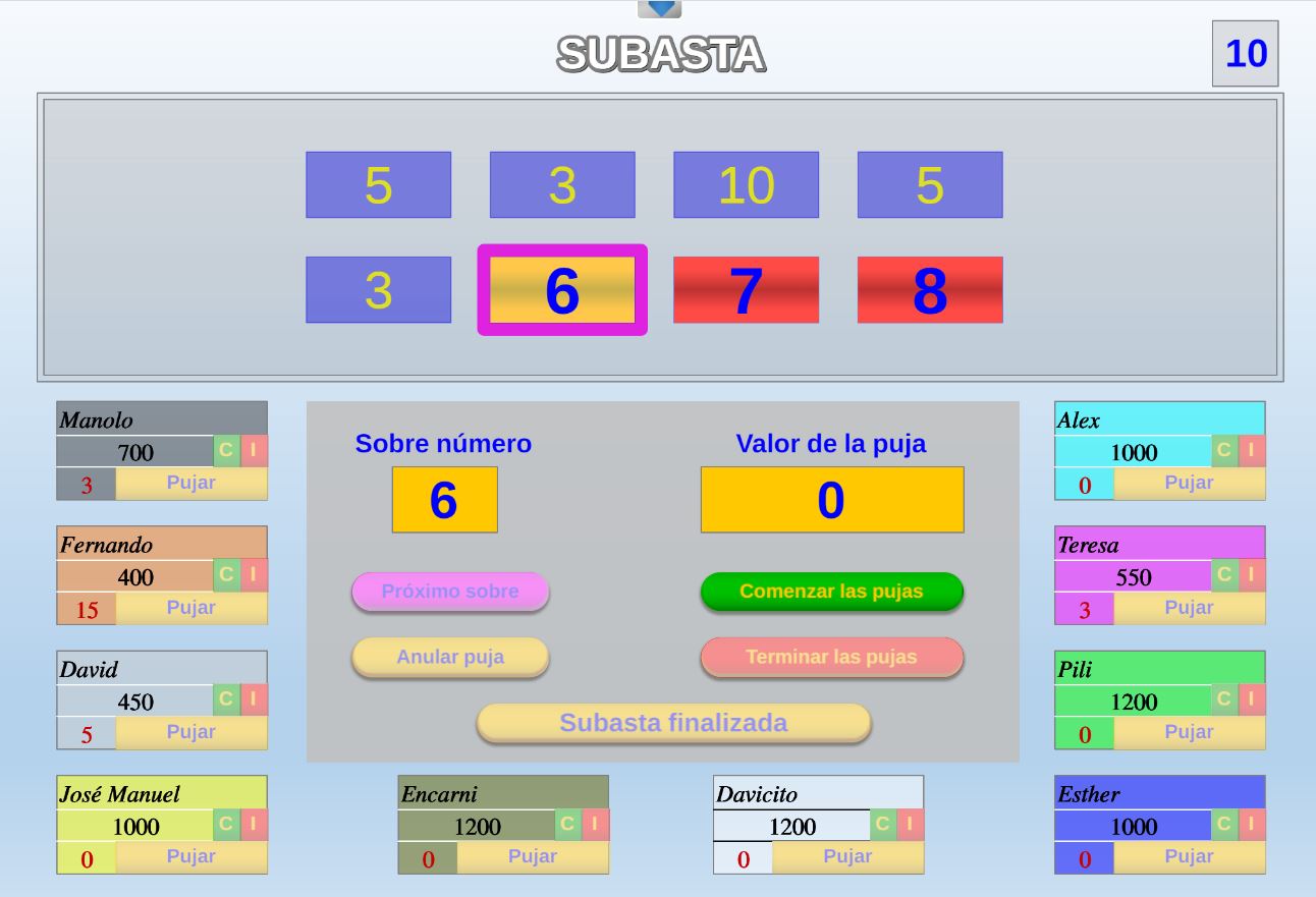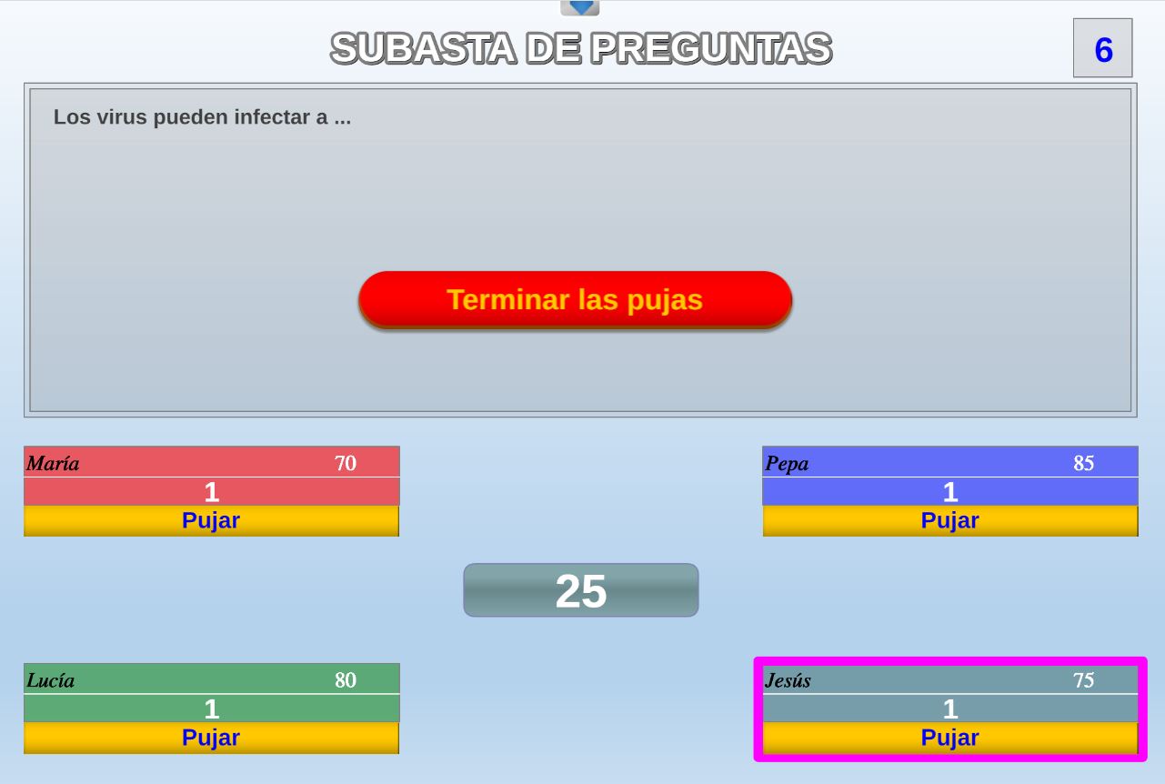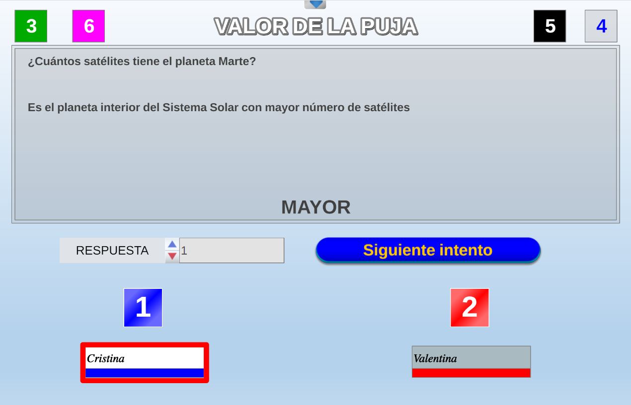 Juego que ganará el participante que más preguntas correctas conteste, pero para poder contestar a las preguntas deberá pujar por ellas.