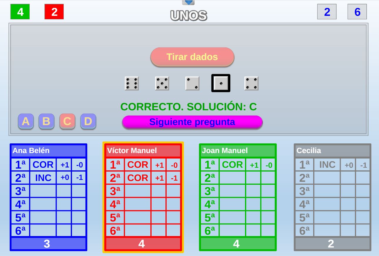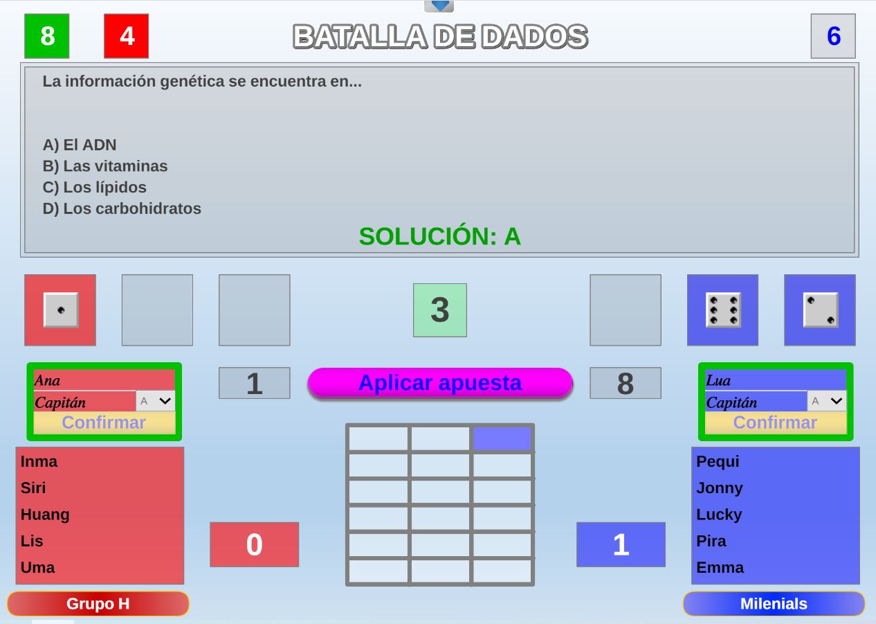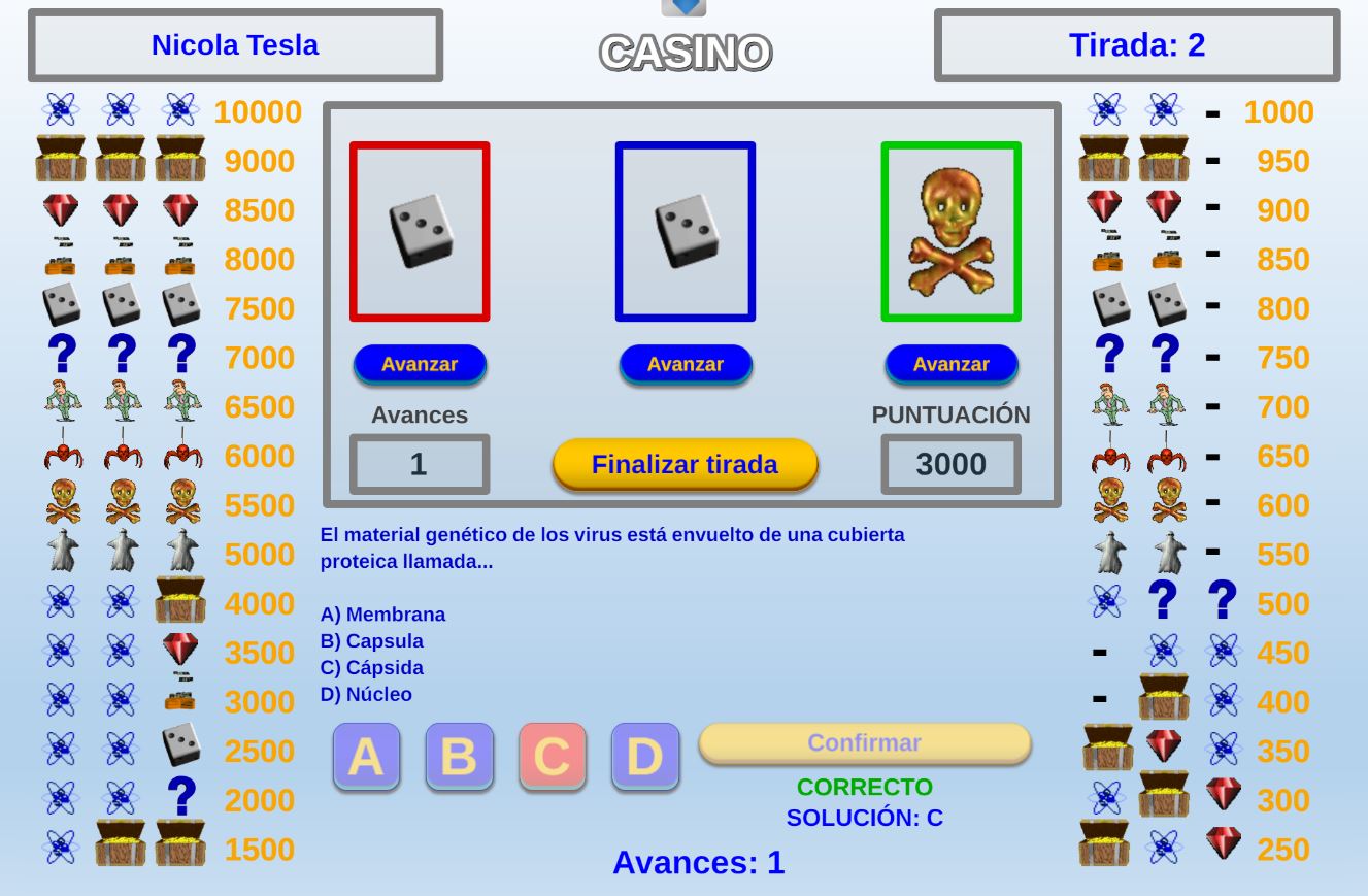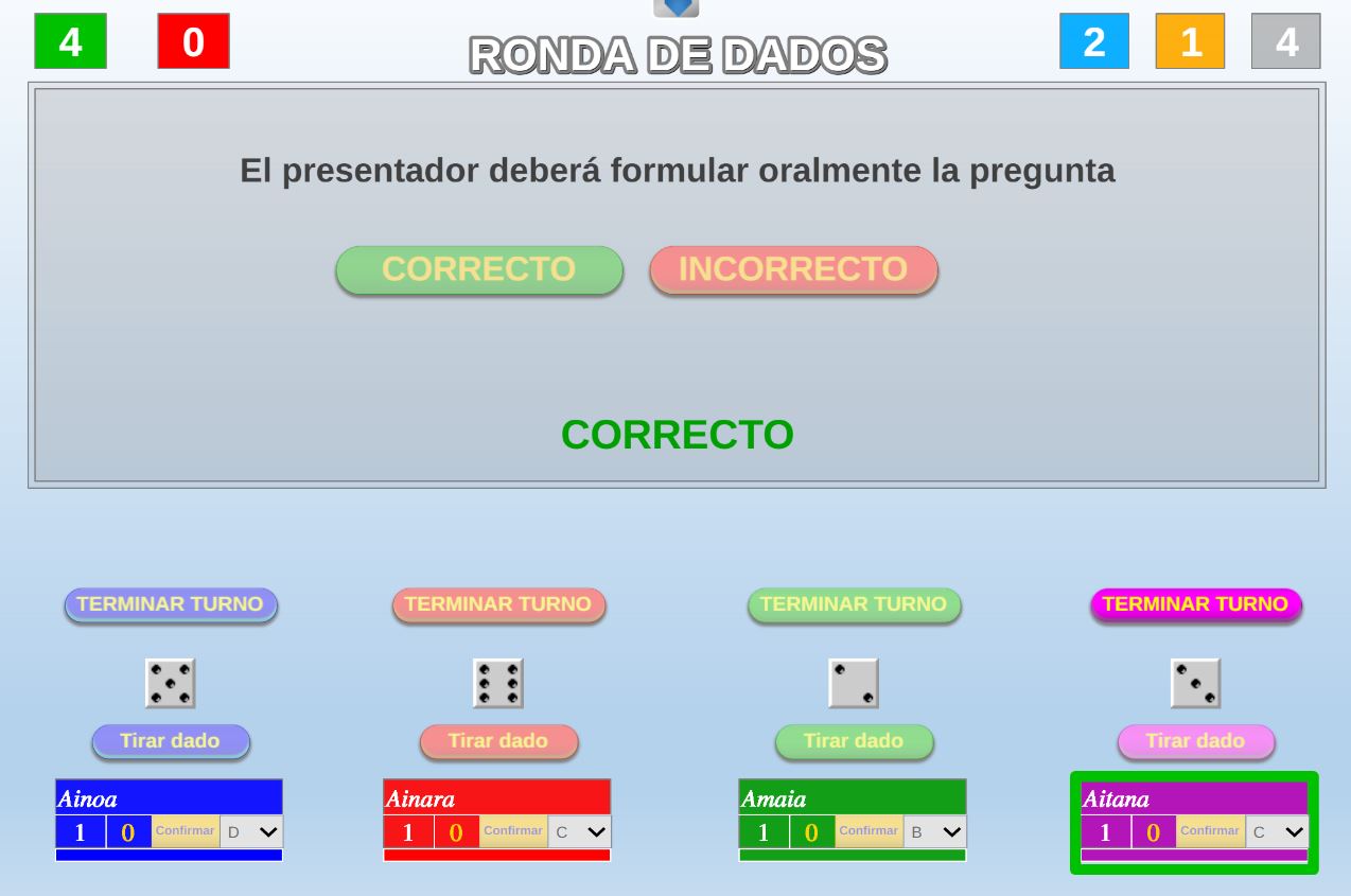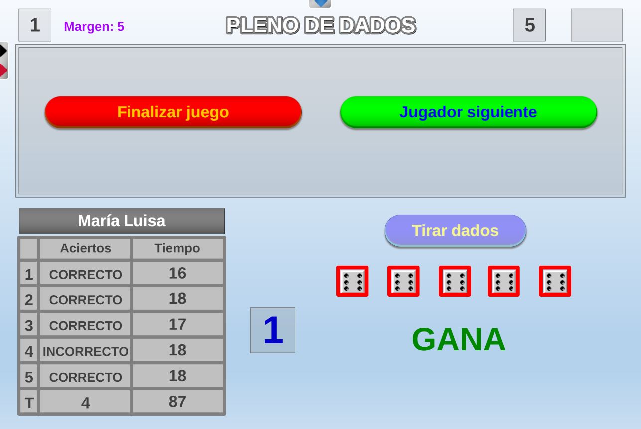 Juego cuyo objetivo es obtener la mayor puntuación posible en una tirada de dados. Por cada respuesta correcta el jugador podrá lanzar un dado, si acierta las cinco preguntas tirará cinco dados.