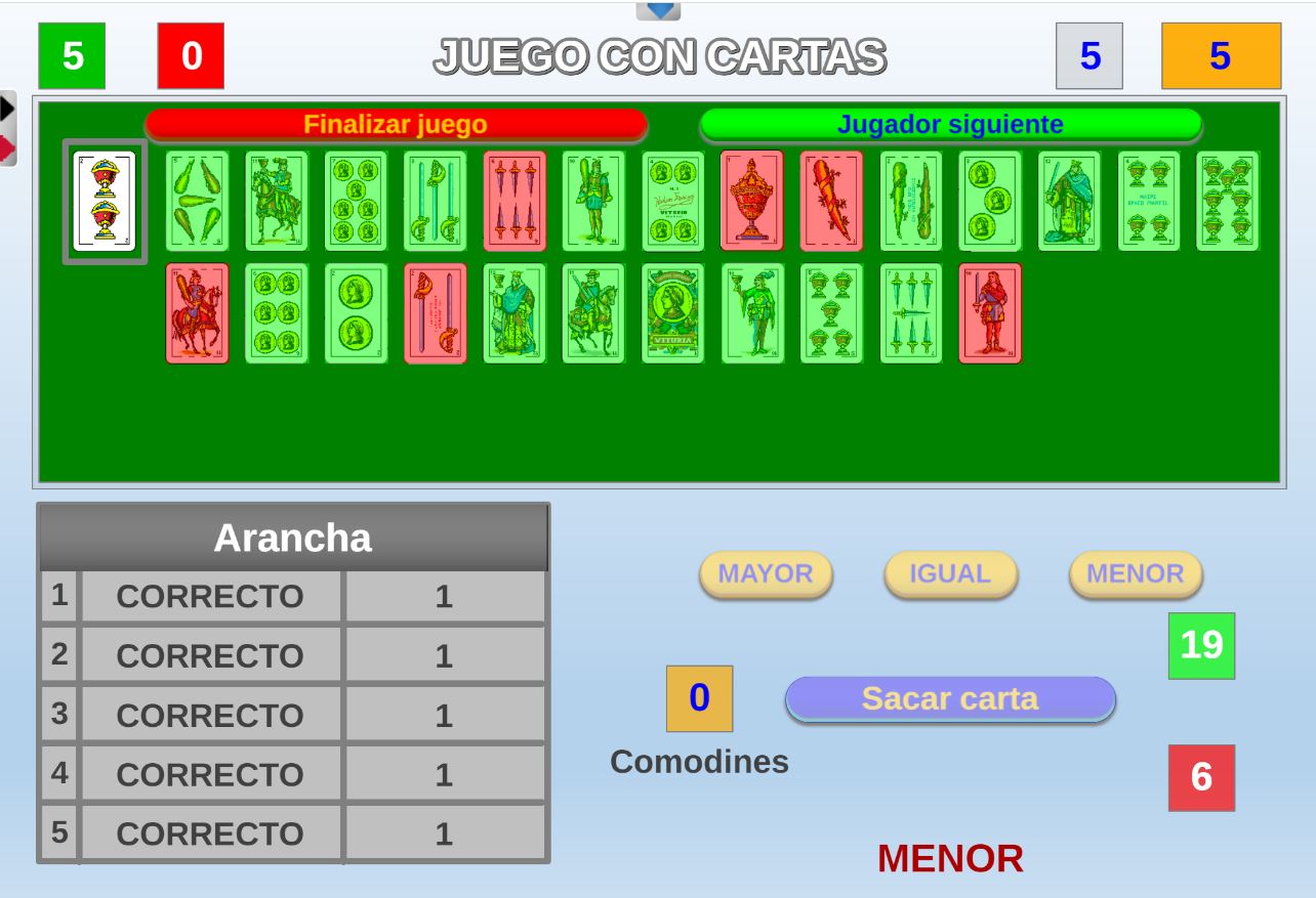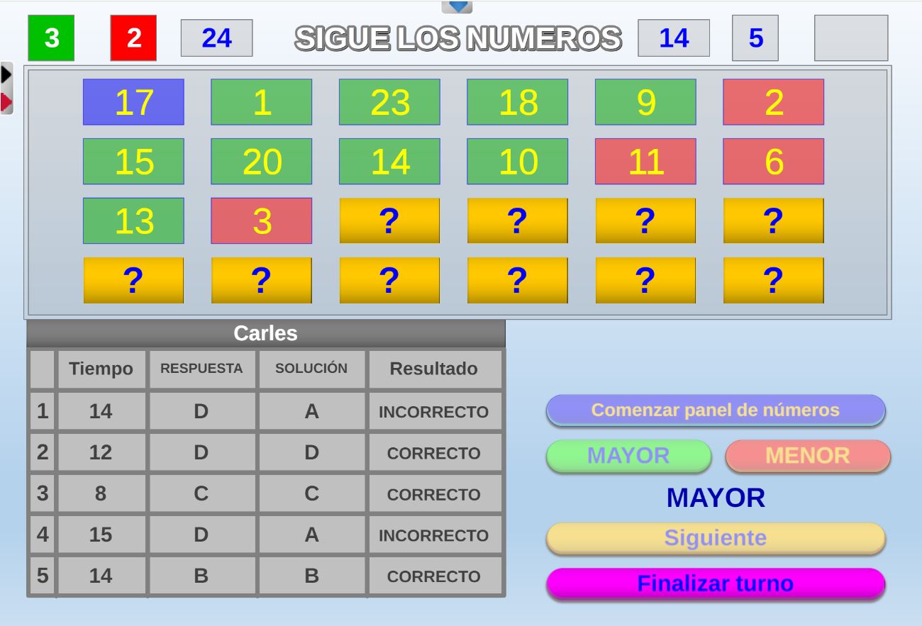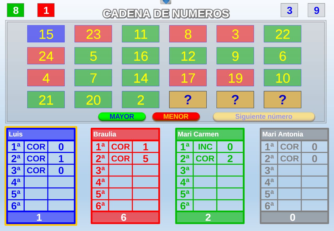 Juego que consiste en seguir una cadena de números enlazando unos con otros, averiguando si el siguiente será mayor o menor que el anterior.