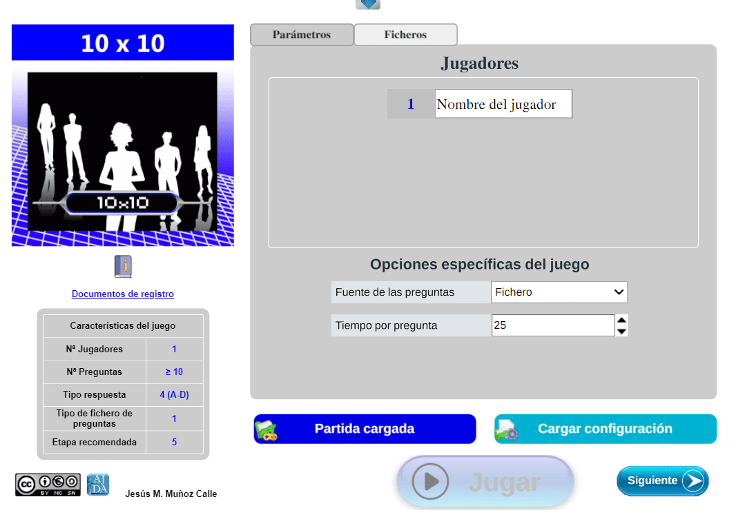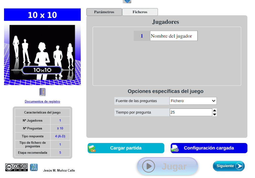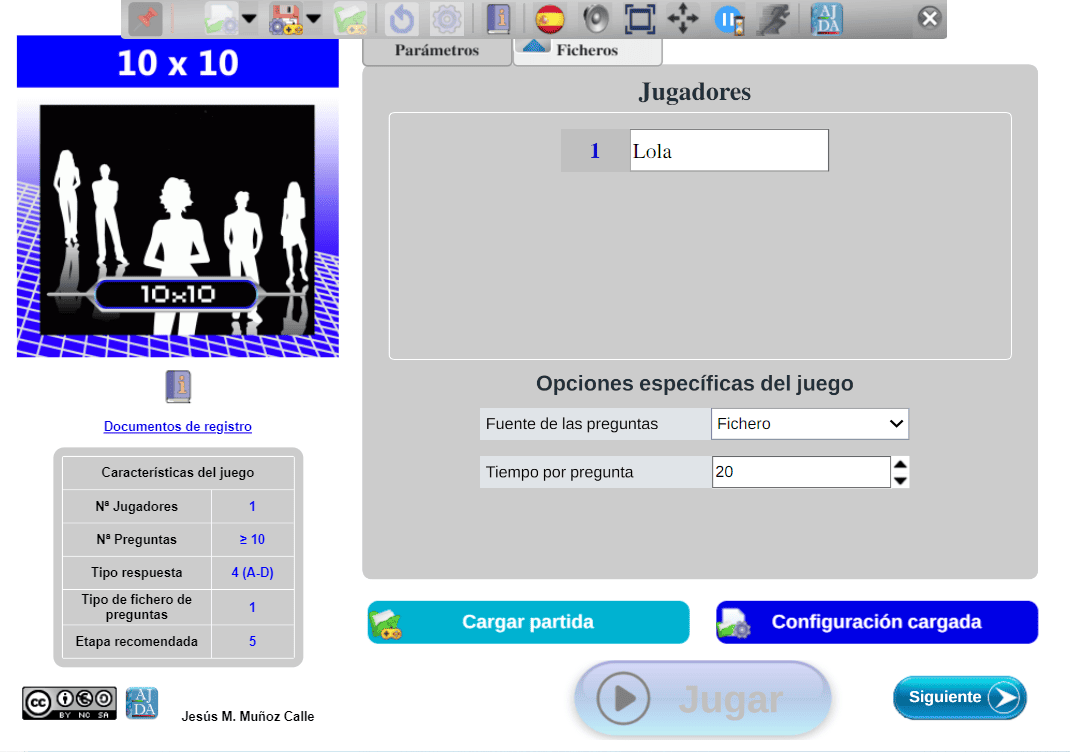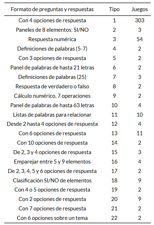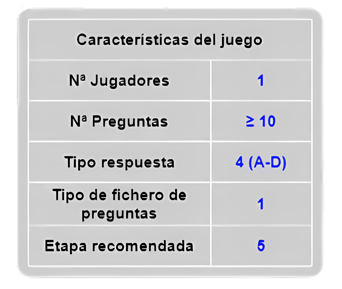 Tabla de datos. Contiene las principales características del juego: número de jugadores, de preguntas, tipo de respuestas, tipo de fichero de preguntas, etapa recomendada (infantil [1], primaria [2], secundaria [3], universitaria [4], general [5]).