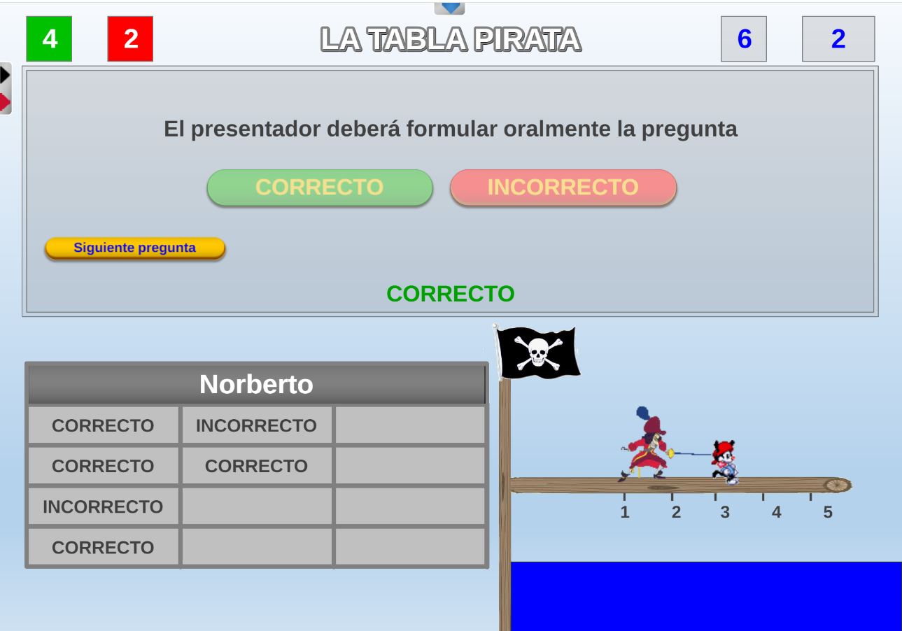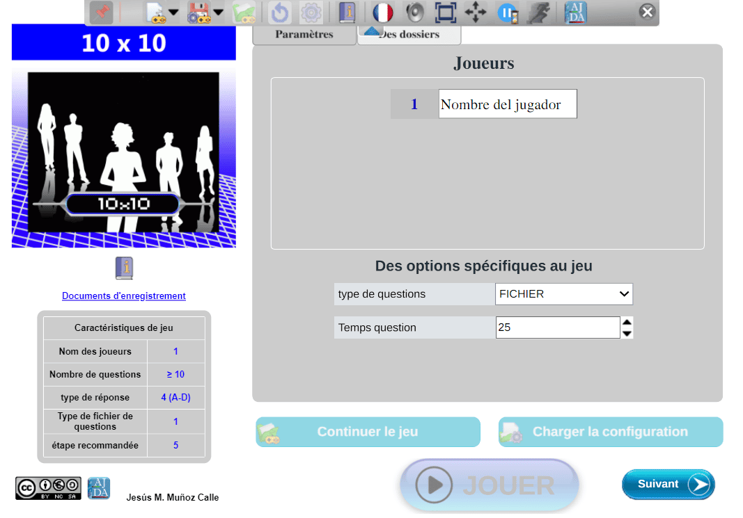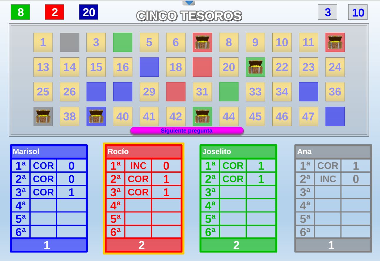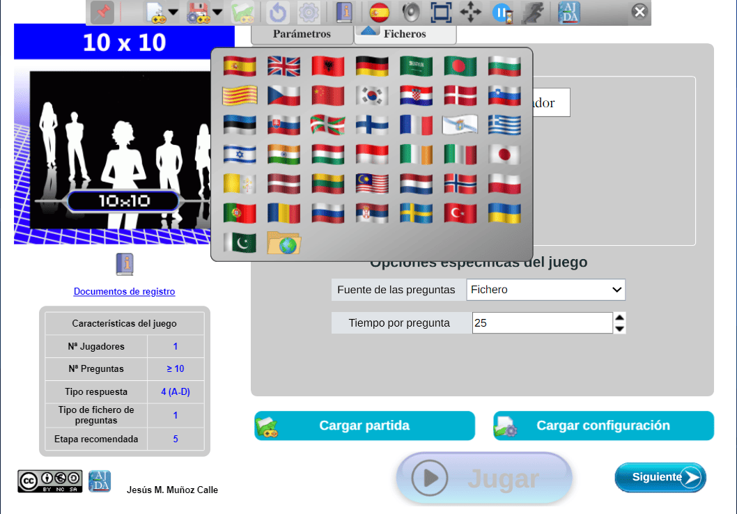 Tabla de datos. Contiene las principales características del juego: número de jugadores, de preguntas, tipo de respuestas, tipo de fichero de preguntas, etapa recomendada (infantil [1], primaria [2], secundaria [3], universitaria [4], general [5]).