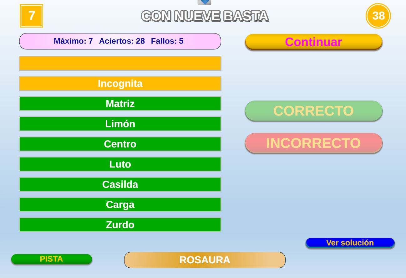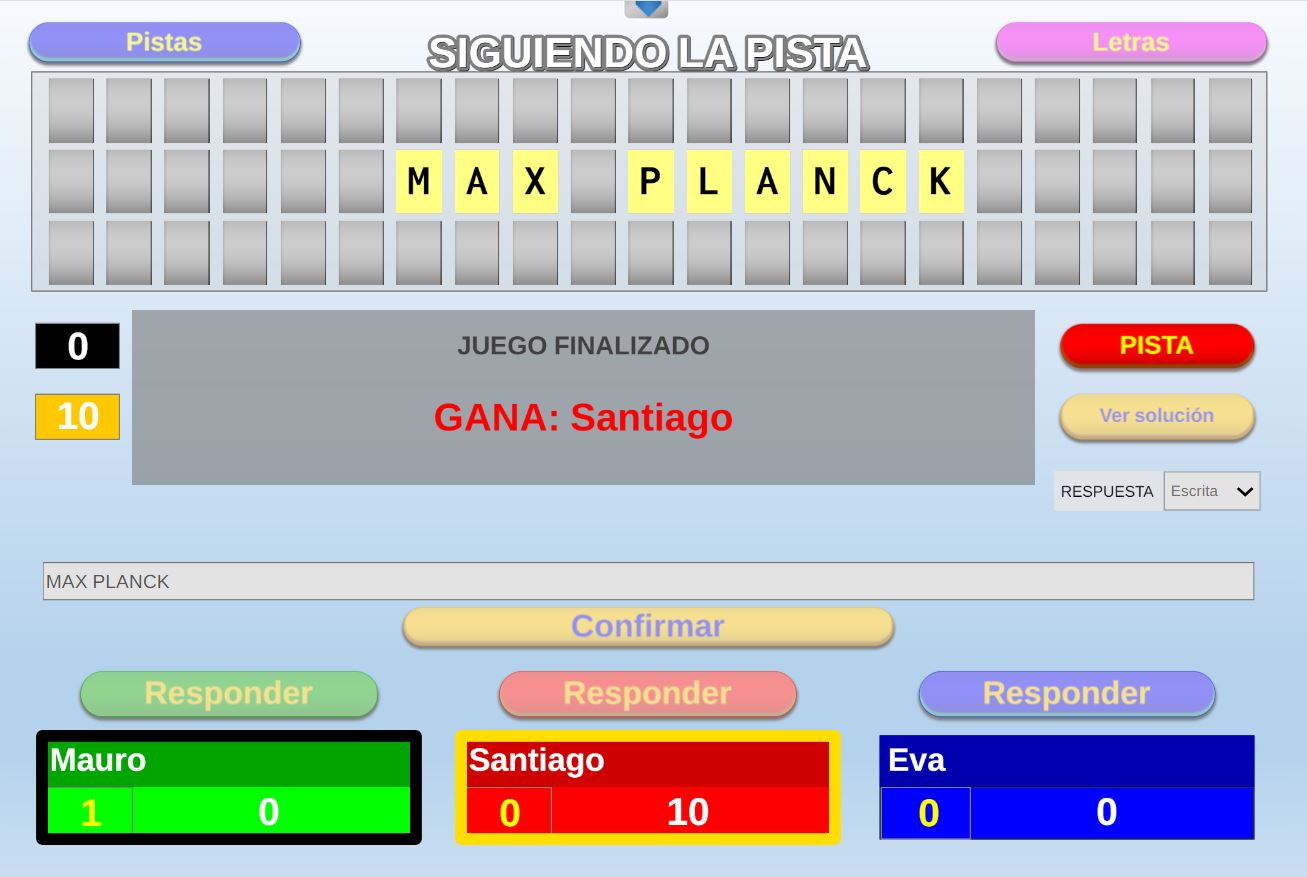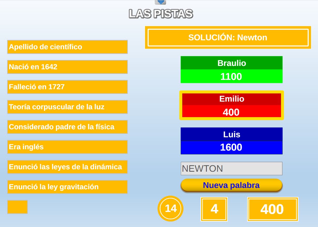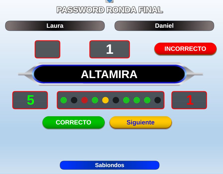 Versión de una de las pruebas del concurso de TV "Saber y Ganar" que consiste en acertar una palabra o frase oculta a partir de una serie de pistas.