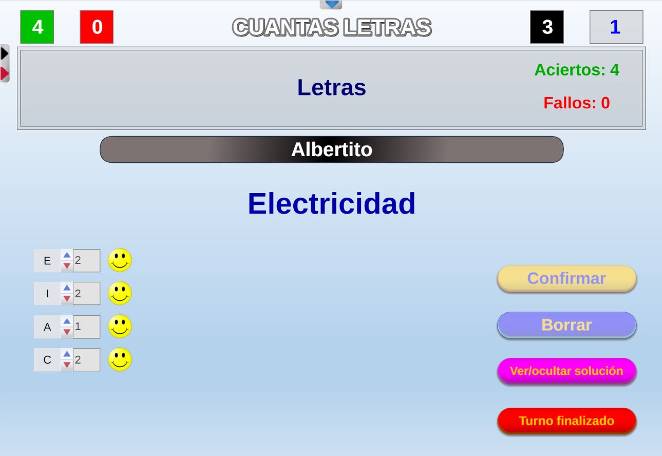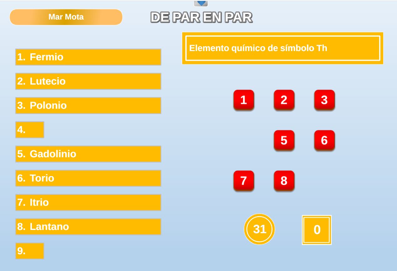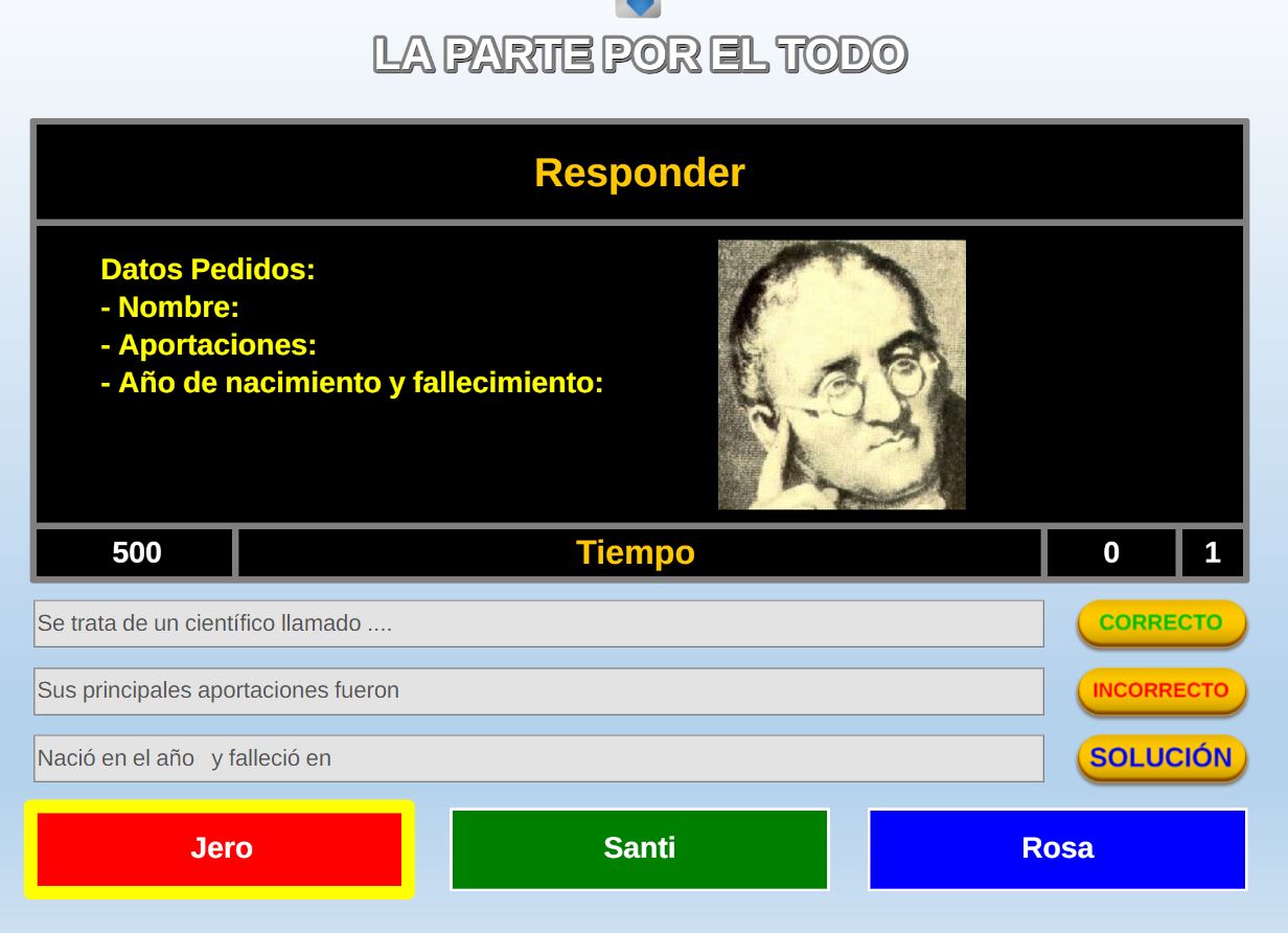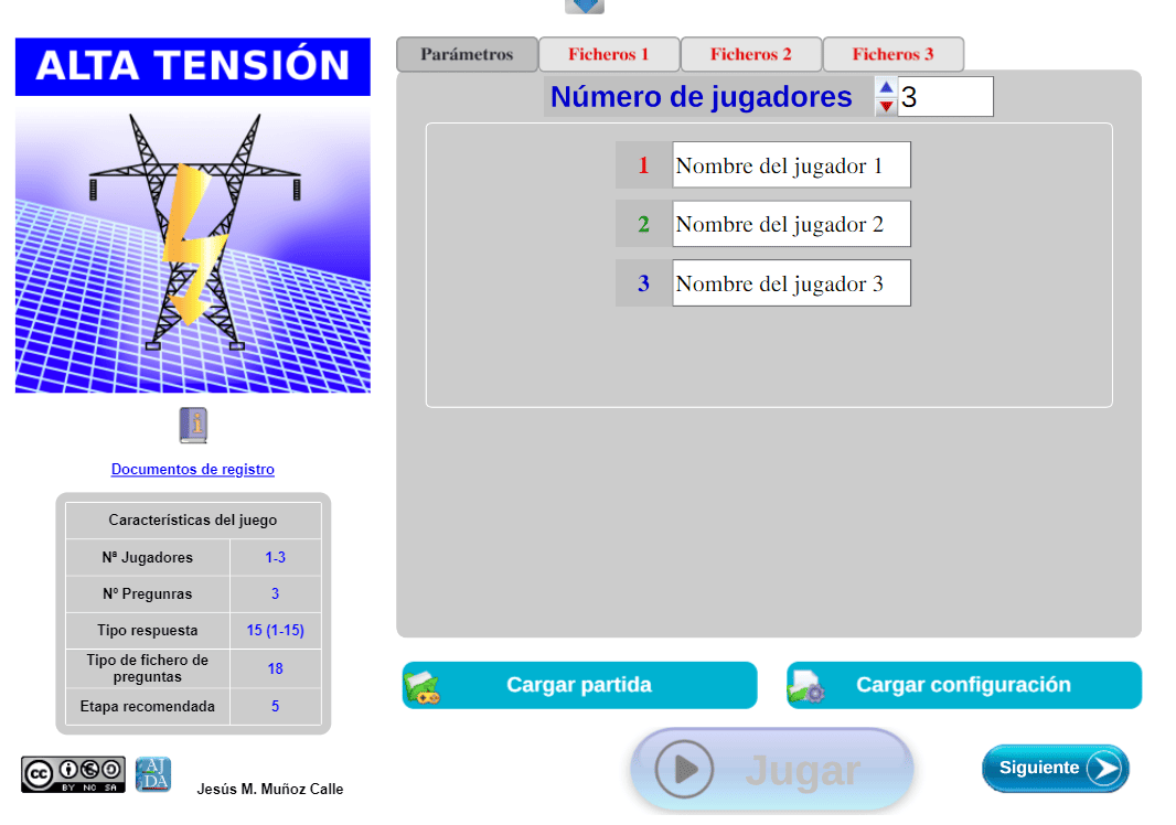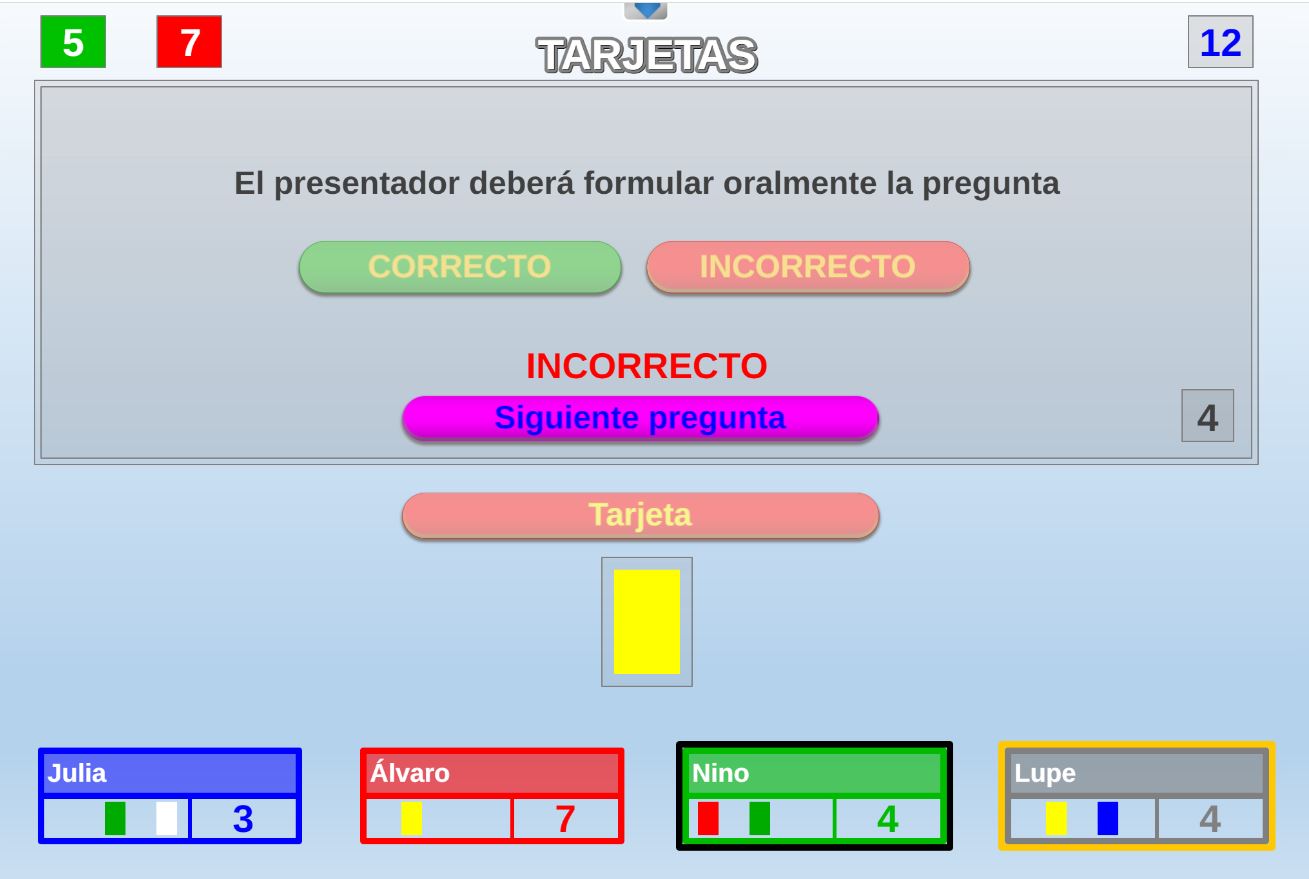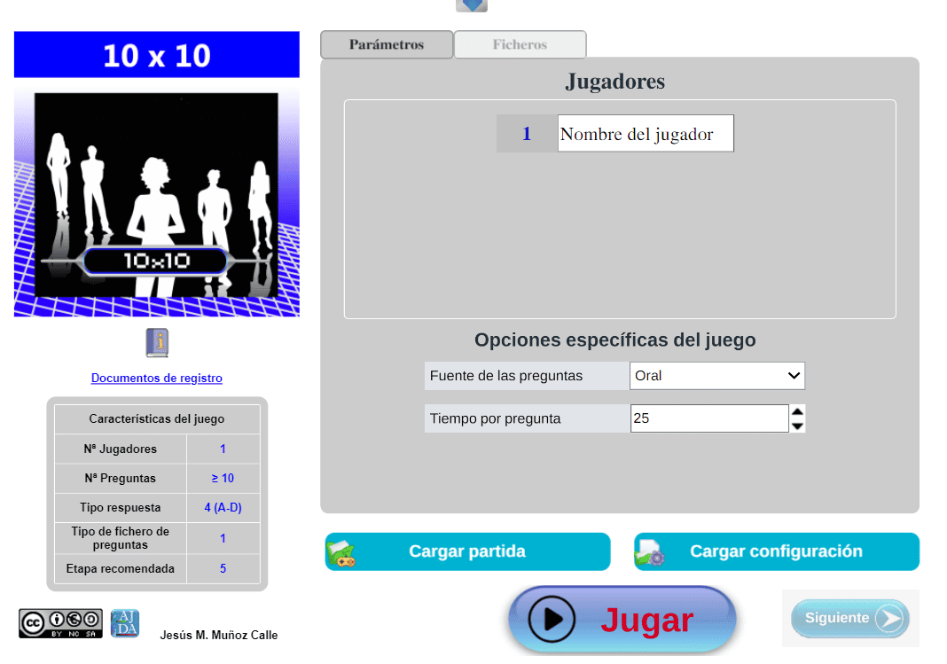 La primera de las pestañas superiores de navegación es la de Parámetros y está presente en todos los juegos. A través de ella se introducen los nombres de los jugadores y equipos, así como las opciones o parámetros específicos propios de cada uno. Hay juegos que no tienen ninguno y otros que tienen varios como: tiempo para responder, número de preguntas, número de comodines, sorteo de orden de comienzo de los jugadores, número de pistas, etc.