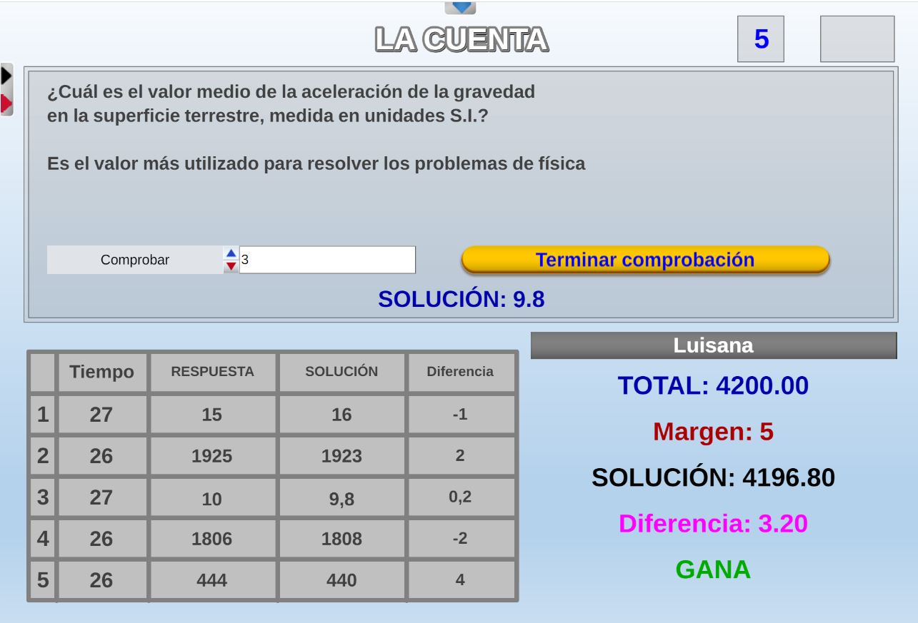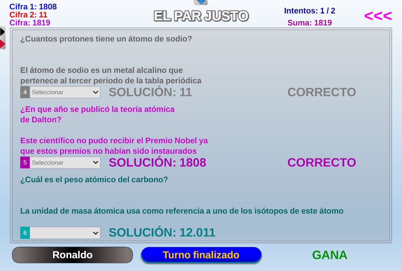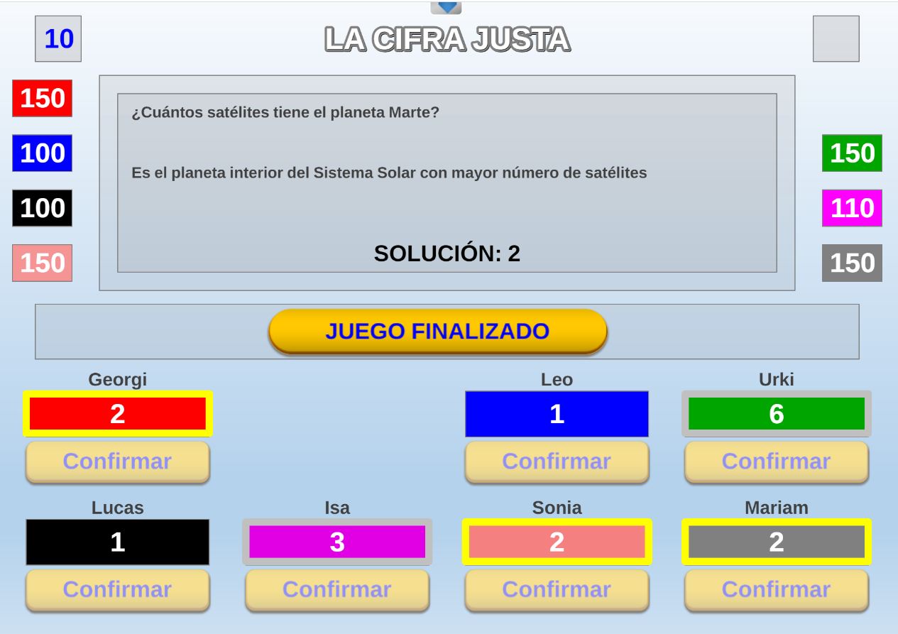 Versión del juego homónimo del programa "El precio justo". Objetivo: asociar correctamente las respuestas numéricas a sus correspondientes cuestiones.