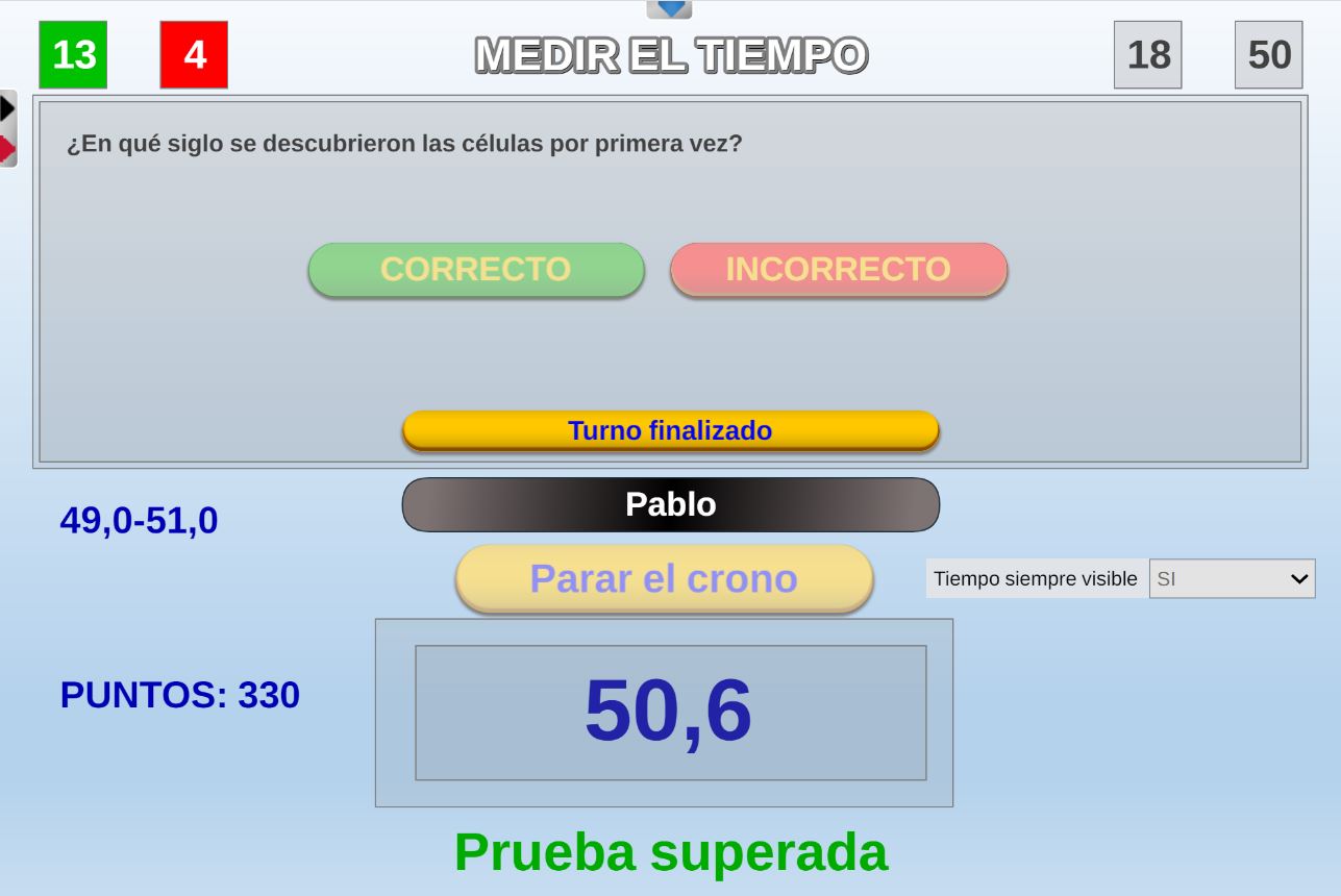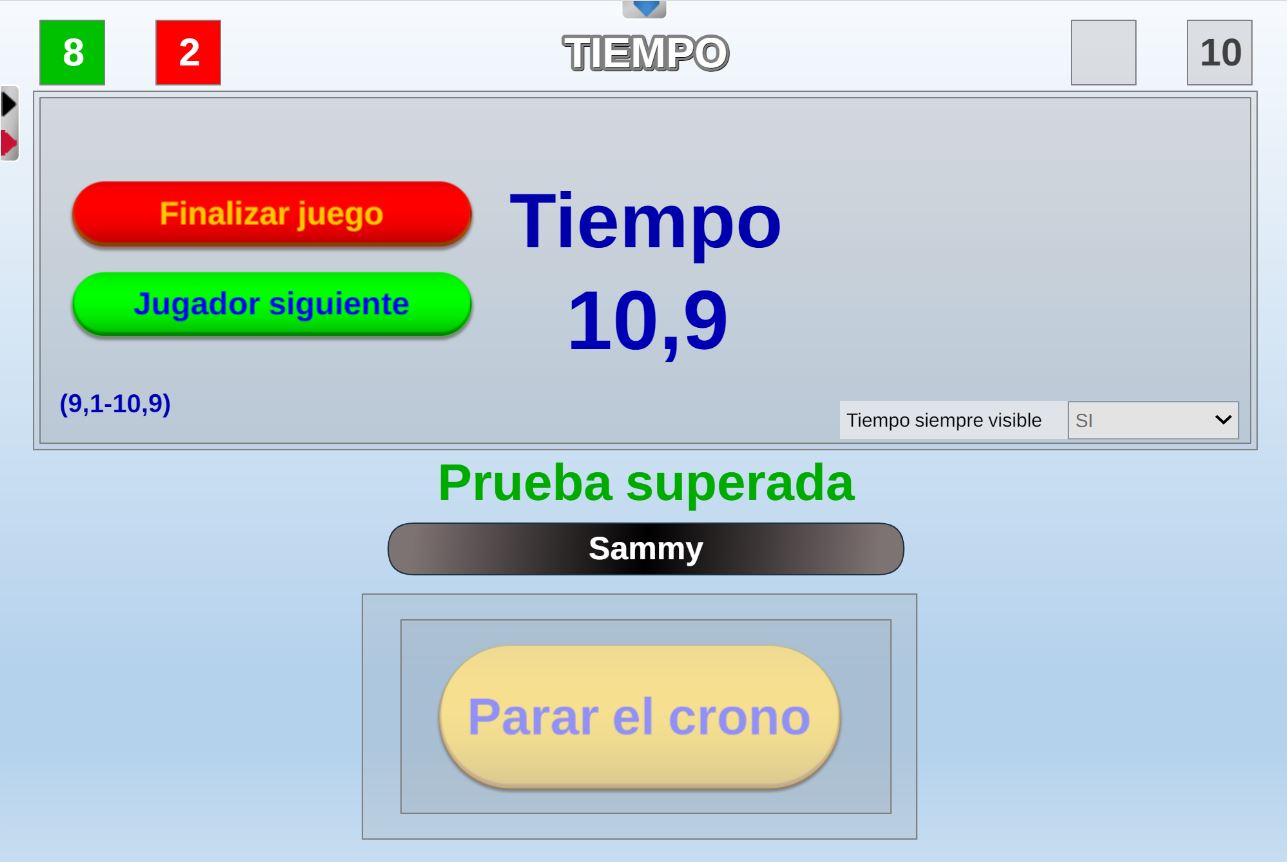 Juego que consiste en parar el cronómetro dentro de un margen de tiempo determinado, siendo mayor el margen de tiempo cuantas más preguntas se acierten.