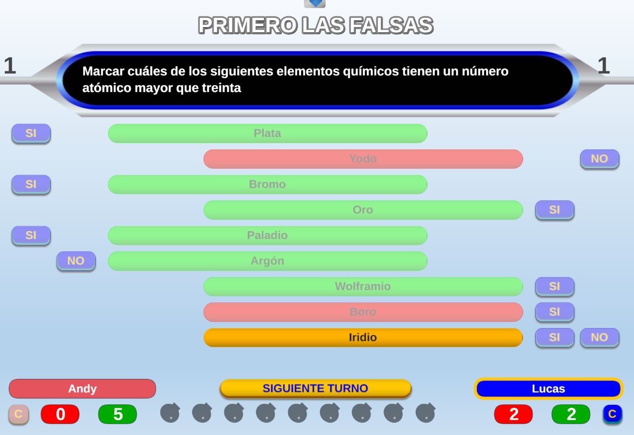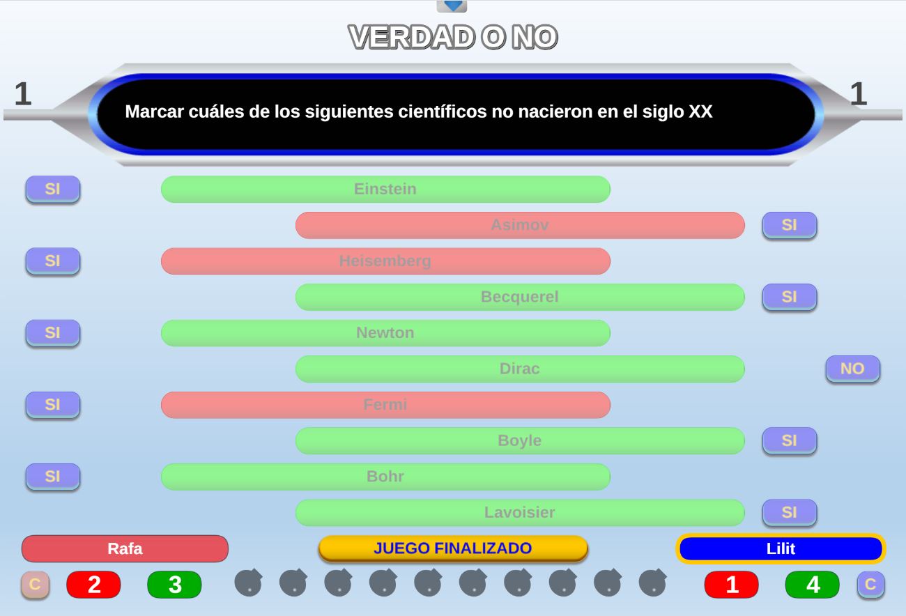 Juego clásico y de concurso de TV en el que los participantes deberán acertar por turnos si las opciones que se les plantean son verdaderas o falsas.