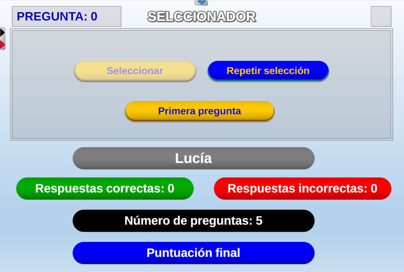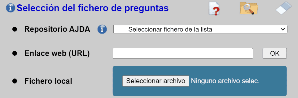 Además, en la parte superior derecha se ofrecen tres controles relacionados con la selección de ficheros de preguntas: