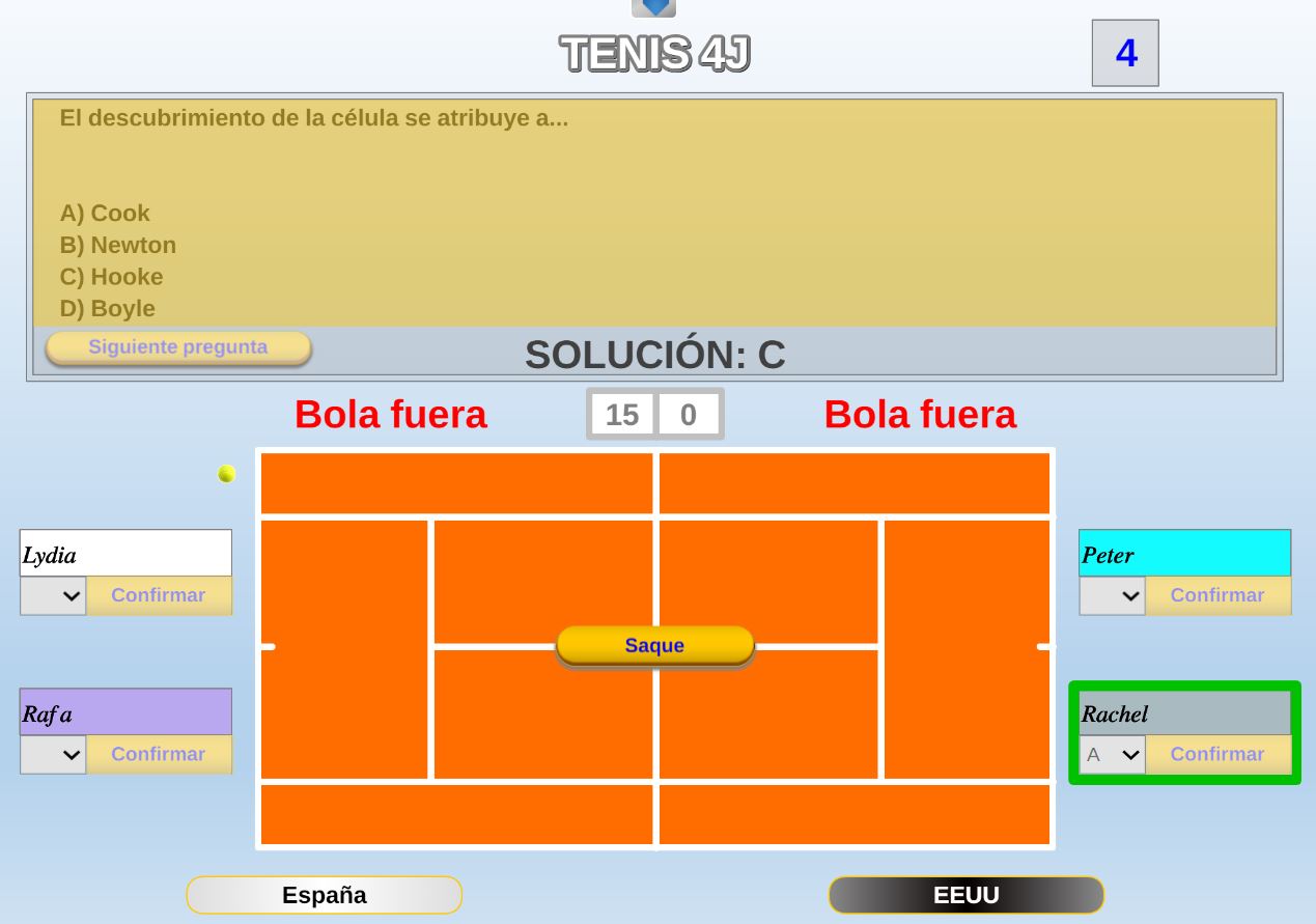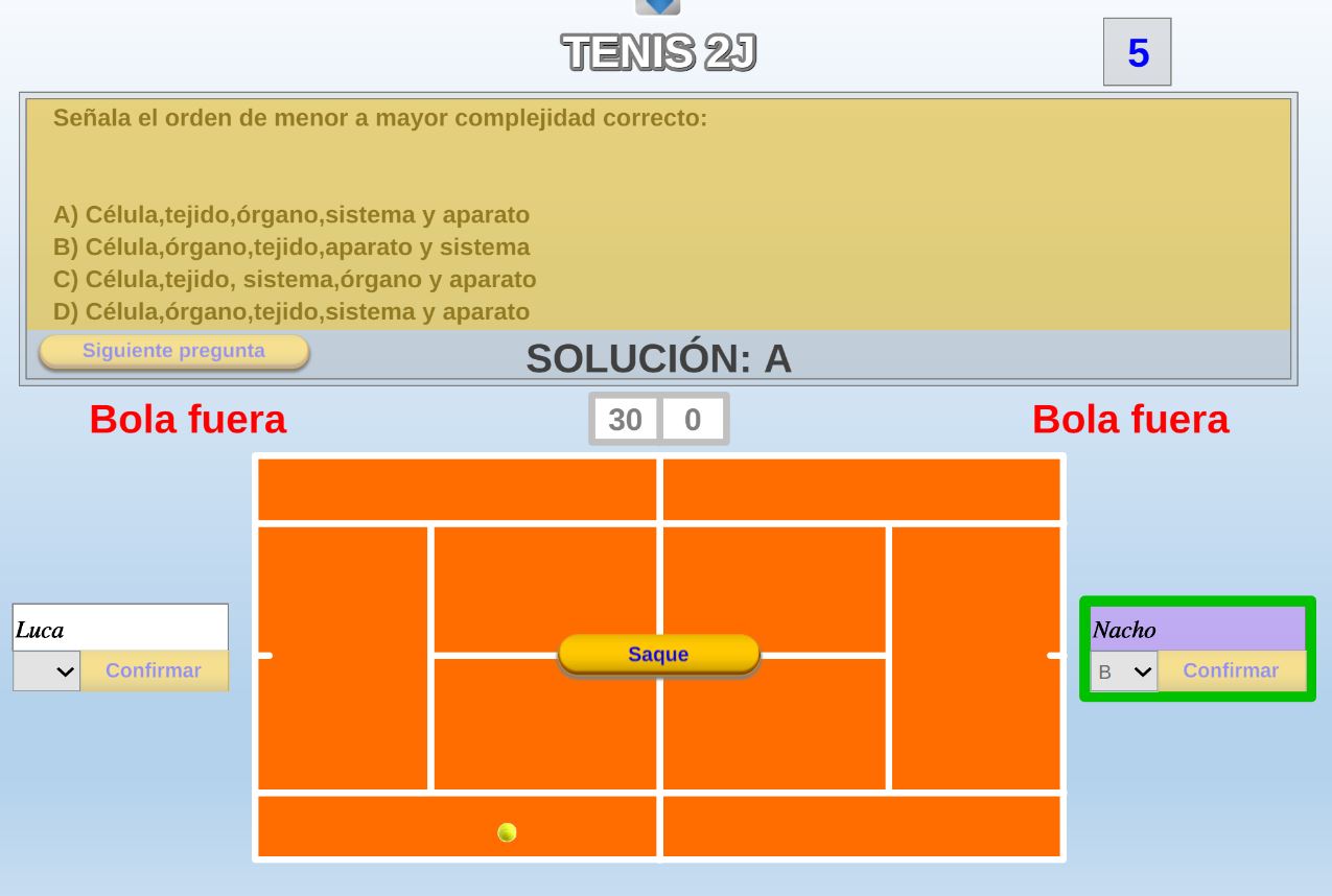 Juego en el que los contendientes disputan una partida de tenis dobles, en la que los aciertos y fallos en la pista están relacionados con los de las cuestiones que se plantean a los jugadores.