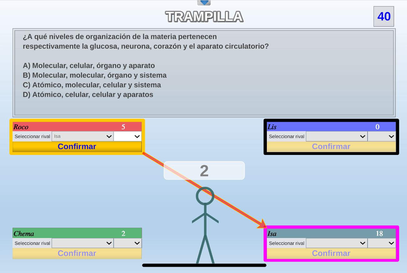 Juego en el que varios participantes se enfrentan en duelos cruzados y para ganar hay que evitar caer por la trampilla e intentar que los oponentes caigan.
