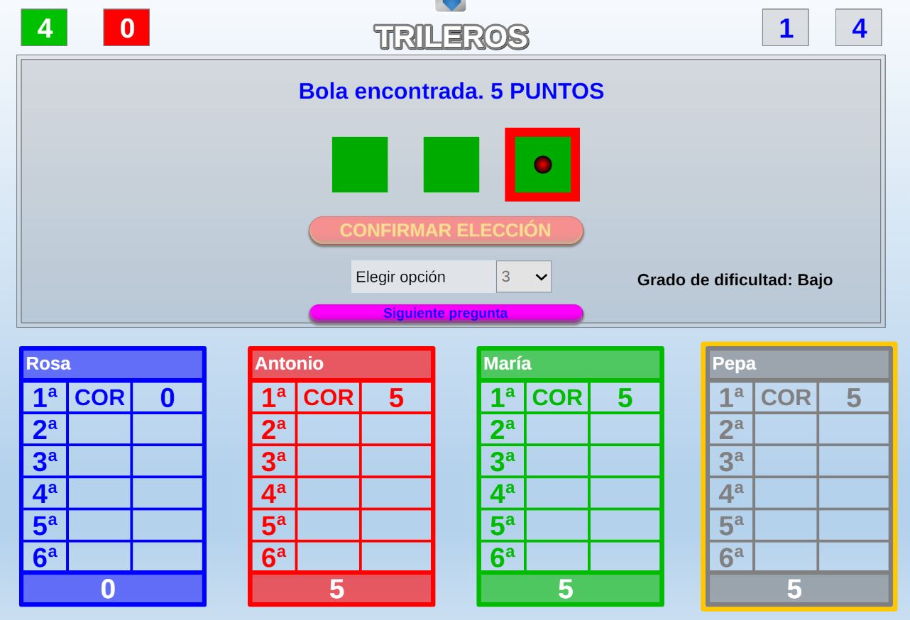 Juego en el que pueden participar hasta cuatro jugadores que deberán conseguir tres bolas del mismo color para ganar antes que sus oponentes.