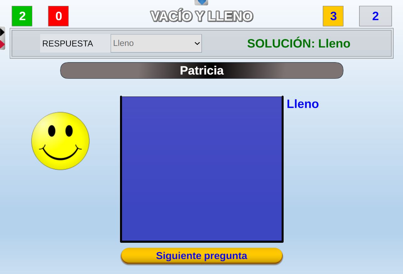 Juego diseñado para educación infantil para aprender jugando los conceptos de vacío y lleno. Las preguntas sobre estos conceptos las realiza el juego de forma aleatoria.