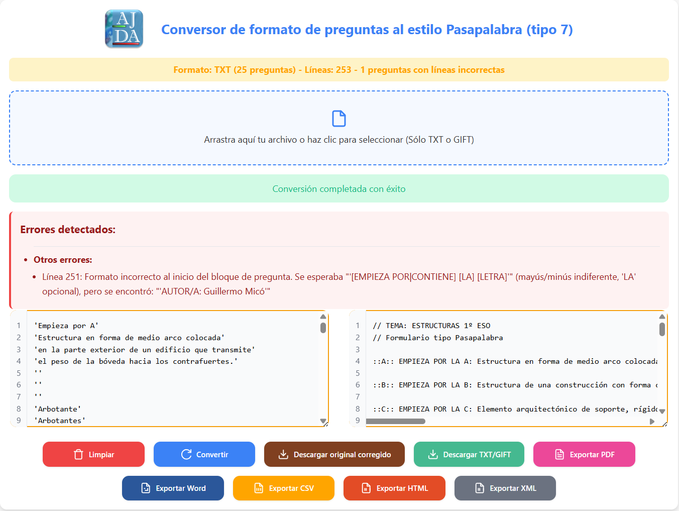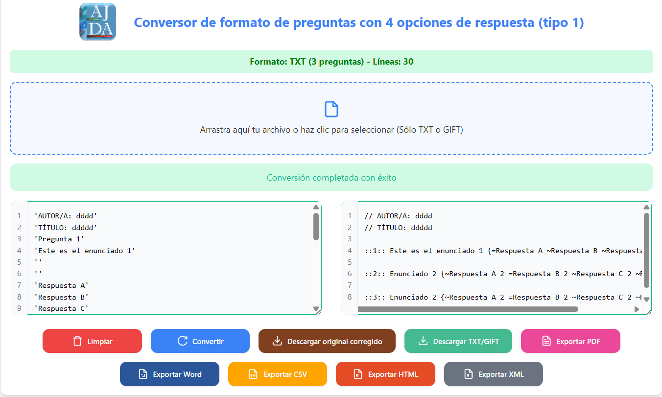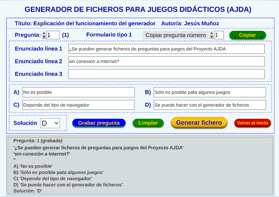 En el siguiente vídeo se muestra un ejemplo completo de generación de un fichero de preguntas a través del generador de ficheros AJDA.