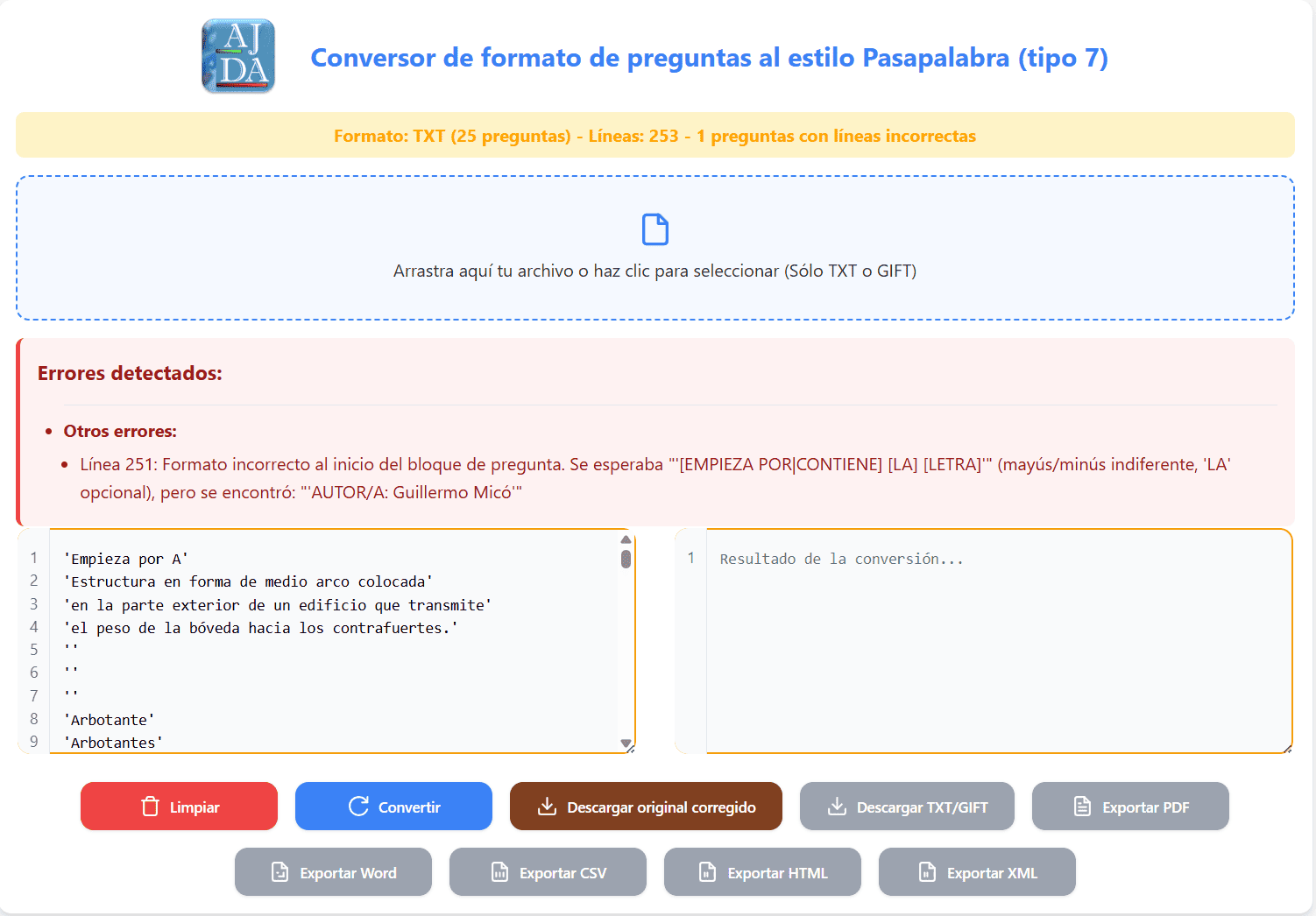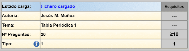 Cuando un fichero se carga, se indican en el panel los siguientes datos: estado de carga, autoría del fichero, nombre del tema de las preguntas, número total de preguntas del archivo y tipo de fichero de preguntas. Además, hay una columna a la derecha que recoge los requisitos que se deben cumplir. Si el fichero que se ha cargado no es correcto, se podrá detectar que los campos aquí comentados no indican valores adecuados.