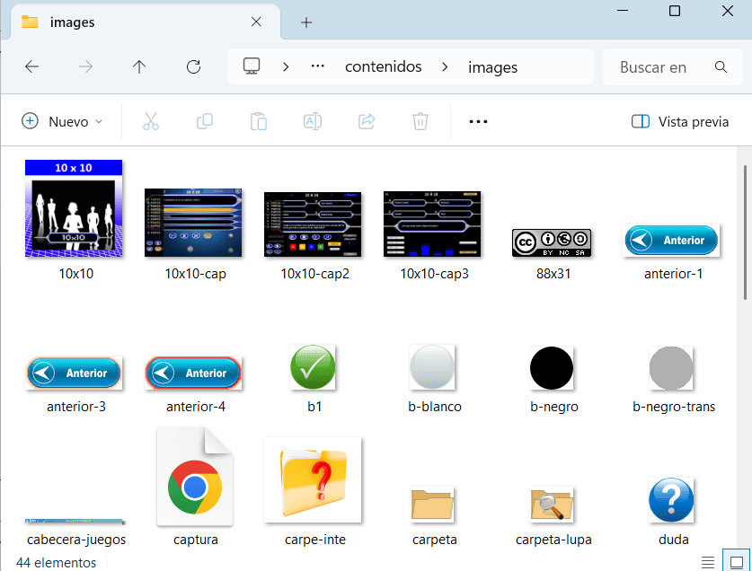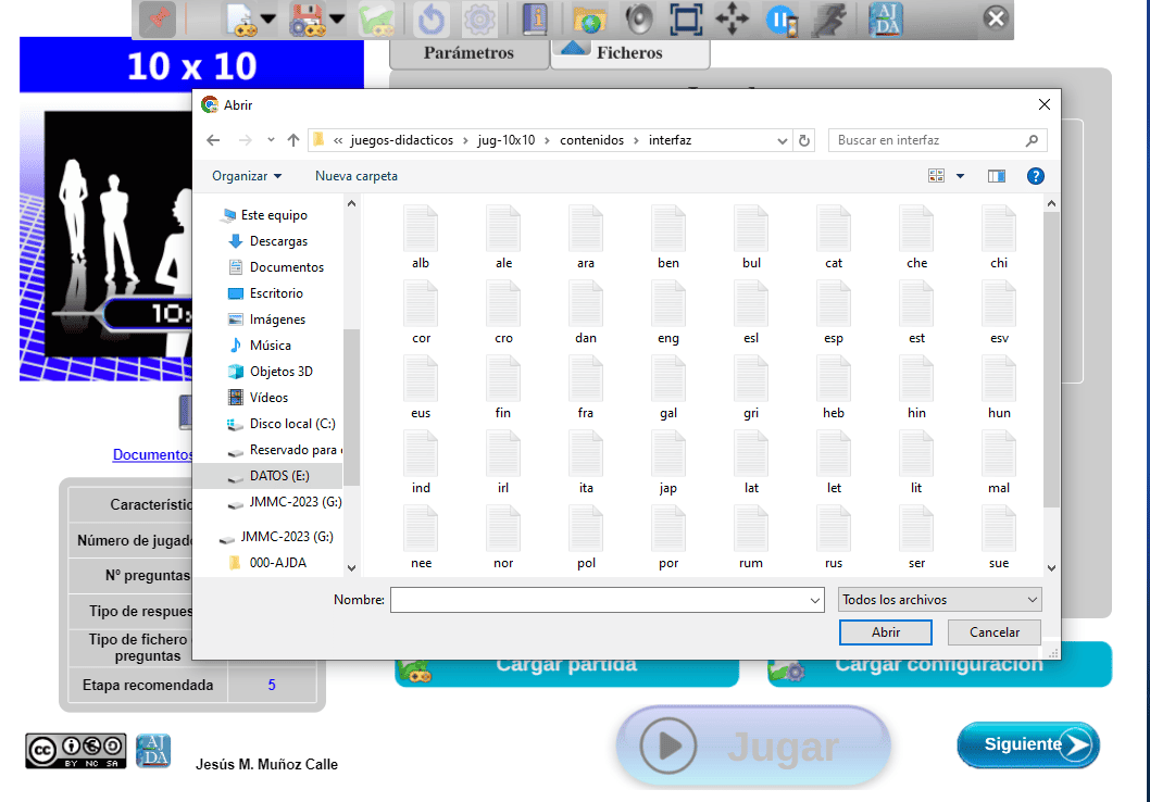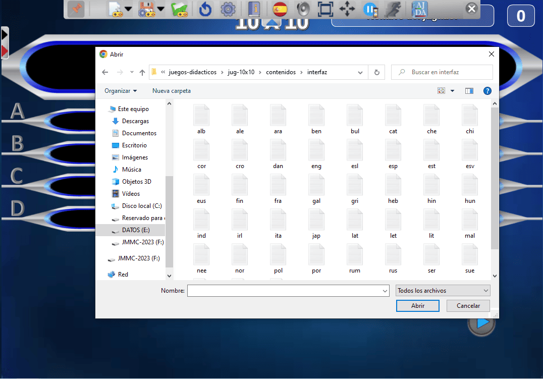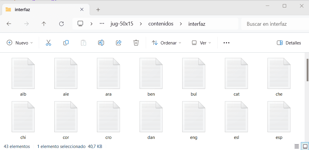 En el explorador se seleccionará el fichero de idioma deseado dentro de la carpeta contenidos/interfaz que hay en cada juego. El menú superior mostrará dicha carpeta para indicar que el idioma ha sido seleccionado de esta forma.
