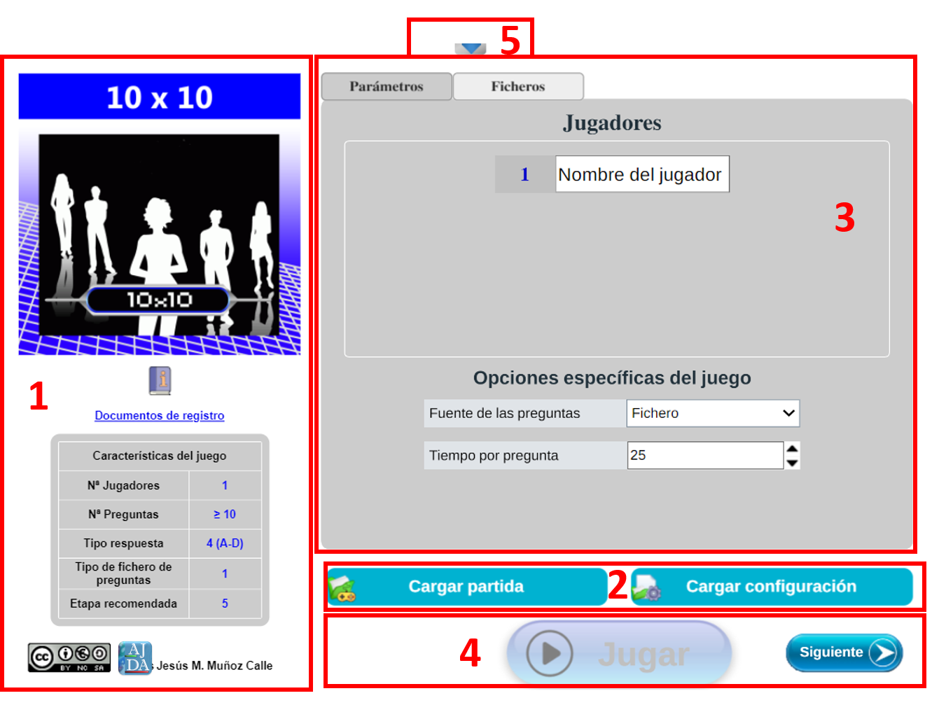 Al acceder a un juego AJDA se muestra su pantalla de configuración inicial que permite ajustar distintos parámetros antes de comenzar una partida. Una vez iniciada esta, se podrá volver a la misma a través del menú superior desplegable y cambiar la configuración de aquellos parámetros compatibles con la mecánica y el momento de desarrollo de la partida. Para su comprensión dividimos esta ventana en 5 zonas.