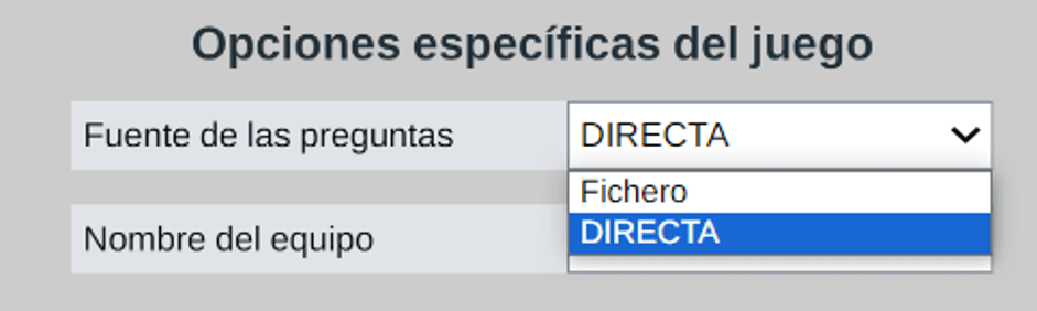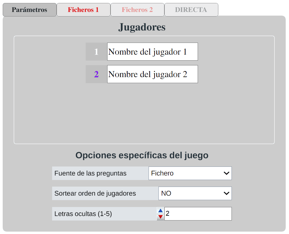 Cuando la selección de la fuente de preguntas sea a través de ficheros o por introducción directa de preguntas al principio de la partida, habrá pestañas superiores de navegación, junto a la de Parámetros, llamadas Ficheros y/o Directa que nos llevarán a la pantalla correspondiente para cargar los datos necesarios en la misma y la partida no podrá comenzar hasta que se hayan introducido, permaneciendo desactivado el control Jugar.