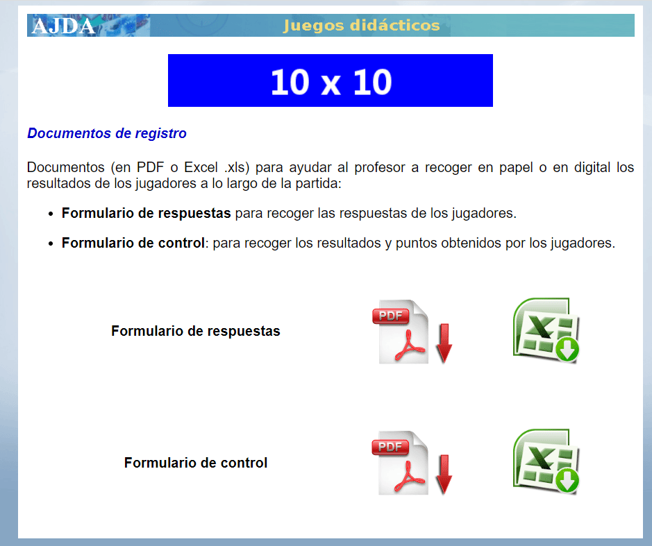 Documentos de registro. En los juegos se han incluido documentos en formato xls y pdf, por si se desean recoger por escrito las respuestas de los participantes y/o las anotaciones, puntuaciones, resultados, etc., que estime oportuno realizar el presentador para el control de las partidas. Su uso es opcional y está supeditado a la dinámica que se desee seguir al utilizar los juegos.