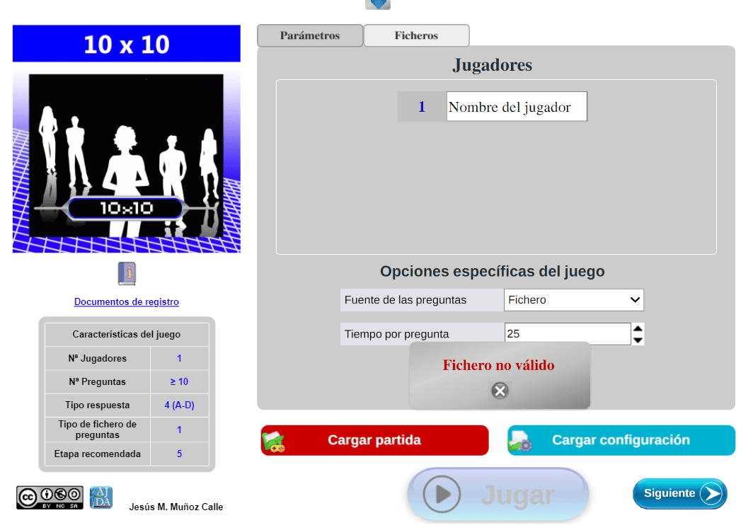 El fichero no ha sido cargado. Se deben revisar los datos y la extensión del fichero y corregirlos o cargar otro archivo. No se puede empezar a jugar.