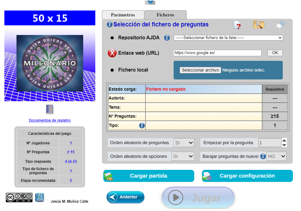Los juegos que admiten este tipo de fuente presentan una pestaña en el menú de configuración de parámetros por cada fichero de preguntas que deba ser cargado. La mayoría de los juegos necesitan subir un solo fichero, pero hay algunos que necesitan dos o más, como el de la siguiente imagen.