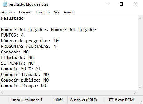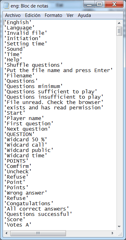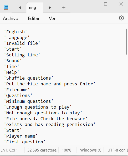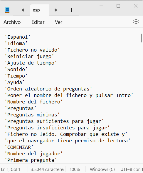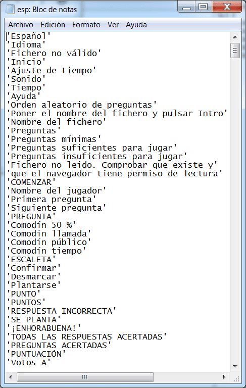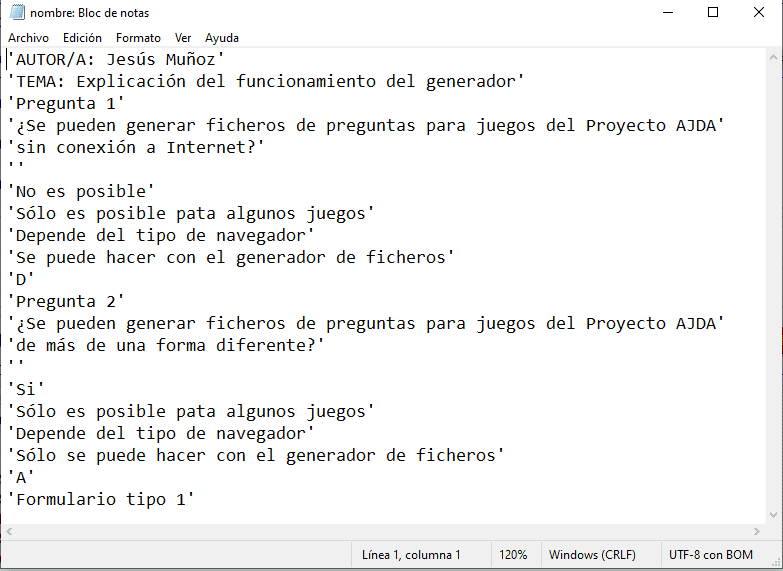 Cualesquiera de los ficheros de texto de contenidos de los juegos AJDA pueden ser visualizados y modificados utilizando un editor de textos como Bloc de notas, Notepad++, Wordpad, Google Docs, Open Office, Phoenix Code, Sublime Text, etc. Para ello, basta abrir el fichero con el editor de textos. Por ejemplo, con el bloc de notas y presentará el siguiente aspecto: