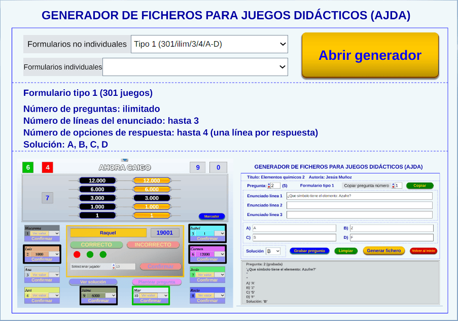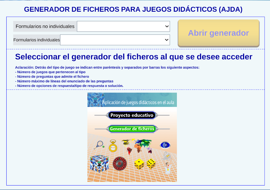 Abrir ventana del generador de ficheros. El generador de ficheros permite crear archivos para los distintos tipos de juegos AJDA. Si se quiere construir un fichero de preguntas nuevo, esta es la herramienta.