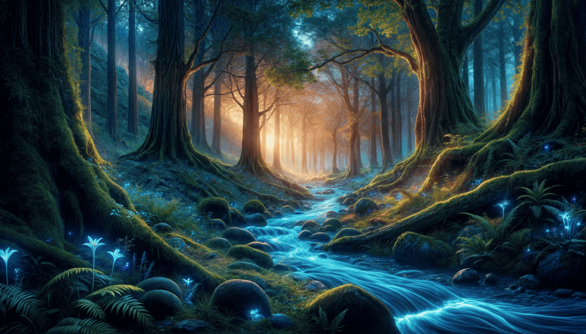 Uno de los más famosos es el Río de las Luces Místicas, que brilla en tonos cambiantes desde el alba hasta el anochecer. Sus aguas reflejan los colores del cielo y al anochecer adquieren un brillo propio, como si fueran estrellas líquidas. Se dice que aquellos que navegan sus corrientes reciben visiones del pasado o el futuro, y que sus aguas pueden restaurar la energía mágica de los hechiceros. También dicen que muchos navegan por sus aguas y nunca regresan.