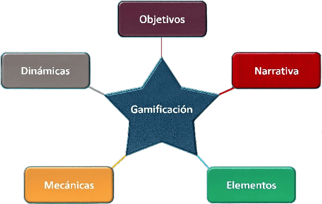 En la siguiente imagen se presenta un esquema que muestra los cinco aspectos clave de las metodologías de Gamificación que consideraremos y a continuación trataremos brevemente sobre cada uno de ellos.